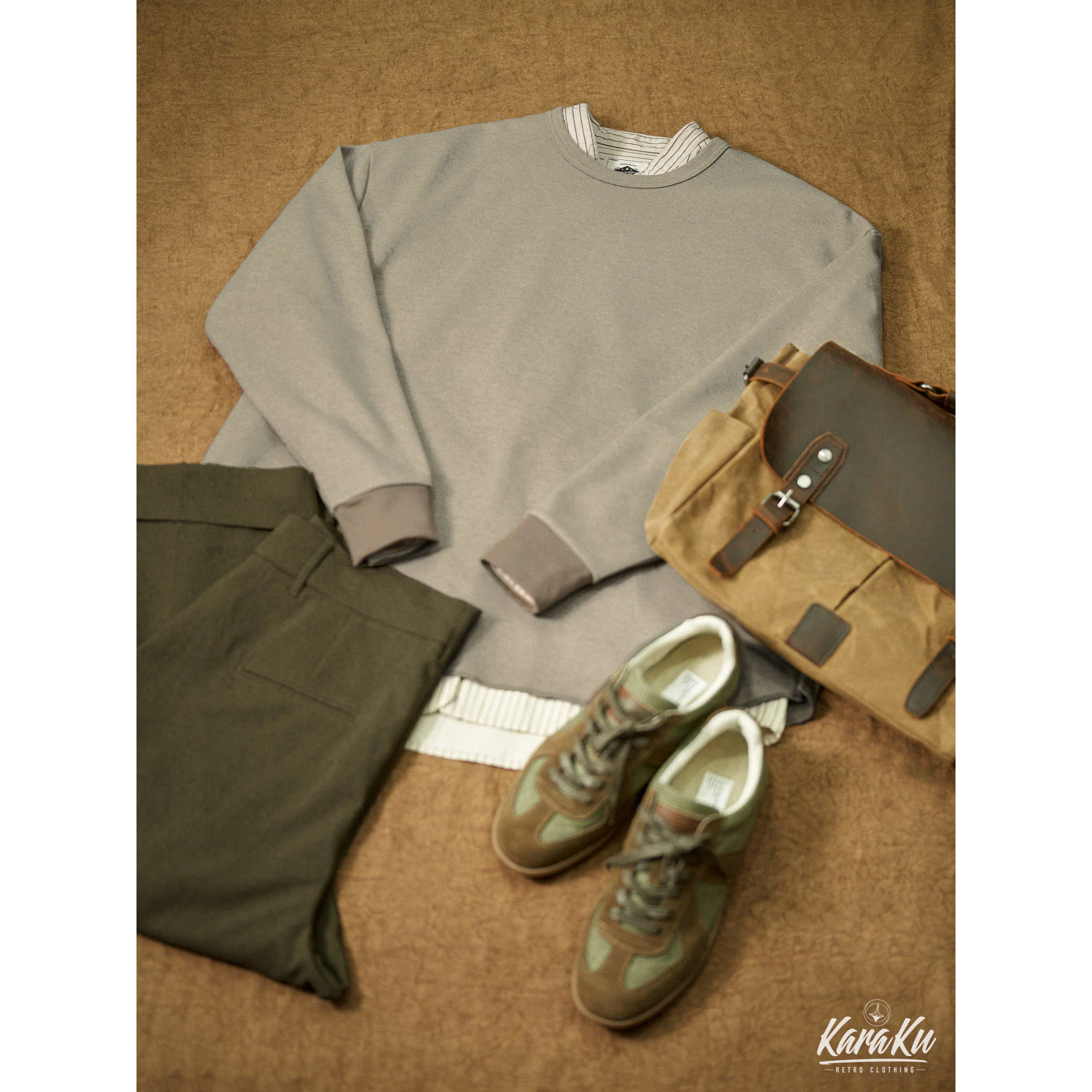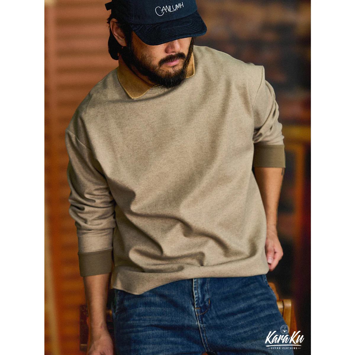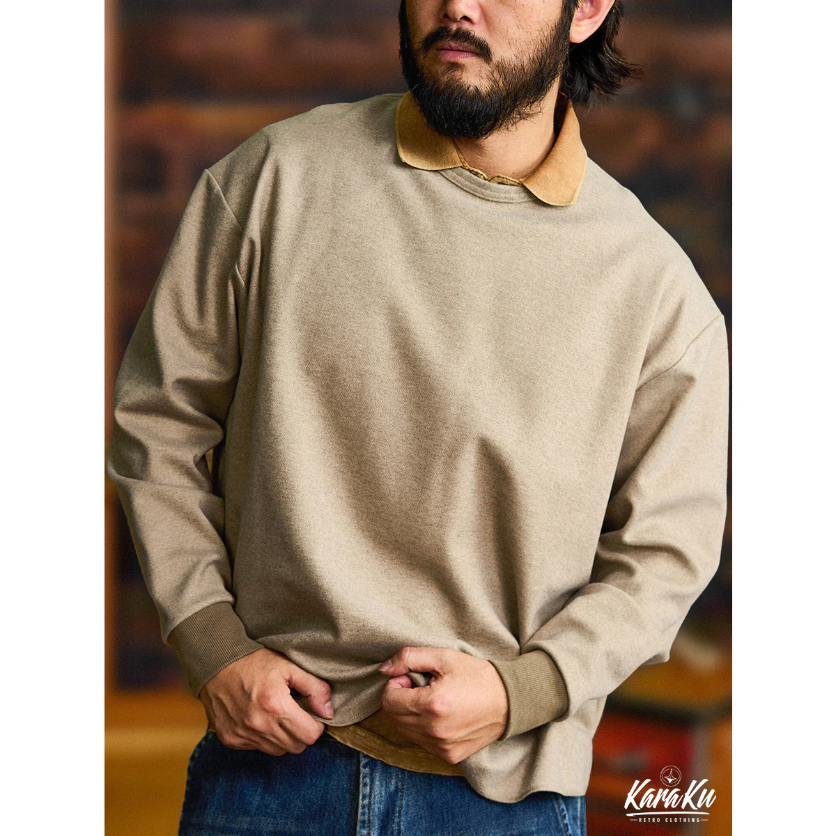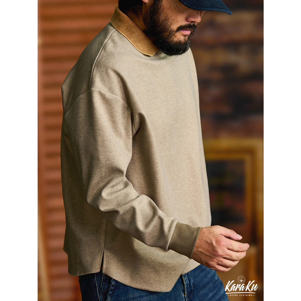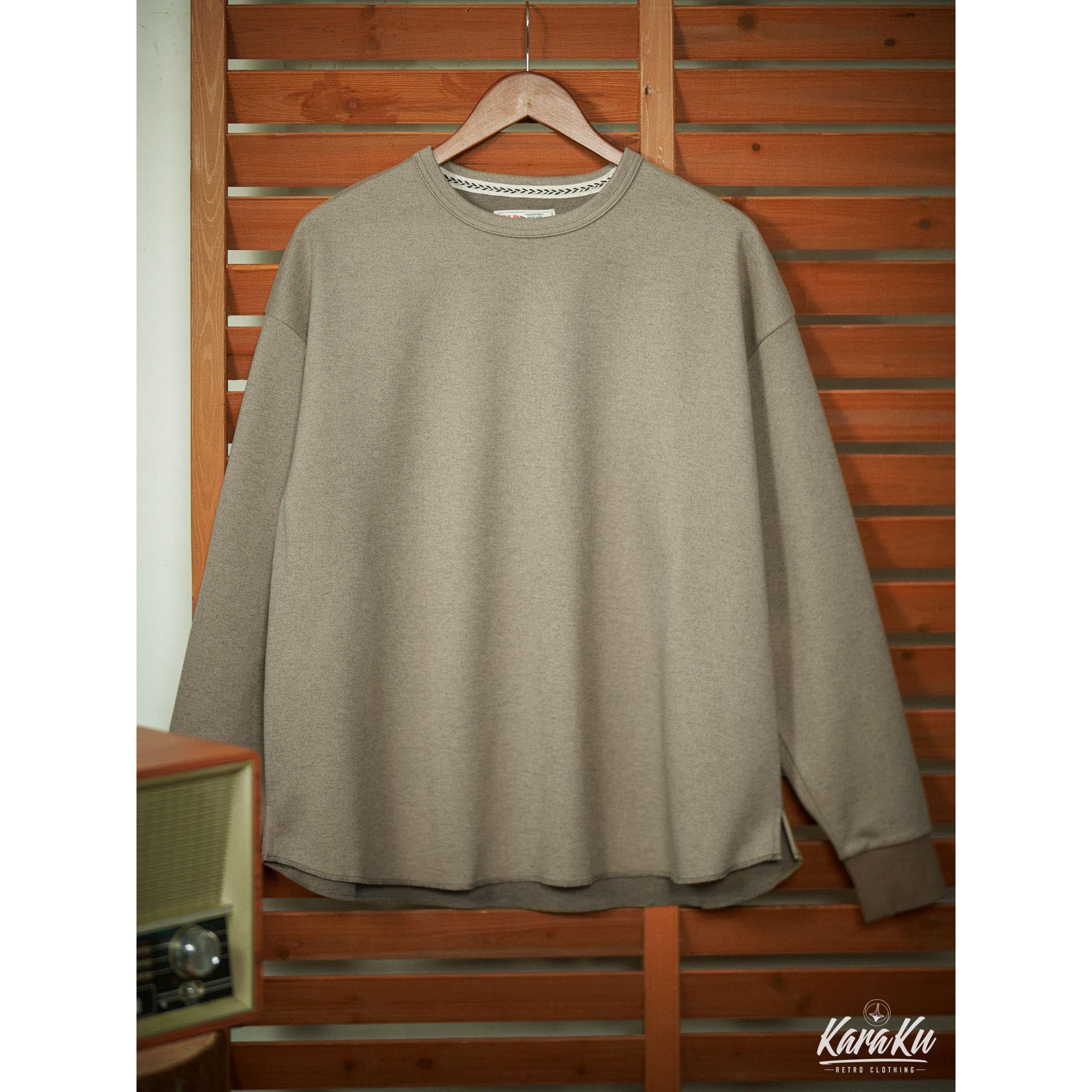 本アイテム首元にダブルステッチ縫われた、襟と袖口のリブ、裾のカット仕様などがスポーティーな印象を引き立てる。袖口の配色切替はアクセントに。ゆとりのあるレギュラーフィットのシルエットが動かしやすく、抜け感をプラスした若干肩が落ちたデザインなどシンプルながらも拘りのディテールを取り入れている。シワになりにくいマットな質感のポリエステル生地をメイン使用し、光沢感も抑え、スタイリッシュな印象に。表面に削りをかけて微起毛させたサンディング加工をしたので、心地よい風合いとヴィンテージ感のある素材に仕上げた。ウールのような起毛感や暖かさを持ちながら、手軽に洗えるイージーケア性も備えています。