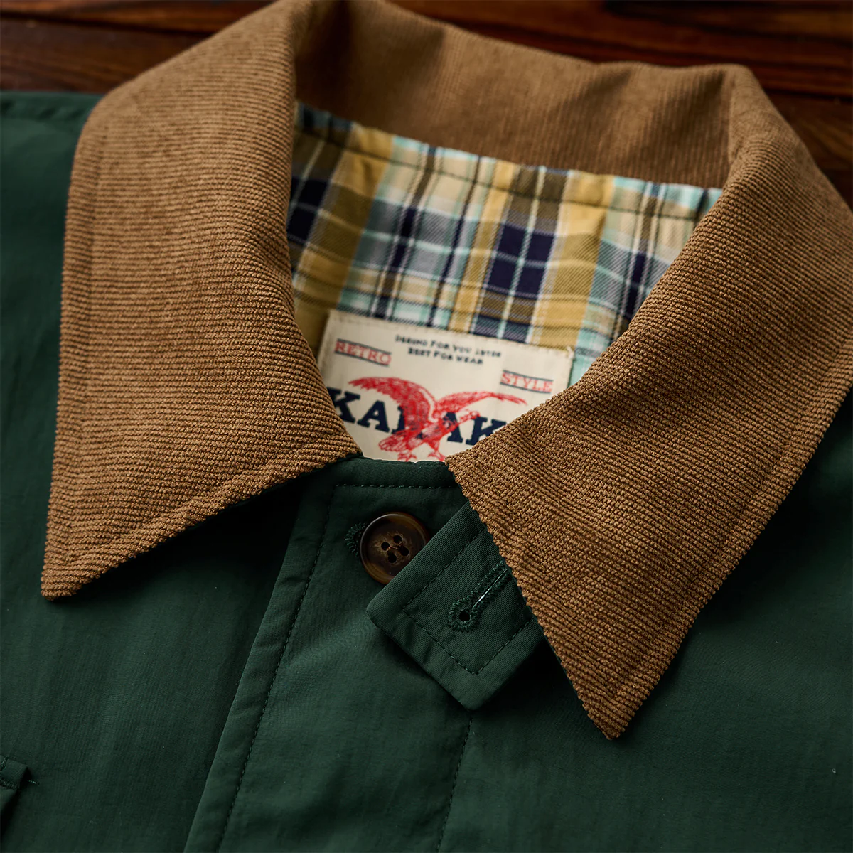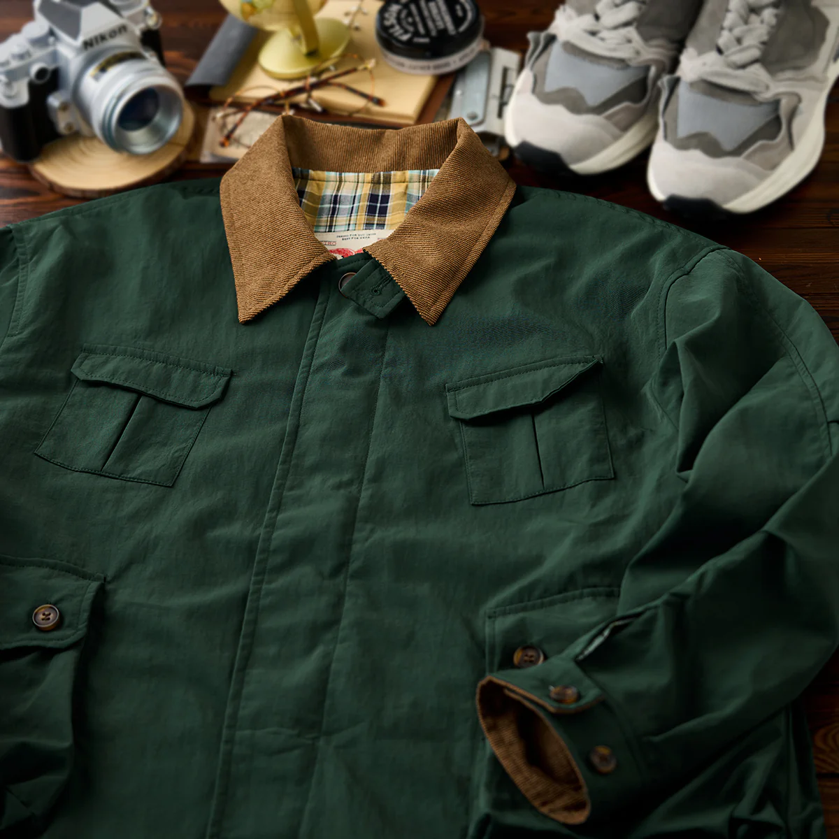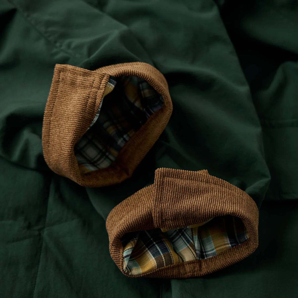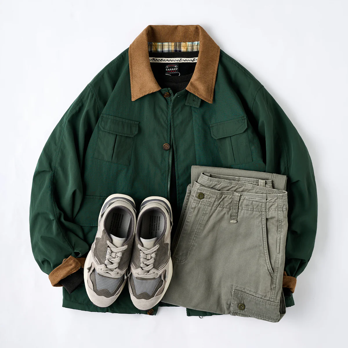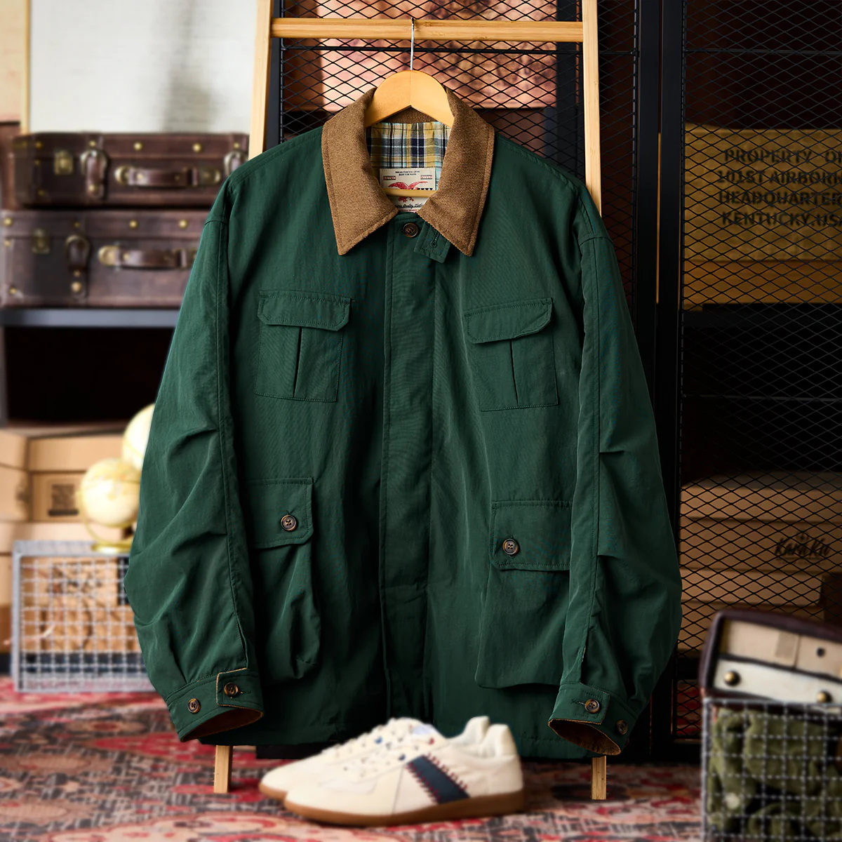 本アイテムはベースは明るいベージュと発色の良いグリーンですが、襟がブラウンで切り替えられているのが特徴。襟と袖裏のカラーを揃えることで統一感を生み出し、コーデュロイ生地を使用し、洒脱なムードにまとめているのがこの着こなしのポイント。フロントは重厚なダブルジップとスナップボタンの仕様。袖口はボタン付きの為、大きめに着ても手首でちゃんと止まってくれる仕様なので安心して着用出来る。サイドだけでなくフロントにもポケットがあり、使い勝手も良く。裾部分には、ドローコードが付いているので調節も可能。裏地は伝統的なタータンチェック、スコットランドのハイランド地方で発達した特徴のある格子柄のこと。 スコットランド民族衣装に使用されてきた。全体的にはややルーズなシルエットで、古着等でも人気のハンティングジャケット風に仕上げ。