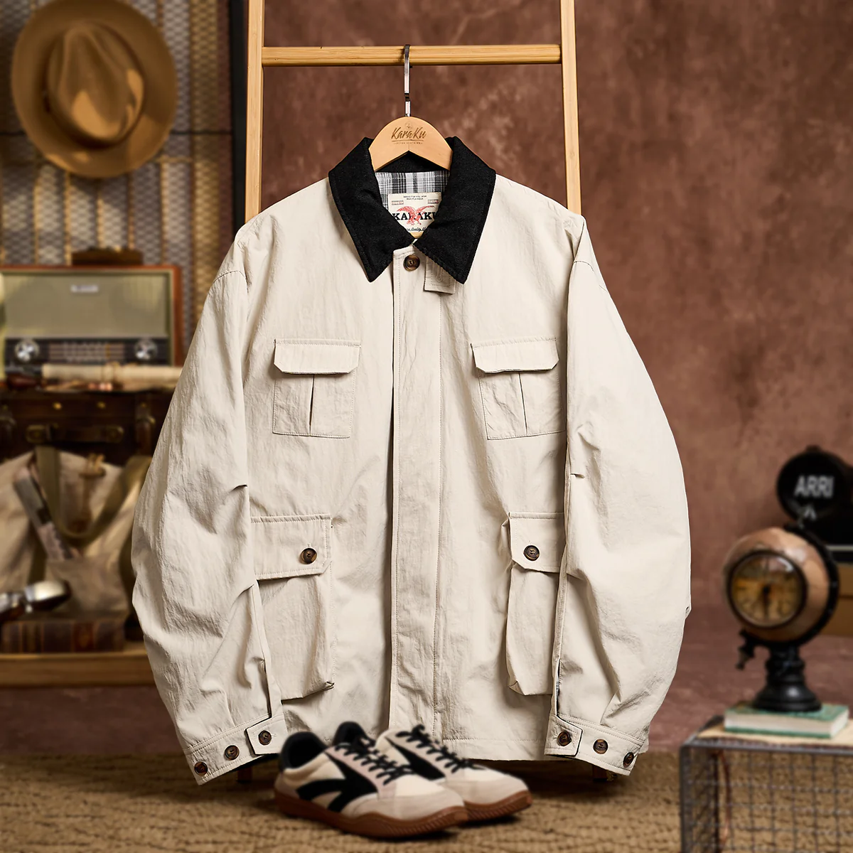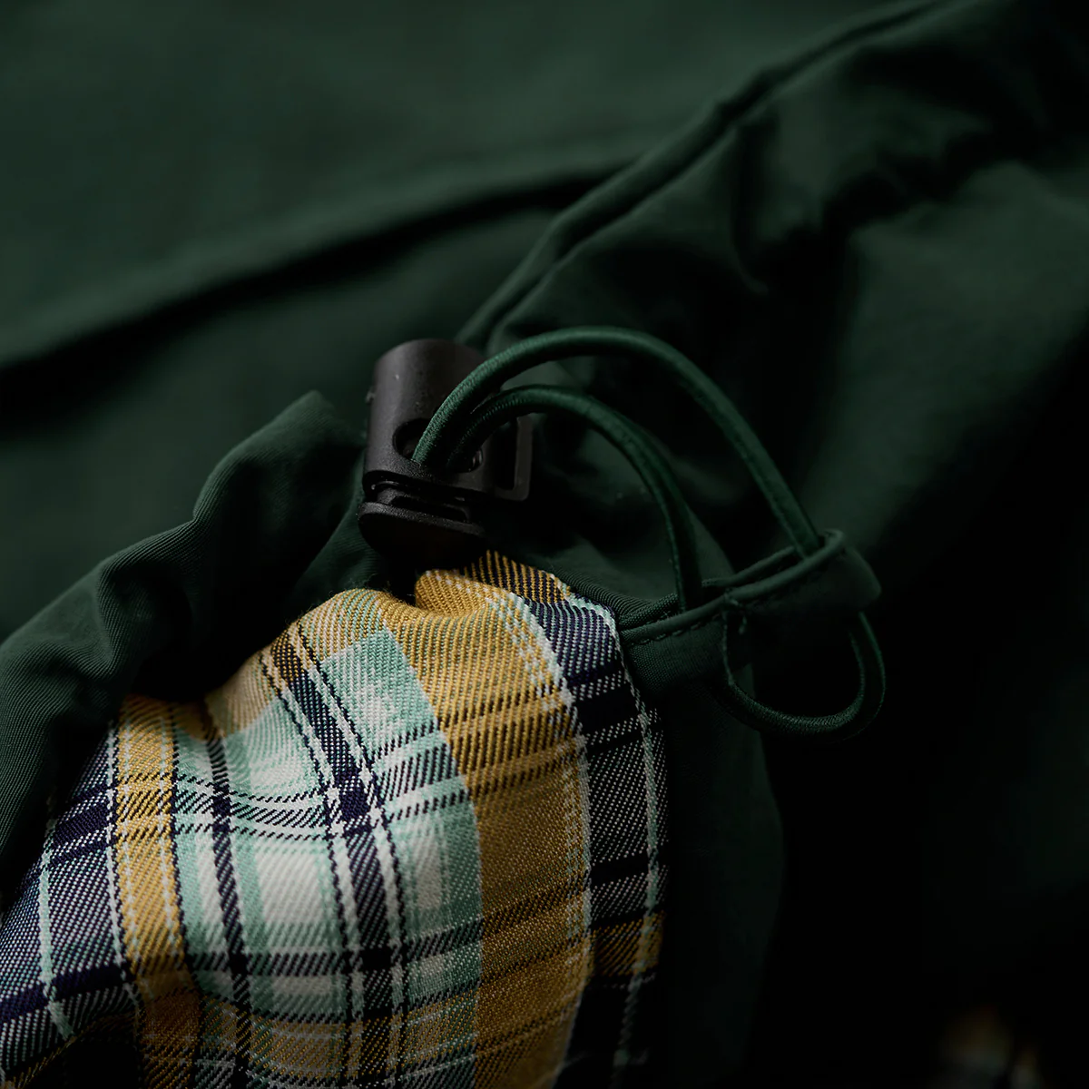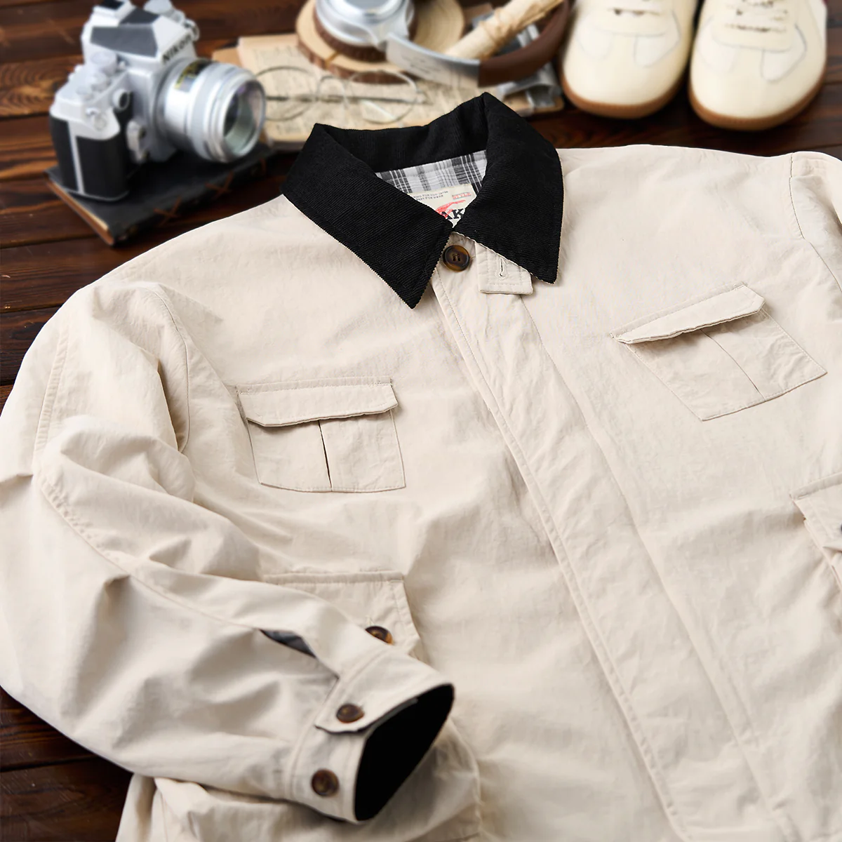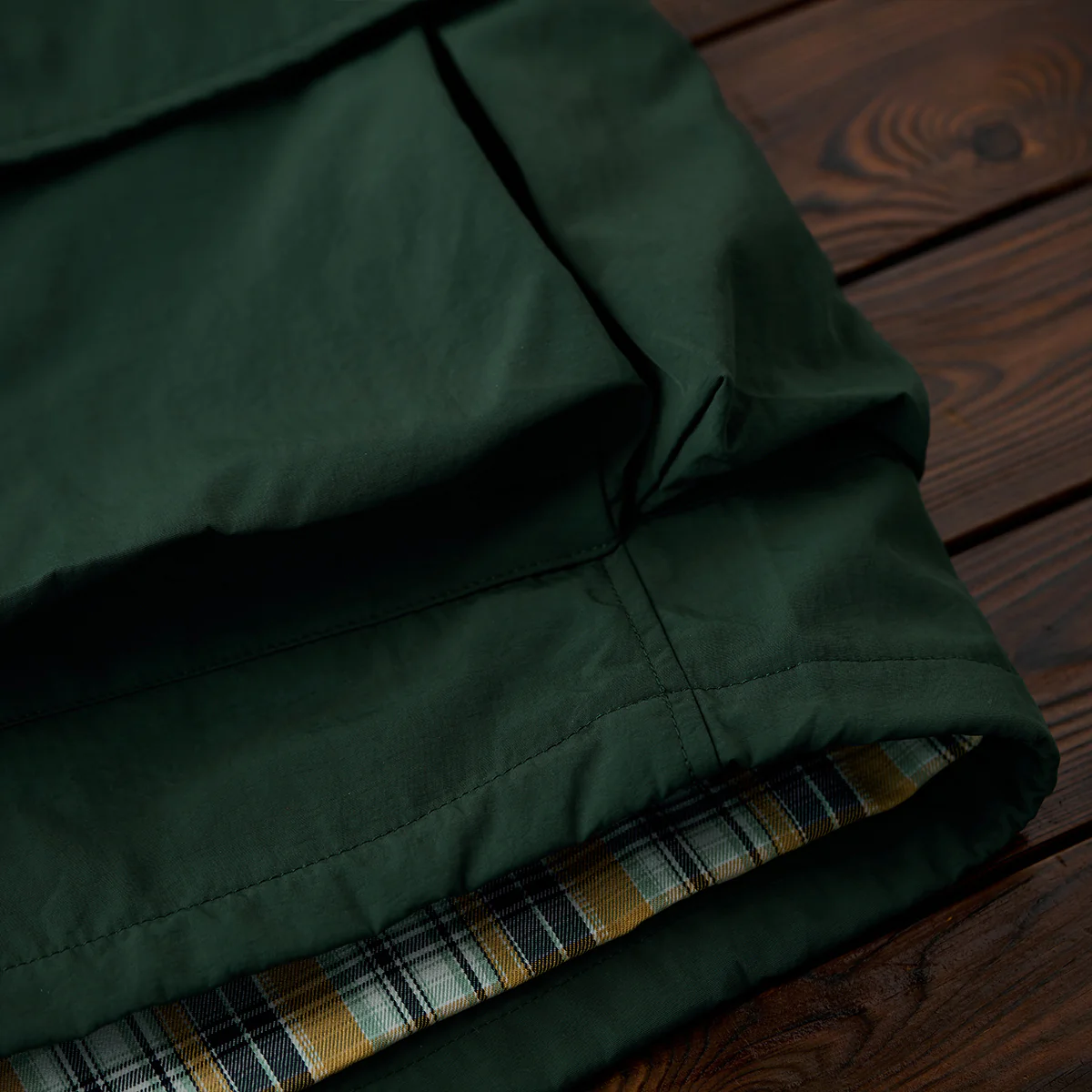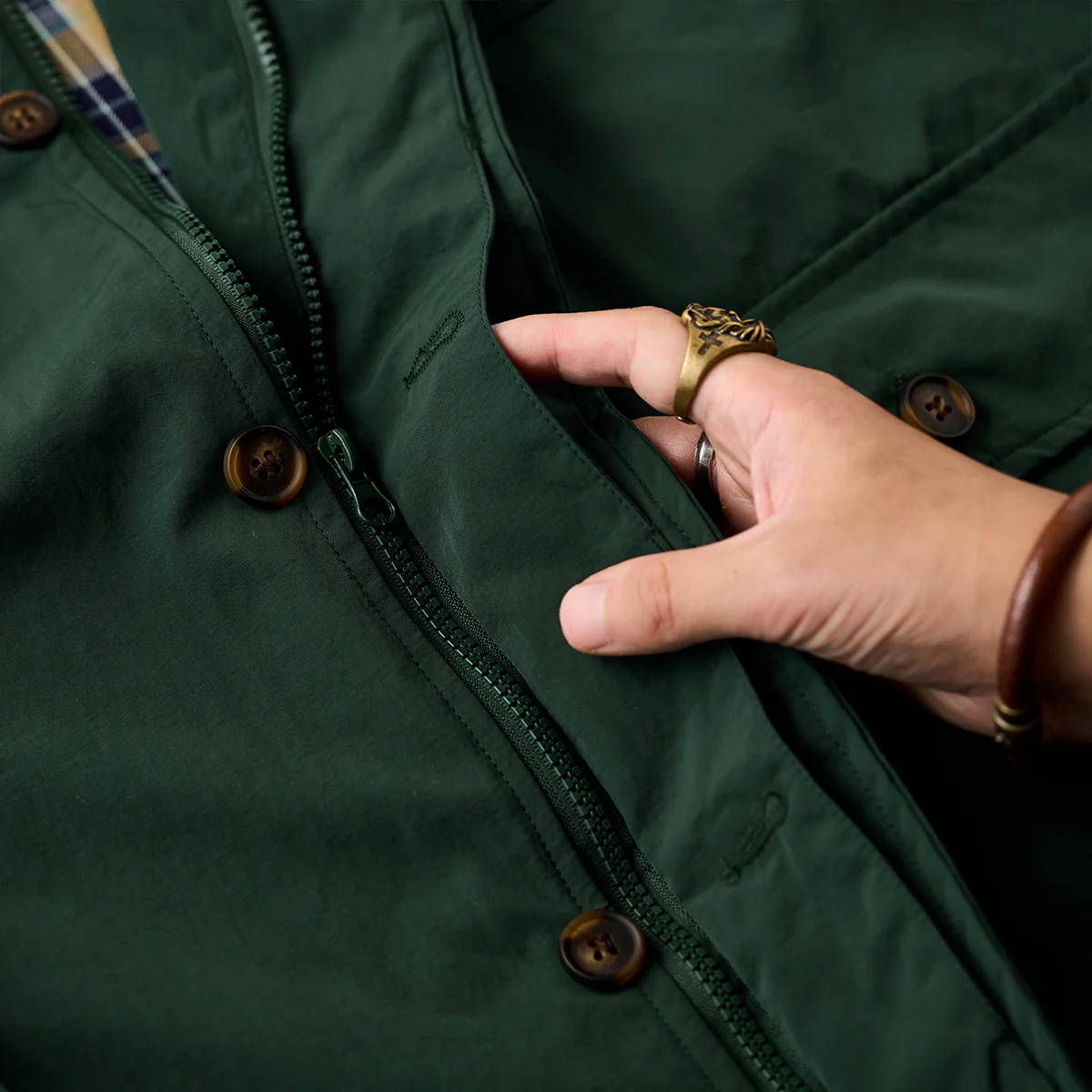 本アイテムはベースは明るいベージュと発色の良いグリーンですが、襟がブラウンで切り替えられているのが特徴。襟と袖裏のカラーを揃えることで統一感を生み出し、コーデュロイ生地を使用し、洒脱なムードにまとめているのがこの着こなしのポイント。フロントは重厚なダブルジップとスナップボタンの仕様。袖口はボタン付きの為、大きめに着ても手首でちゃんと止まってくれる仕様なので安心して着用出来る。サイドだけでなくフロントにもポケットがあり、使い勝手も良く。裾部分には、ドローコードが付いているので調節も可能。裏地は伝統的なタータンチェック、スコットランドのハイランド地方で発達した特徴のある格子柄のこと。 スコットランド民族衣装に使用されてきた。全体的にはややルーズなシルエットで、古着等でも人気のハンティングジャケット風に仕上げ。