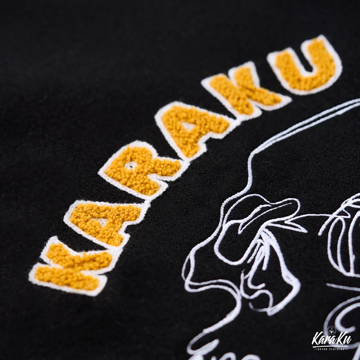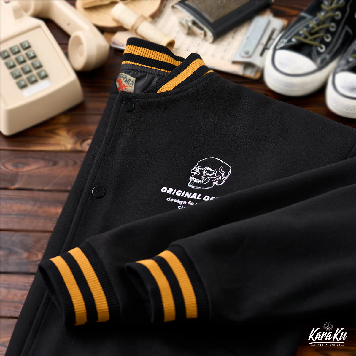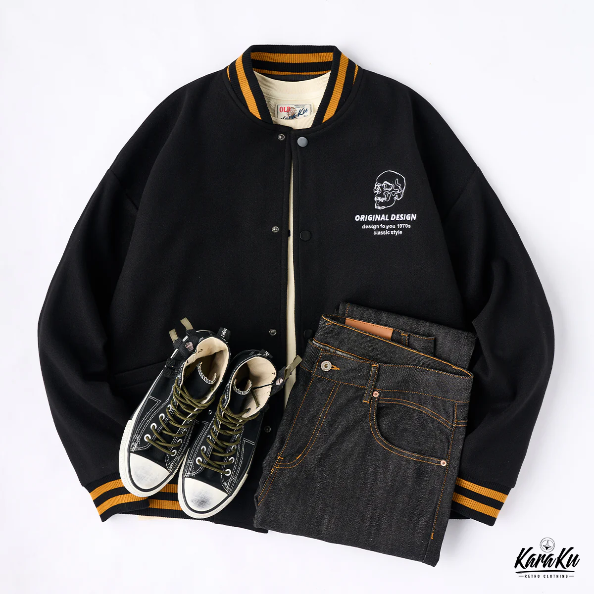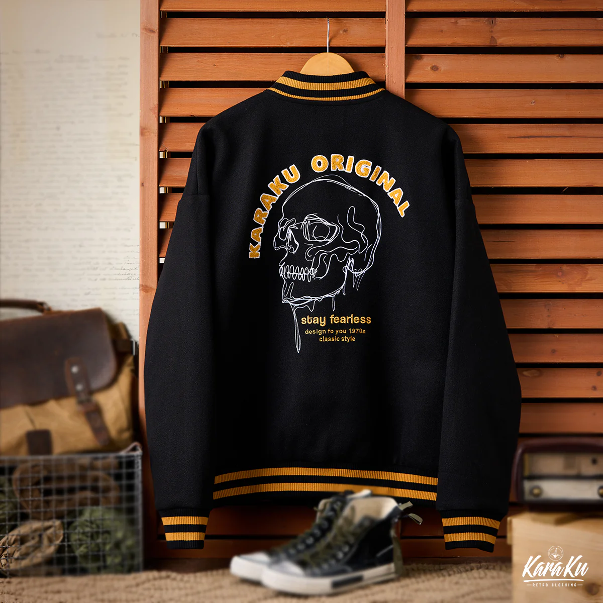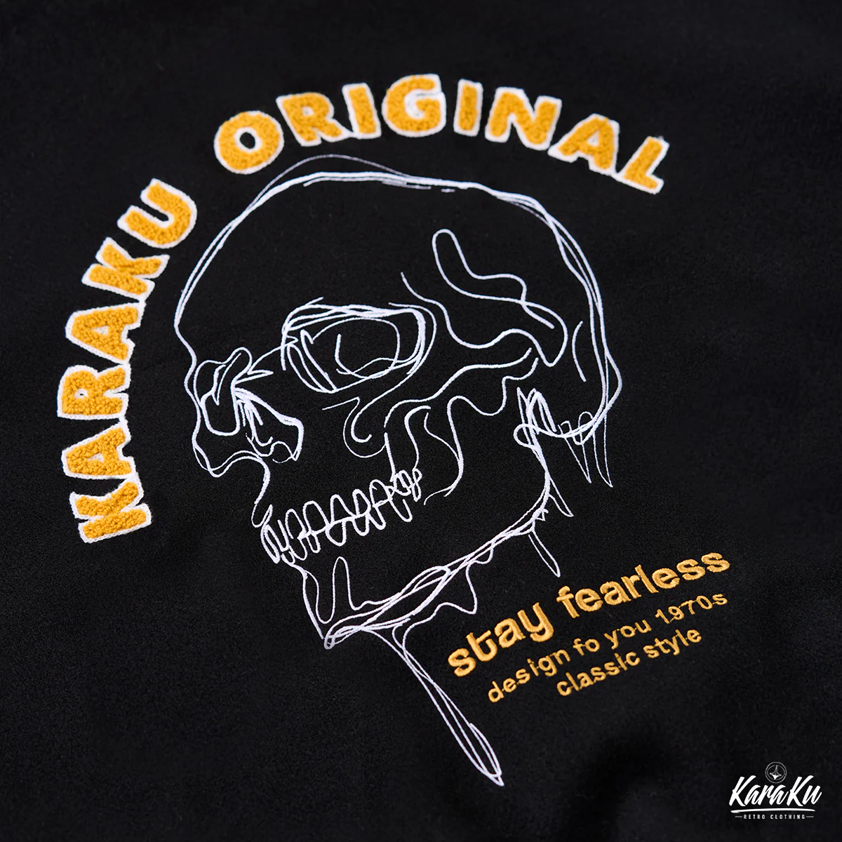 上部には「KARAKU ORIGINAL」と書かれ、ブランド名や独自性をアピールしています。下部には「stay fearless」とのスローガンがあり、恐れを持たないスタイルや態度を表現。