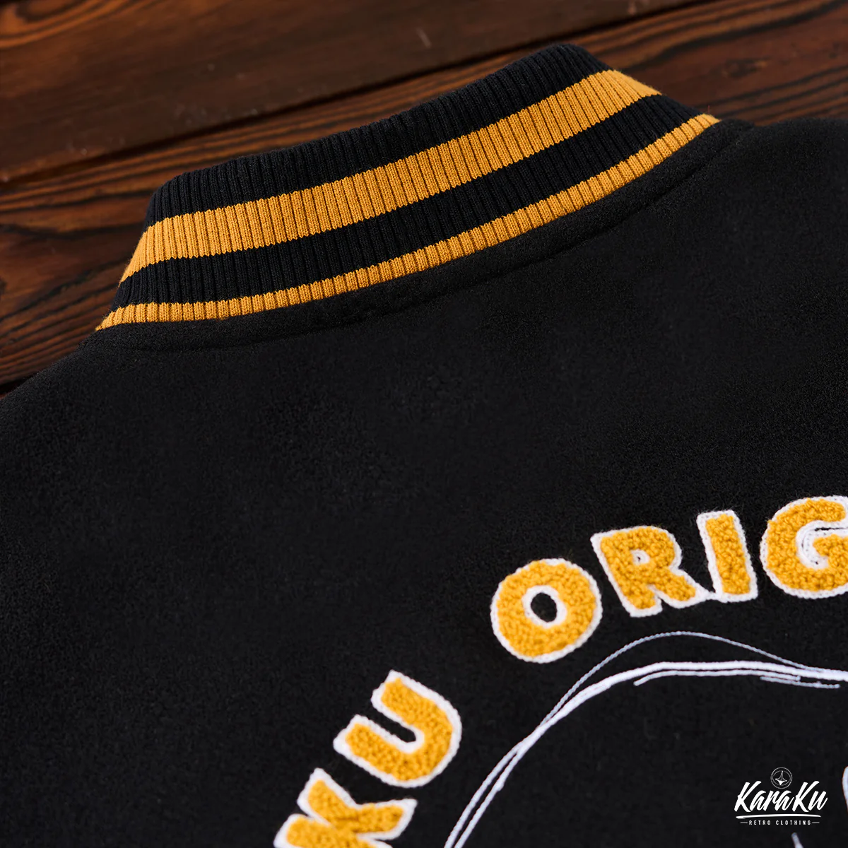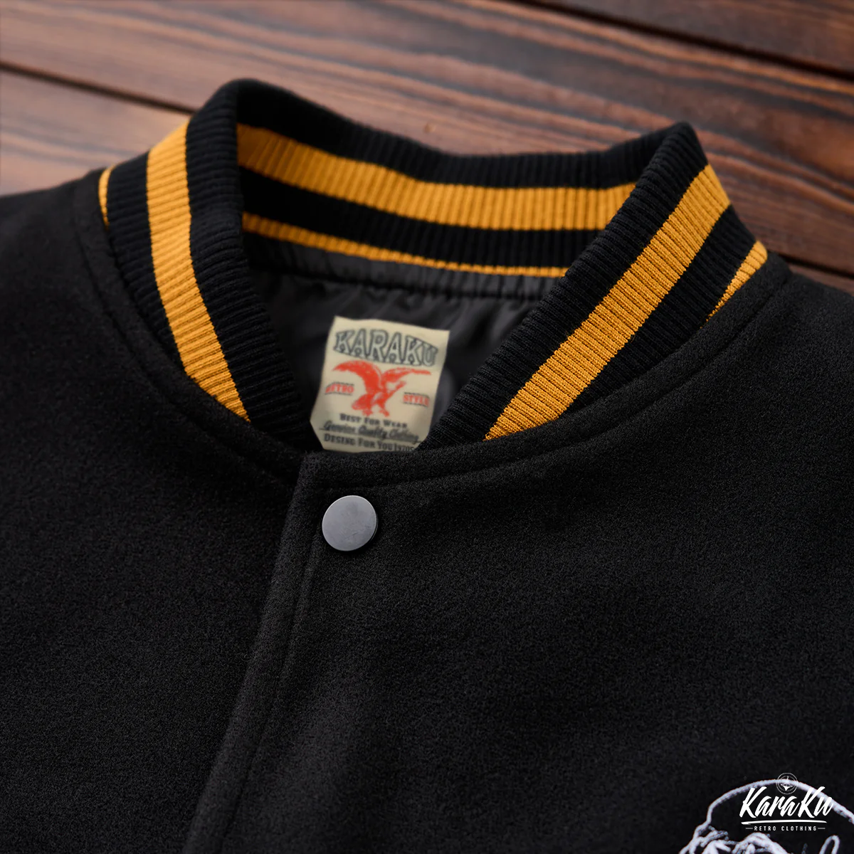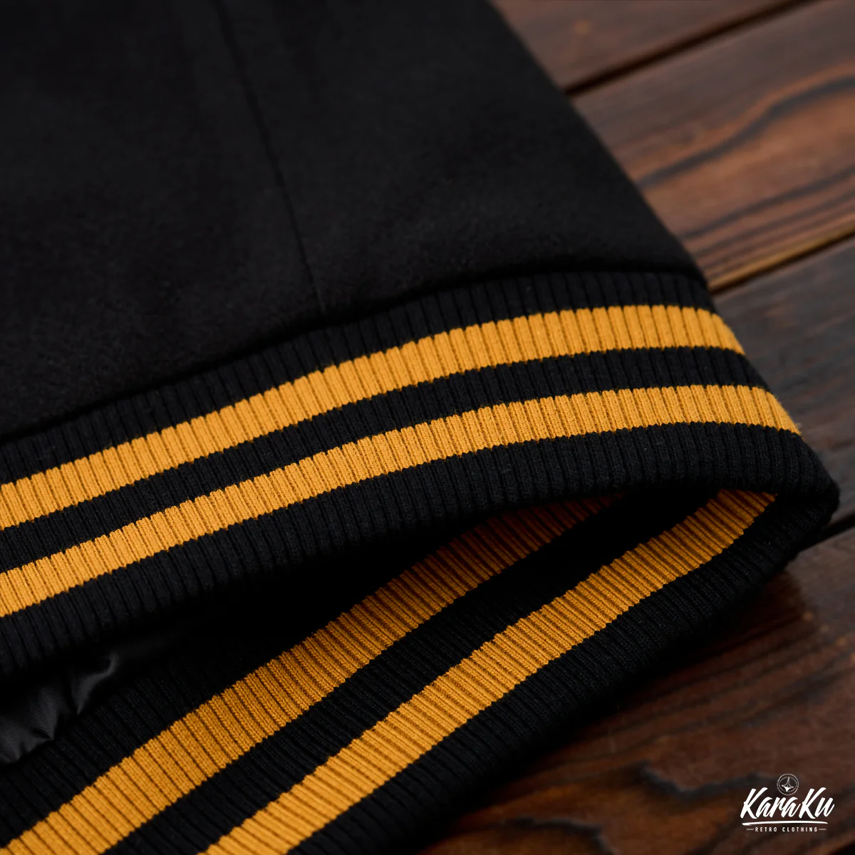 襟元や袖口のストライプはオレンジと黒の配色が使われており、アクセントとしてヴィンテージ感を強調している。