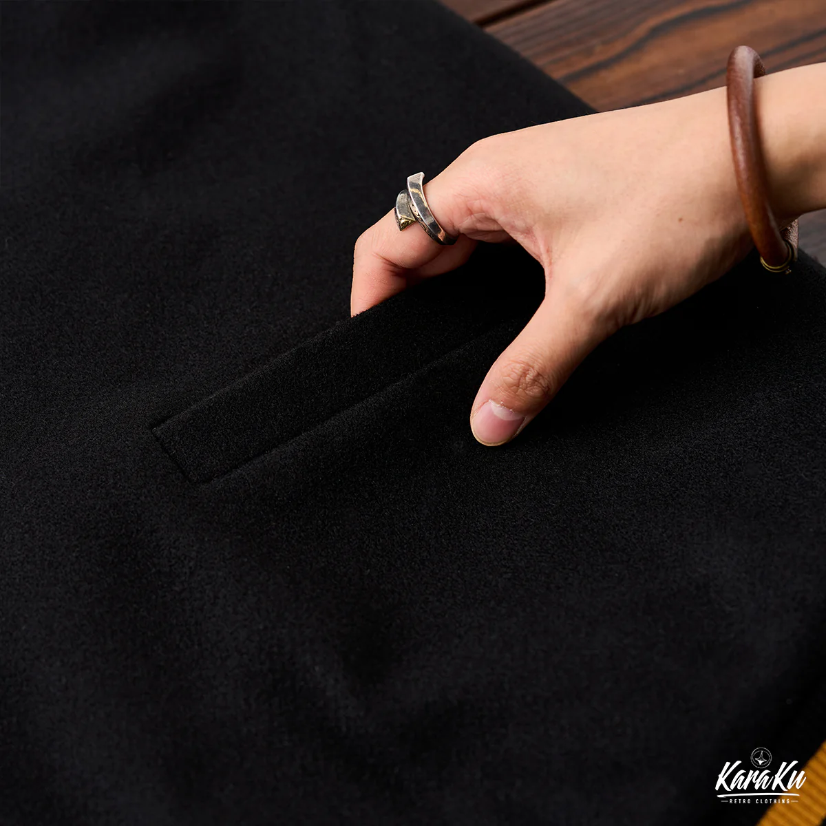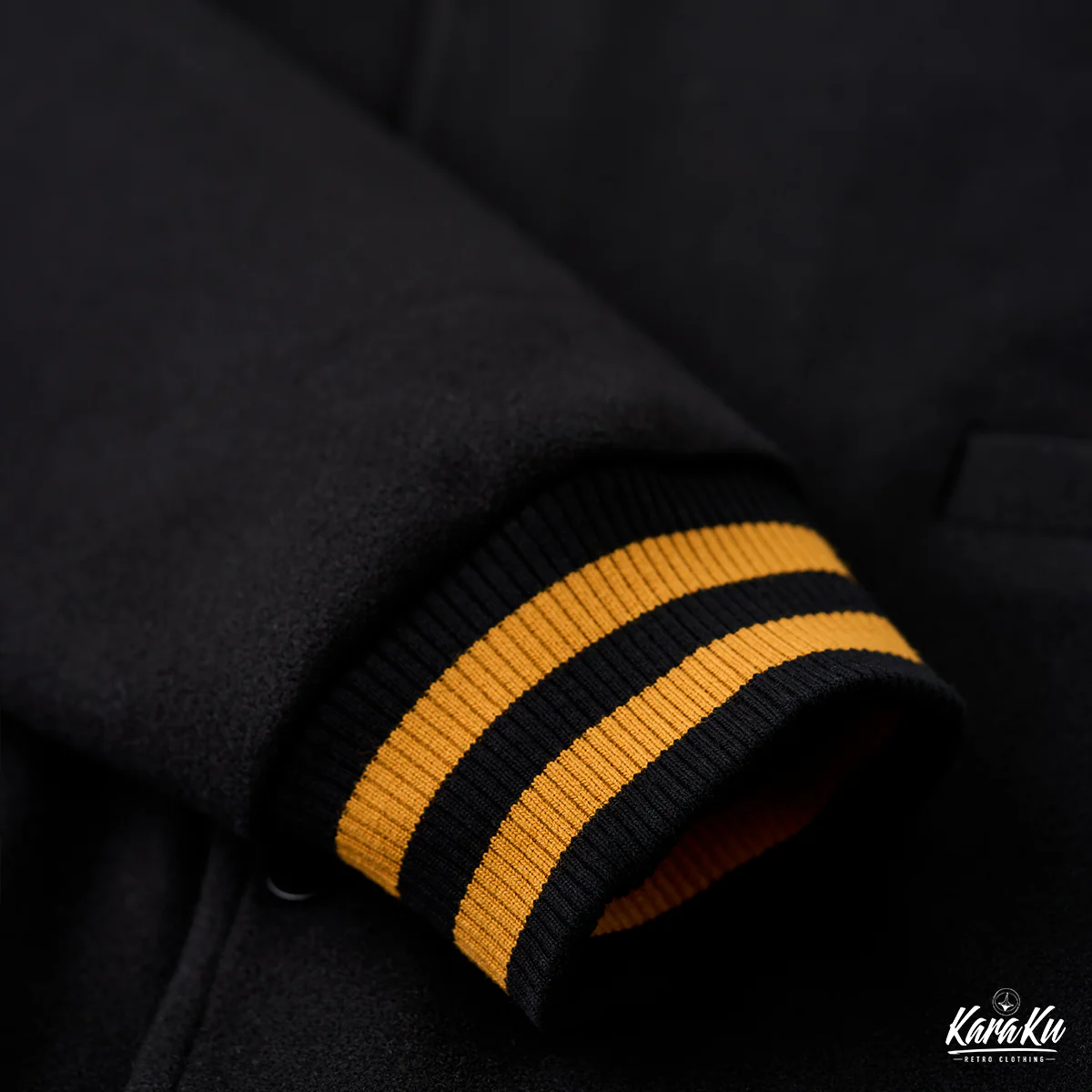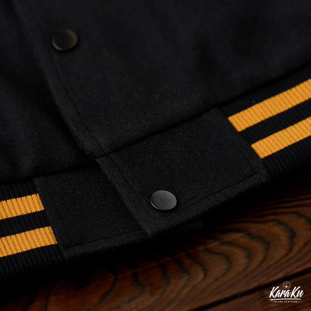 襟元や袖口のストライプはオレンジと黒の配色が使われており、アクセントとしてヴィンテージ感を強調している。