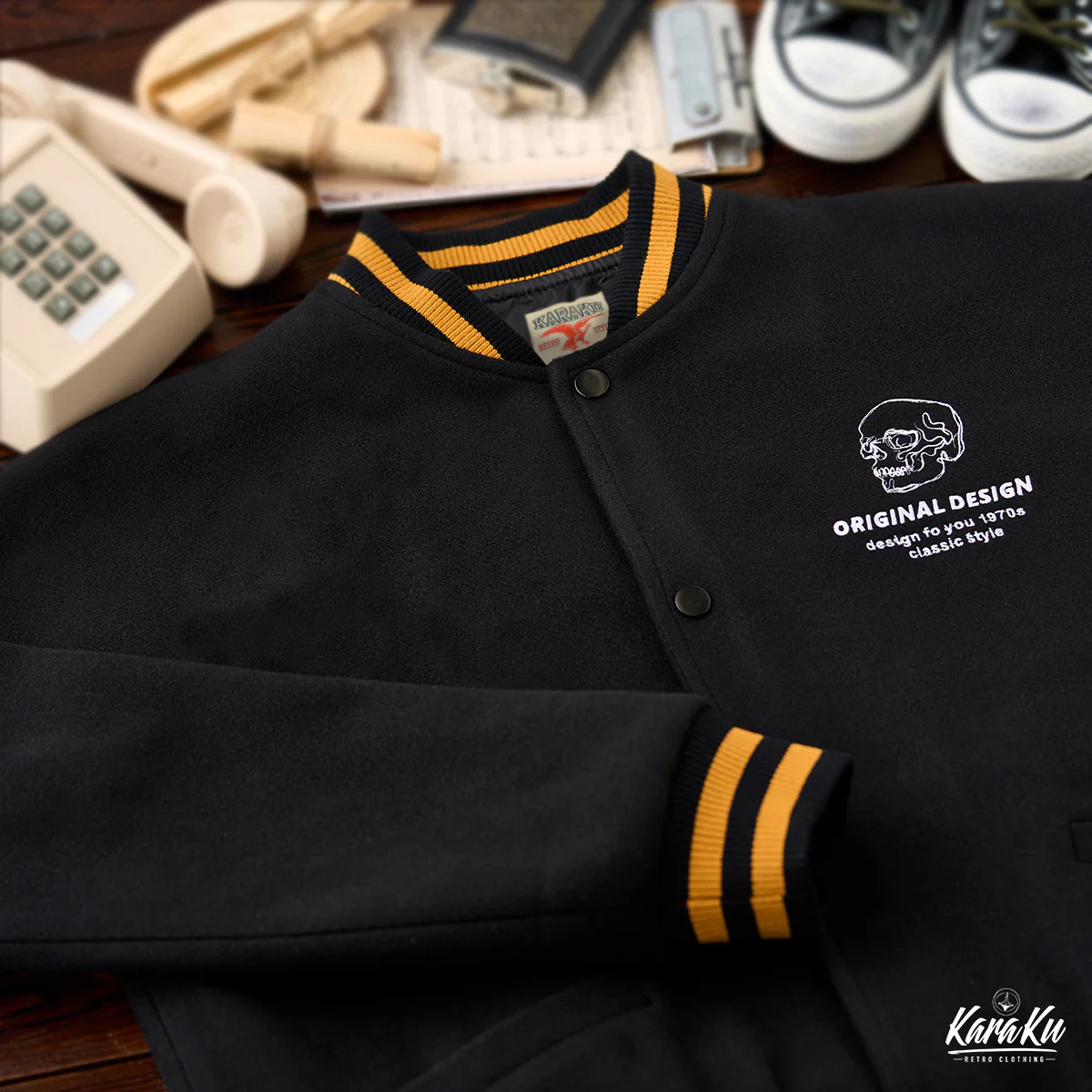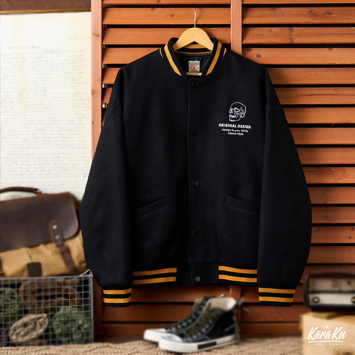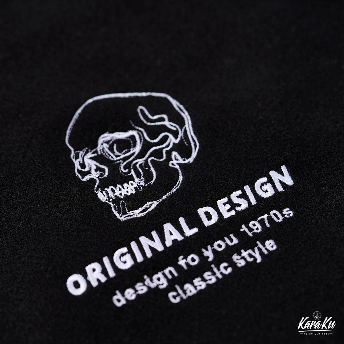 胸の部分には、小さな髑髏とともに「ORIGINAL DESIGN」「design for you 1970s classic style」の文字が配置されて、後ろの大きなデザインを補完する形だ。