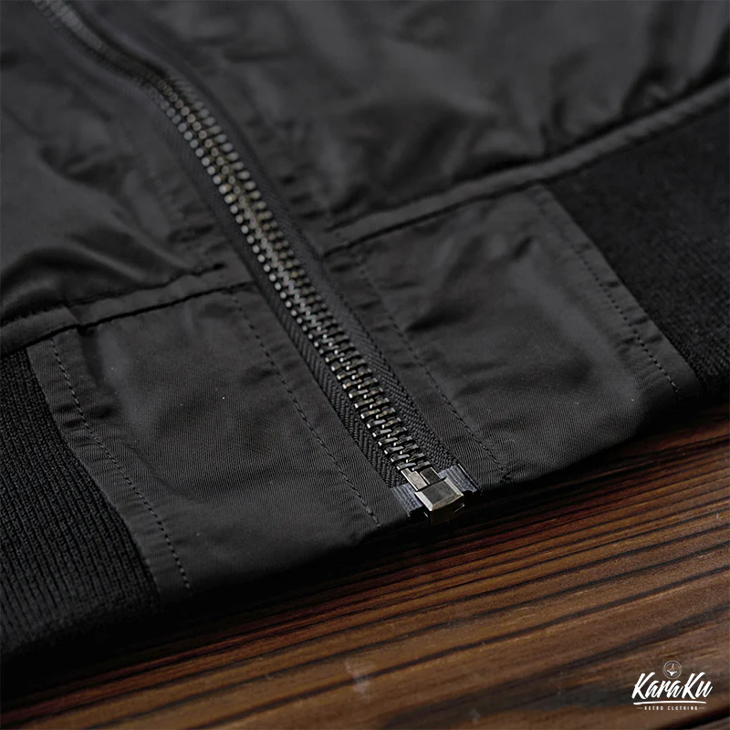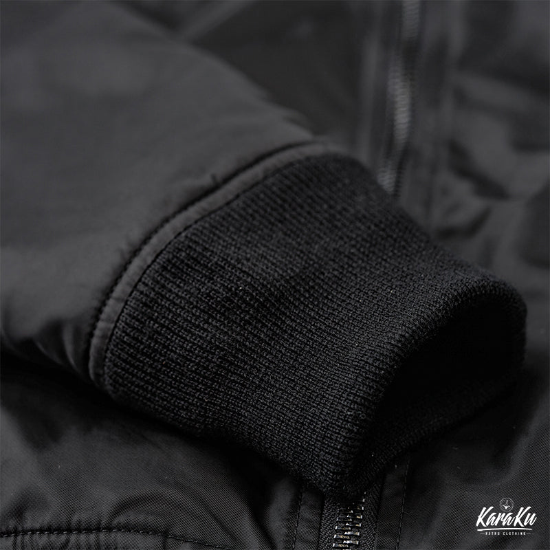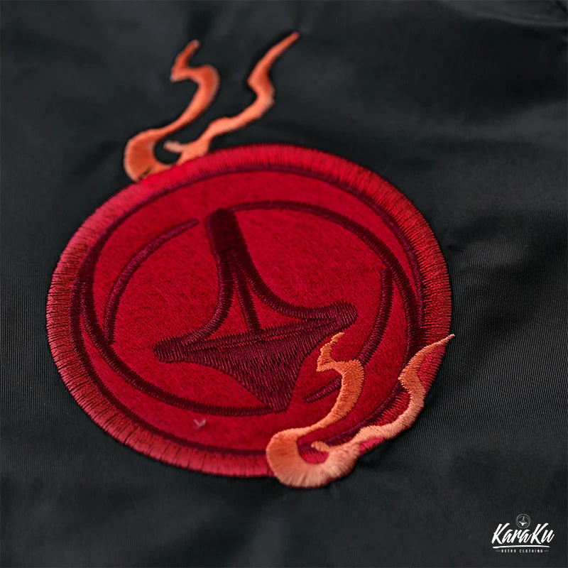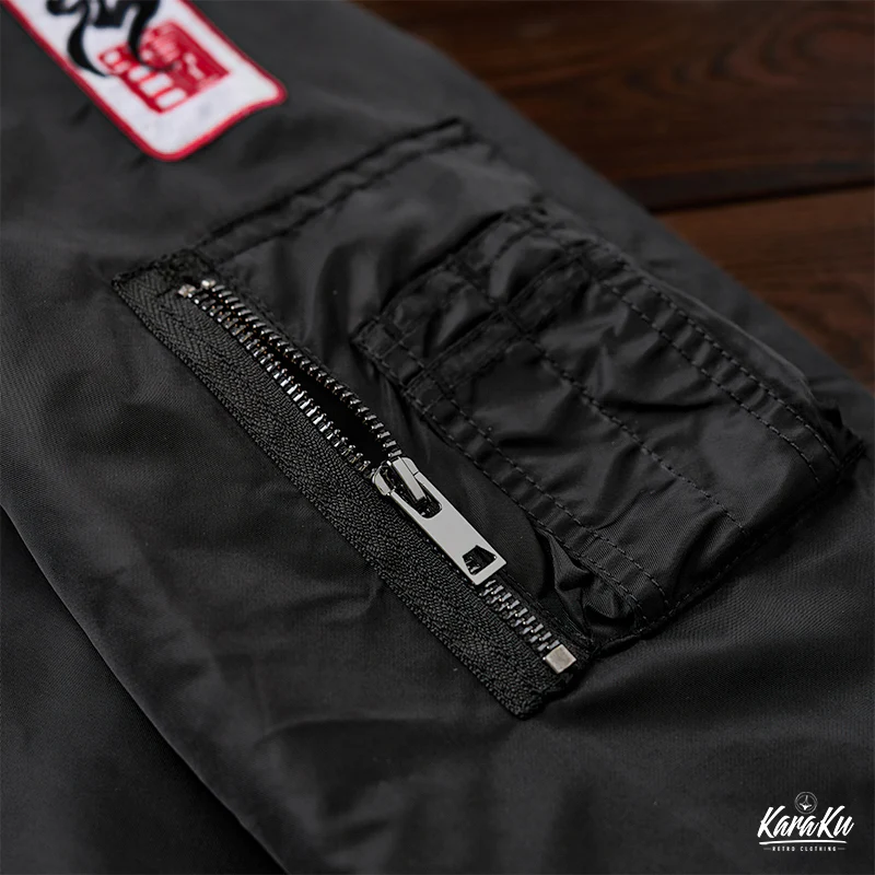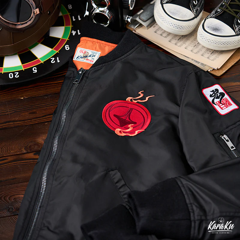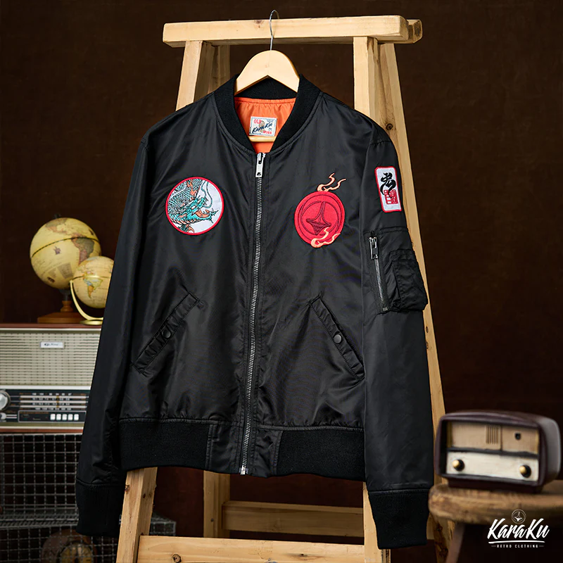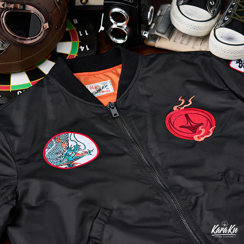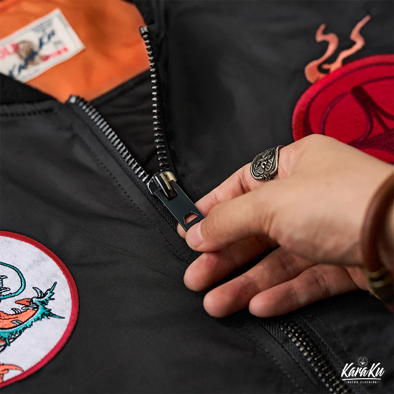浮世絵風の刺繍ワッペンが特徴的なMA-1フライトジャケット。背中には大きな龍の刺繡が施されており、視線を引きつけます。この龍は伝統的な浮世絵スタイルで、主に淡いグリーンで描かれています。龍の鱗や髭、爪などが力強く動きのあるデザインになっており、オレンジ色の炎やアクセントが加えられることで、視覚的に非常に魅力的です。胸元にも小さなオレンジ色の炎が刺繍されており、全体のデザインに統一感をもたらしています。裏地はMA-1フライトジャケットの定番であるレスキューカラーのオレンジを採用。日本人体型に合わせたフィット感で、長く愛用していただける風合いをお楽しみいただけます。