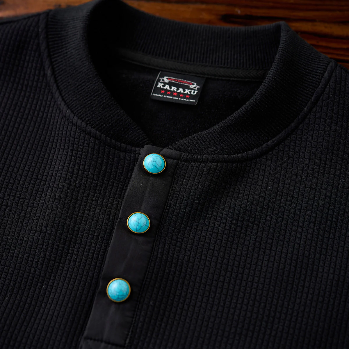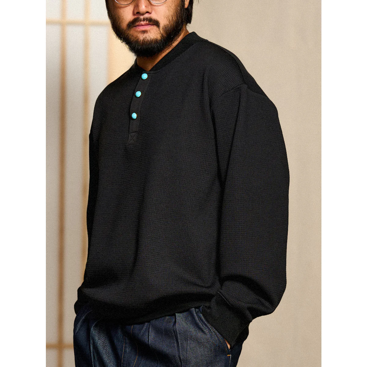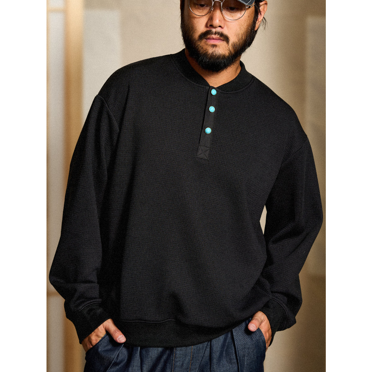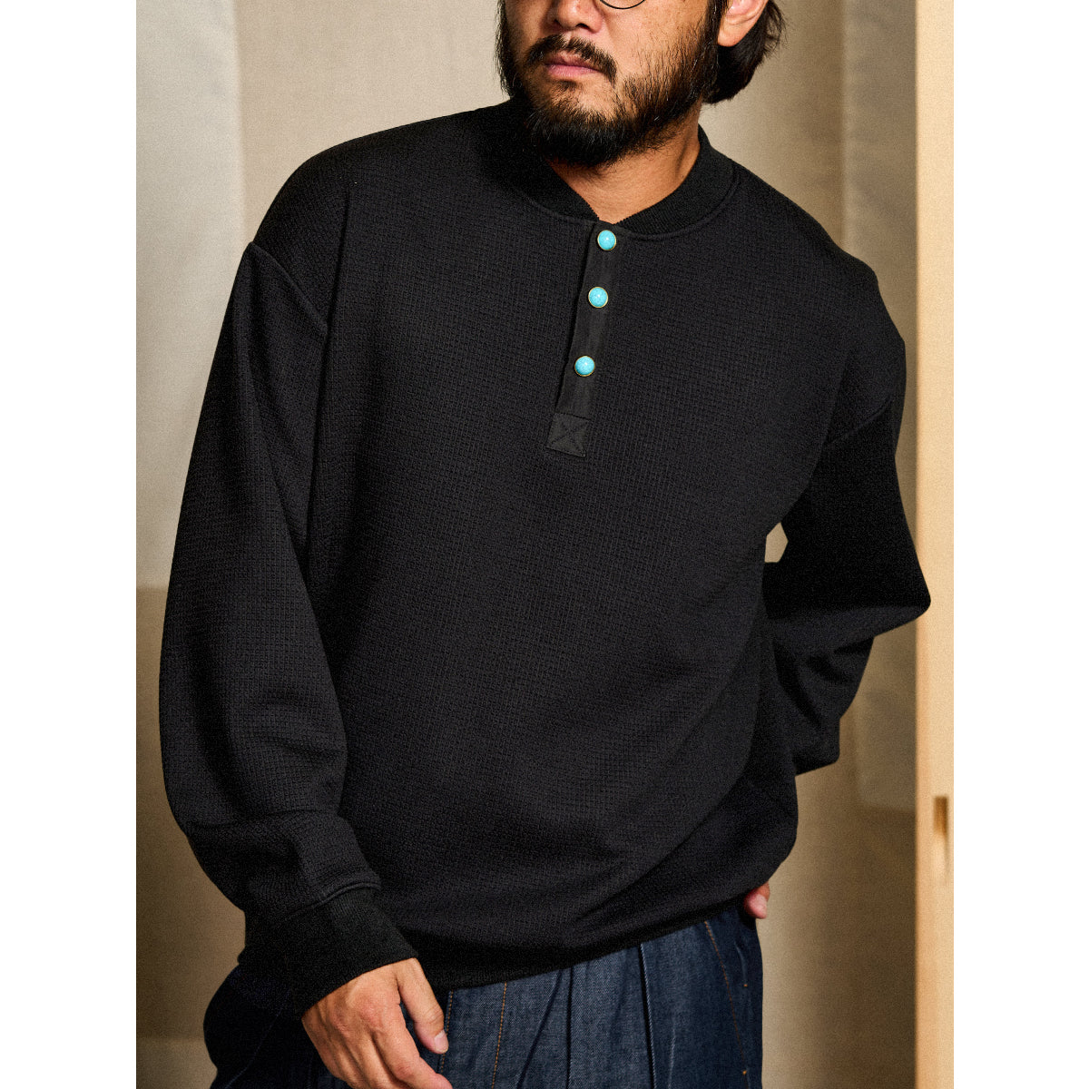 • ターコイズ風ボタン付き オーダーメイドワッフルヘンリーネックスウェット