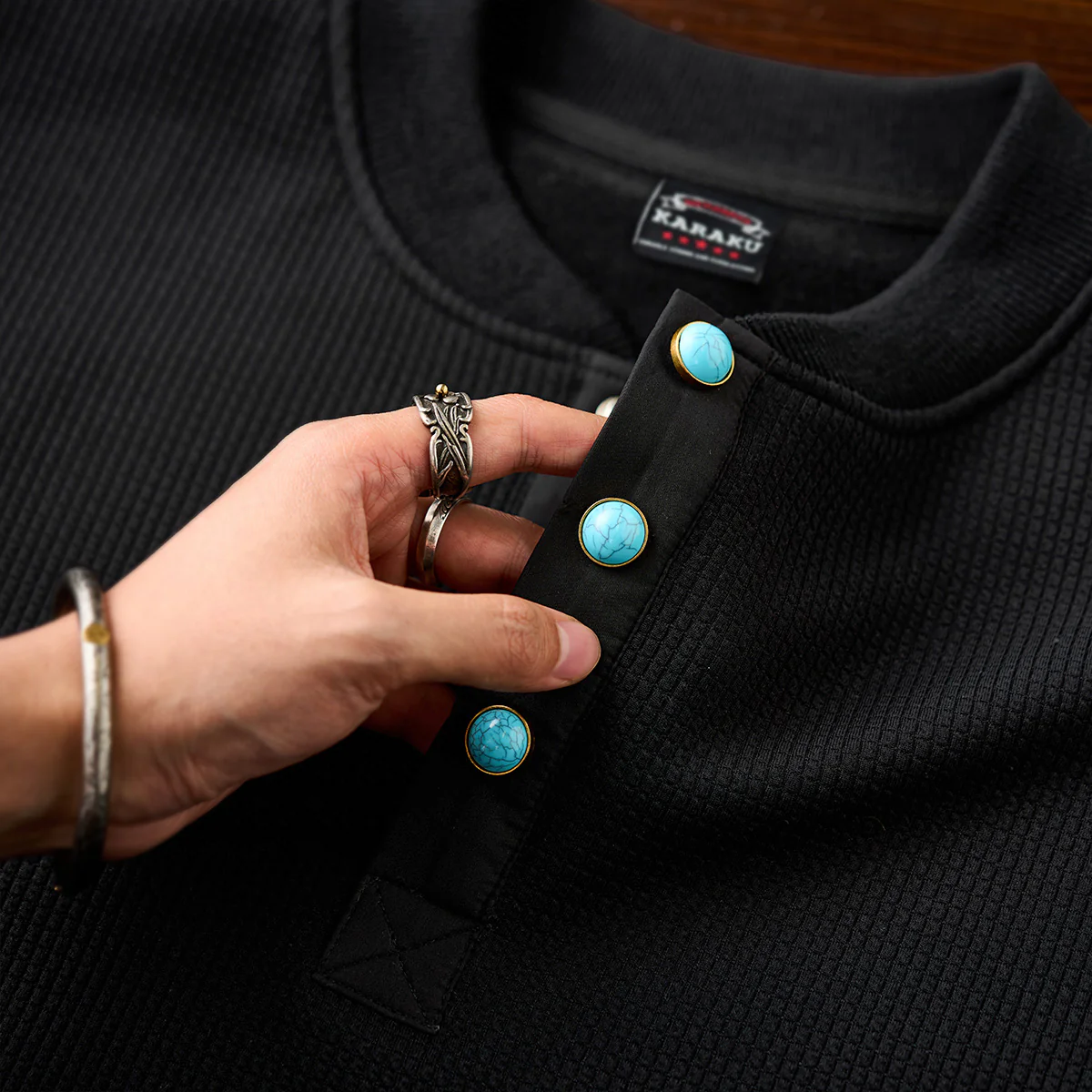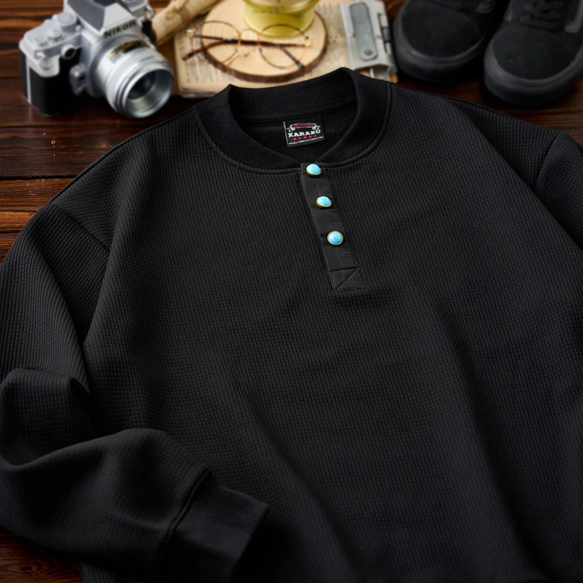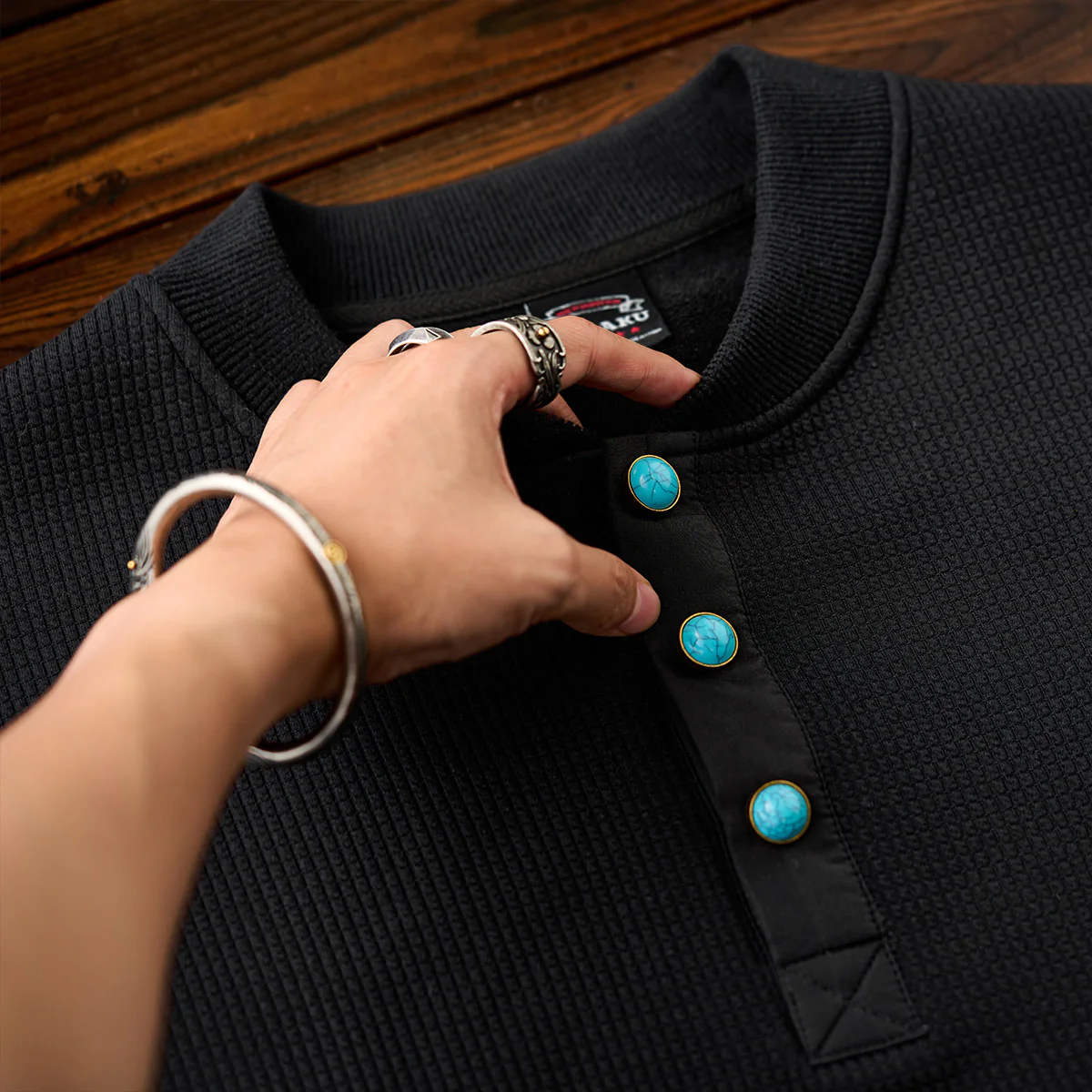 首元のヘンリーネック部分に配置されたターコイズ調のボタンが目を引きます。シンプルなブラックのスウェットにアクセントを加え、全体のデザインを引き締めています。