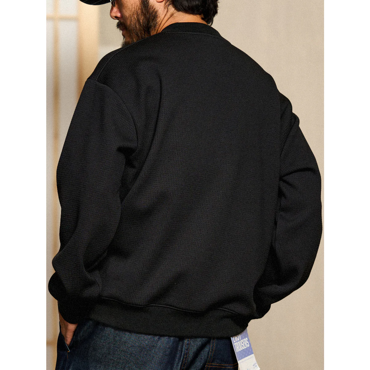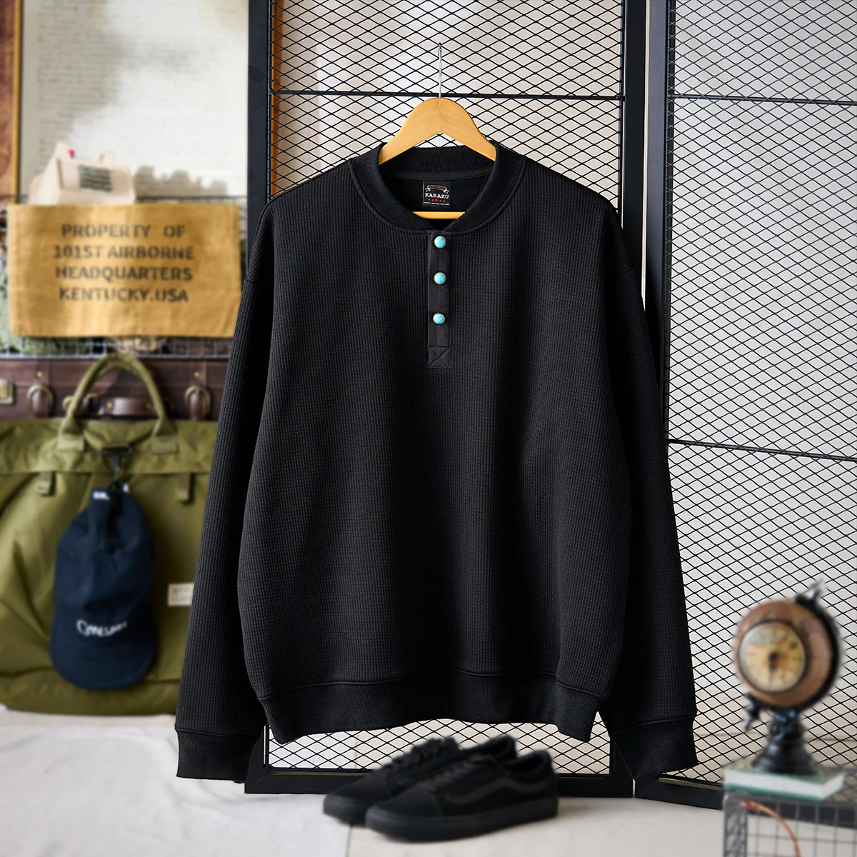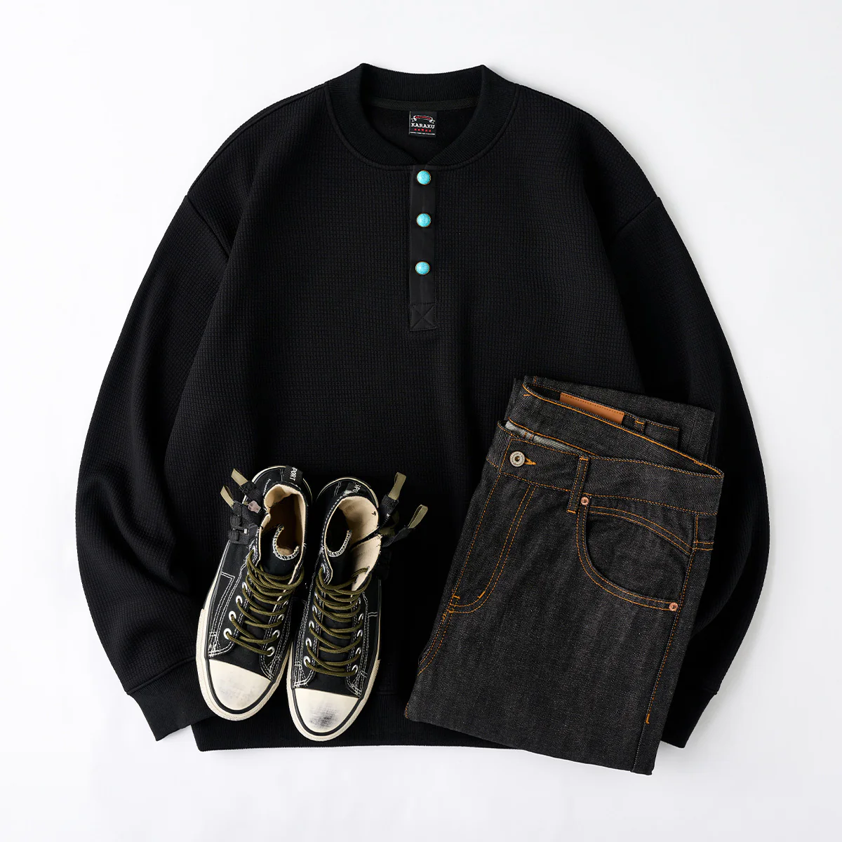 首元のヘンリーネック部分に配置されたターコイズ調のボタンが目を引きます。シンプルなブラックのスウェットにアクセントを加え、全体のデザインを引き締めています。