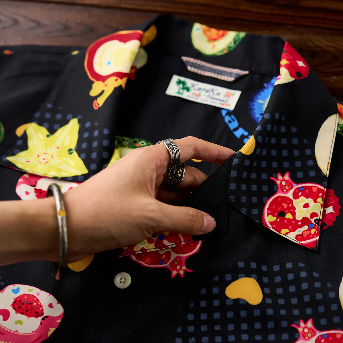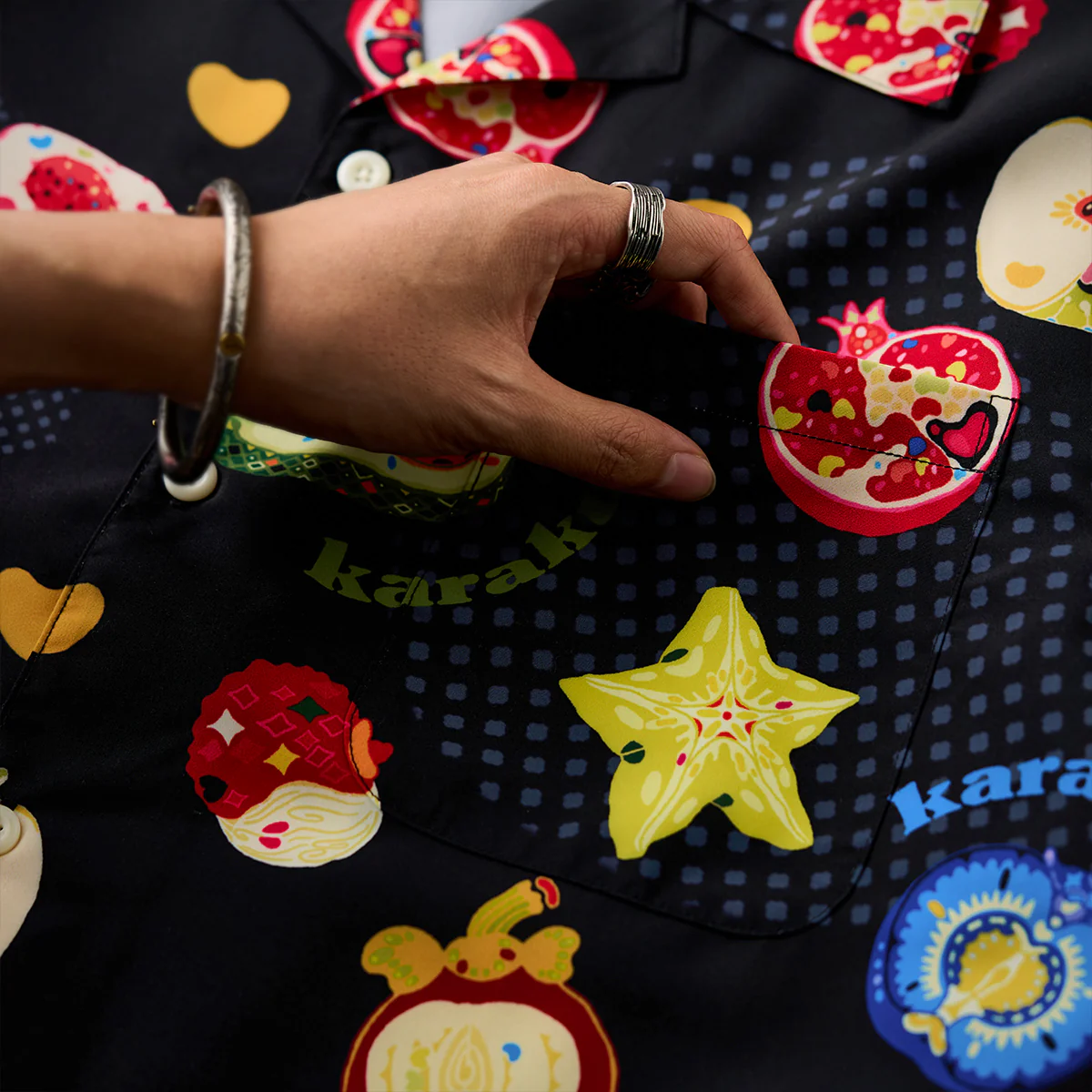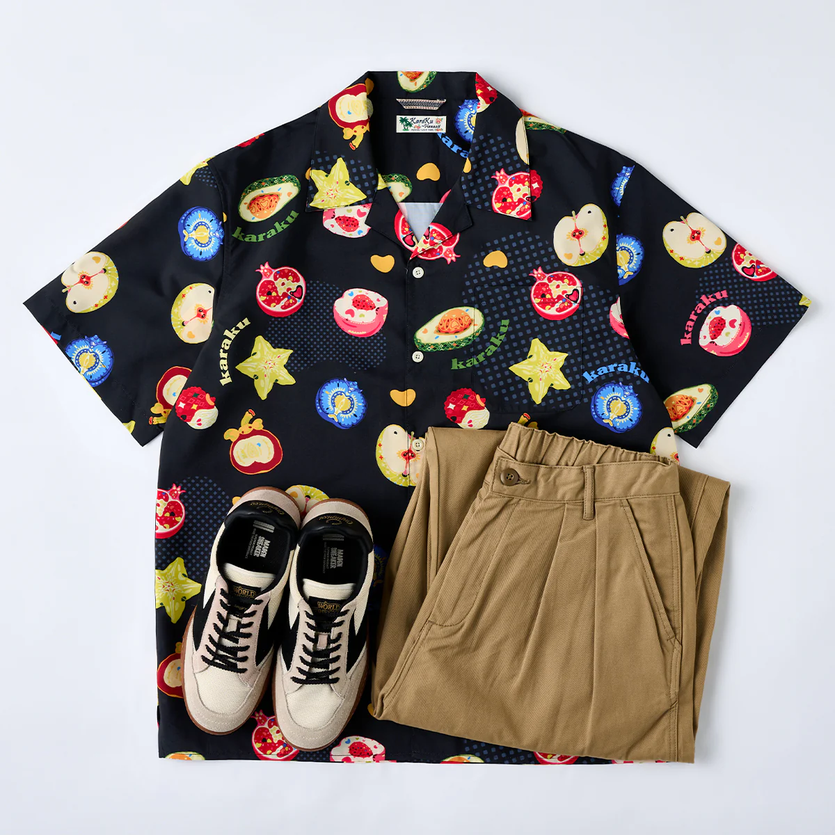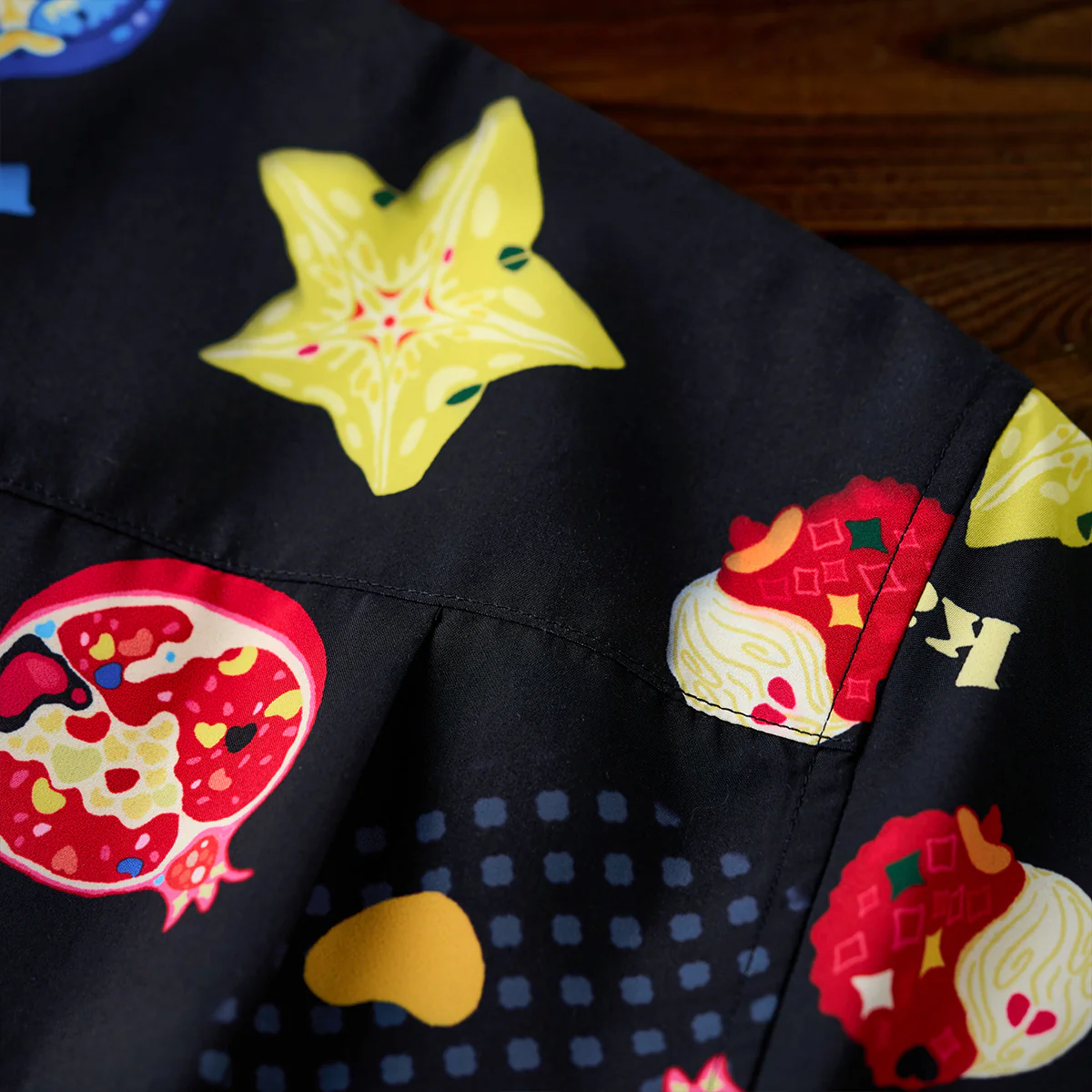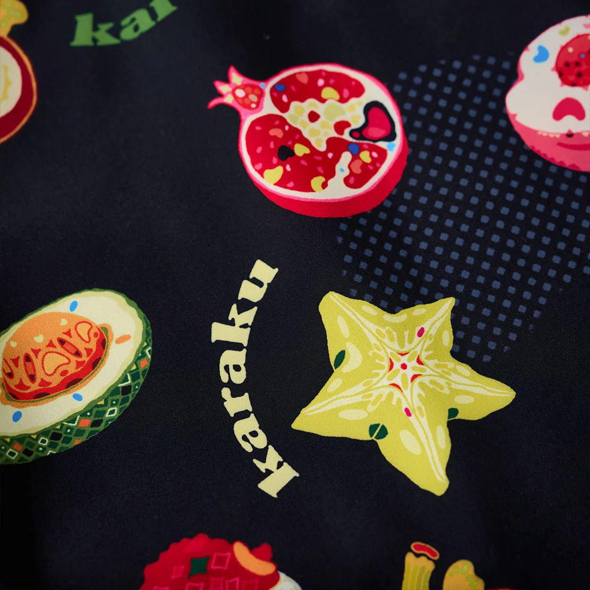 緑色とオレンジのコントラストが鮮やかなアボカドや、黄色の星型がユニークなスターフルーツ、赤い色調で、断面が細かく描かれているザクロなど、様々な果物がカジュアルなタッチで描かれて、リアルさよりもイラストのポップ感が重視されている。