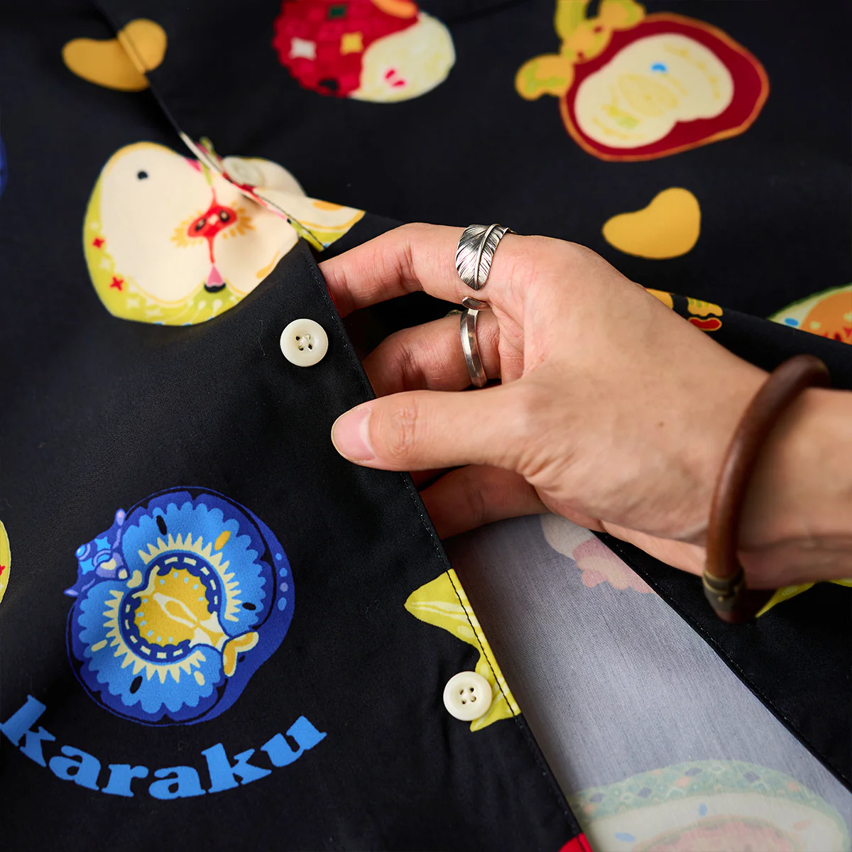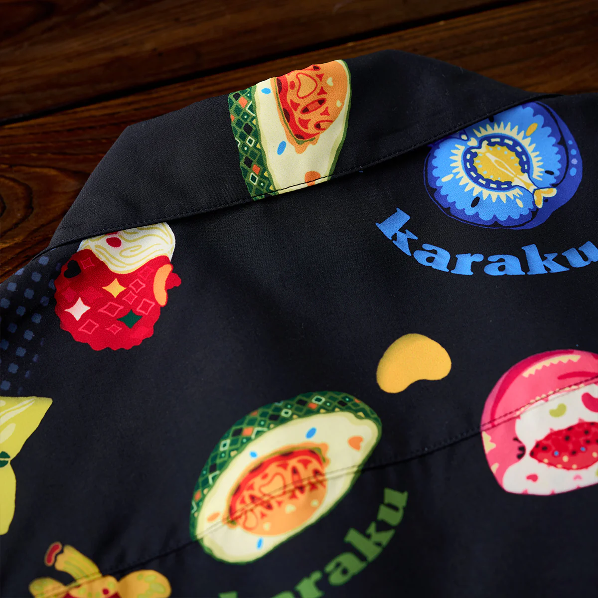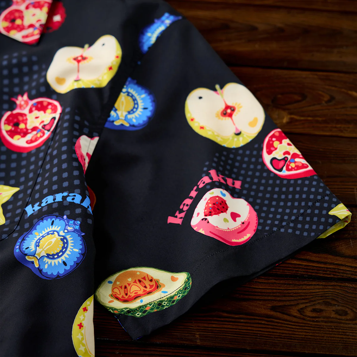 「karaku」ロゴが随所に配置されて、視覚的なアクセントとして機能し、デザインにリズムを与え。背景はブラックで統一されて、フルーツや文字がより鮮やかに際立つよう工夫されている。