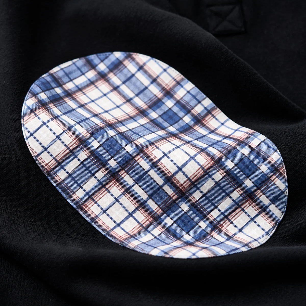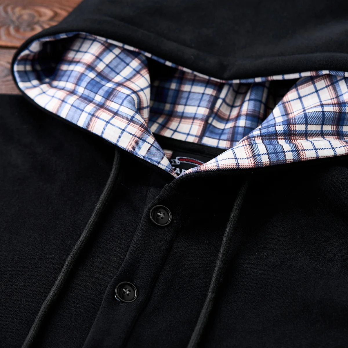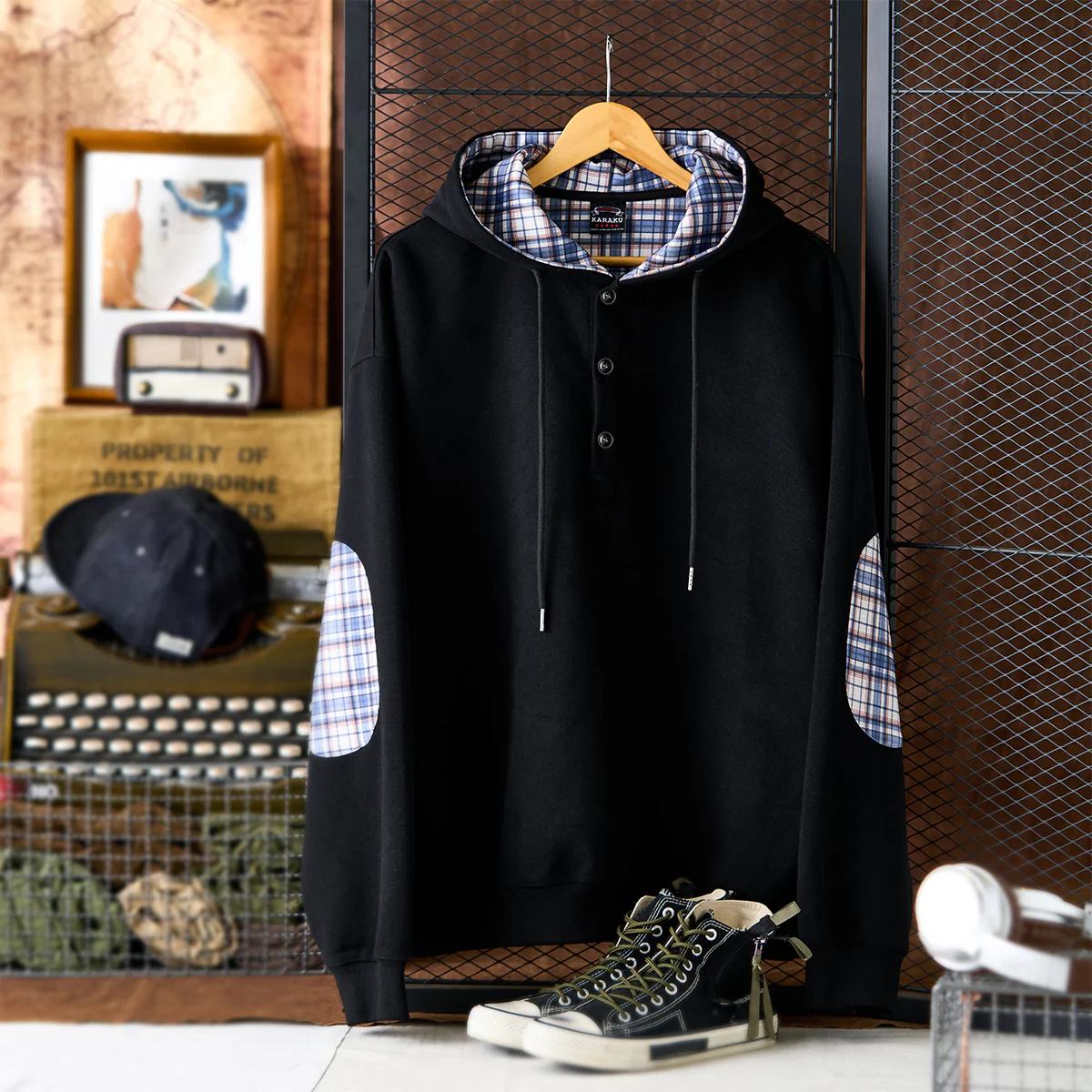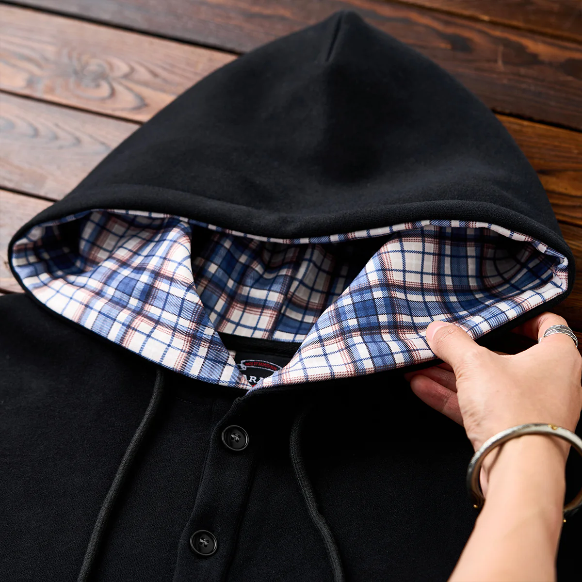 肘チェック柄パッチ 裏チェック柄ハーフボタンパーカー