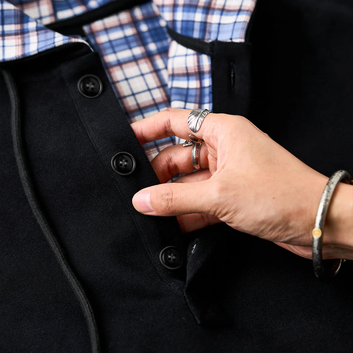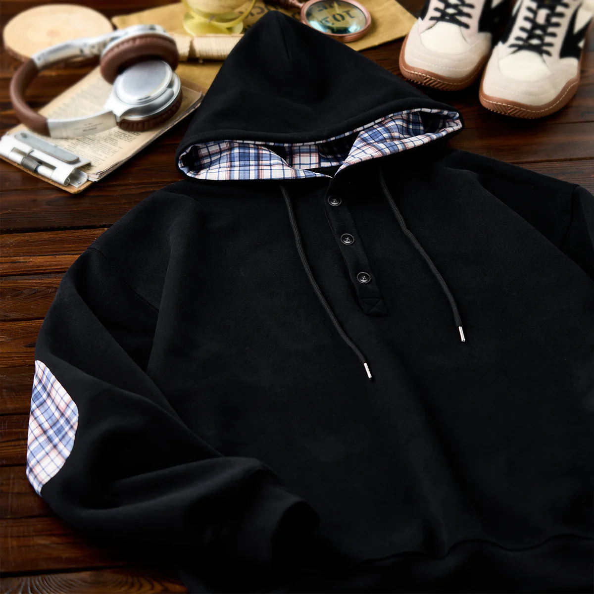 肘にチェック柄のパッチを施し、ワンポイントのアクセントを効かせたハーフボタンパーカー。前立てにはハーフボタンを採用し、着脱のしやすさとともにデザイン性を高めています。裏地にもチェック柄を取り入れることで、フードや前立てから覗くさりげない柄使いがスタイリングに遊び心をプラスします。シンプルなシルエットながらもディテールで個性を演出し、カジュアルからきれいめまで幅広いコーディネートに対応。ハーフボタンデザインにより着脱しやすく、レイヤードスタイルでも活躍する一着です。