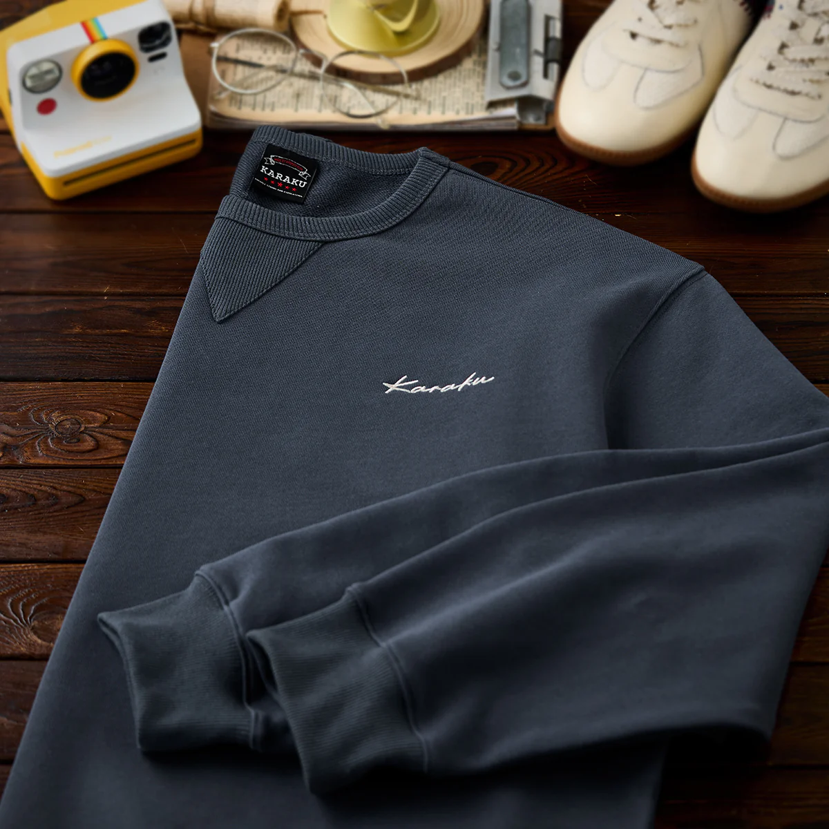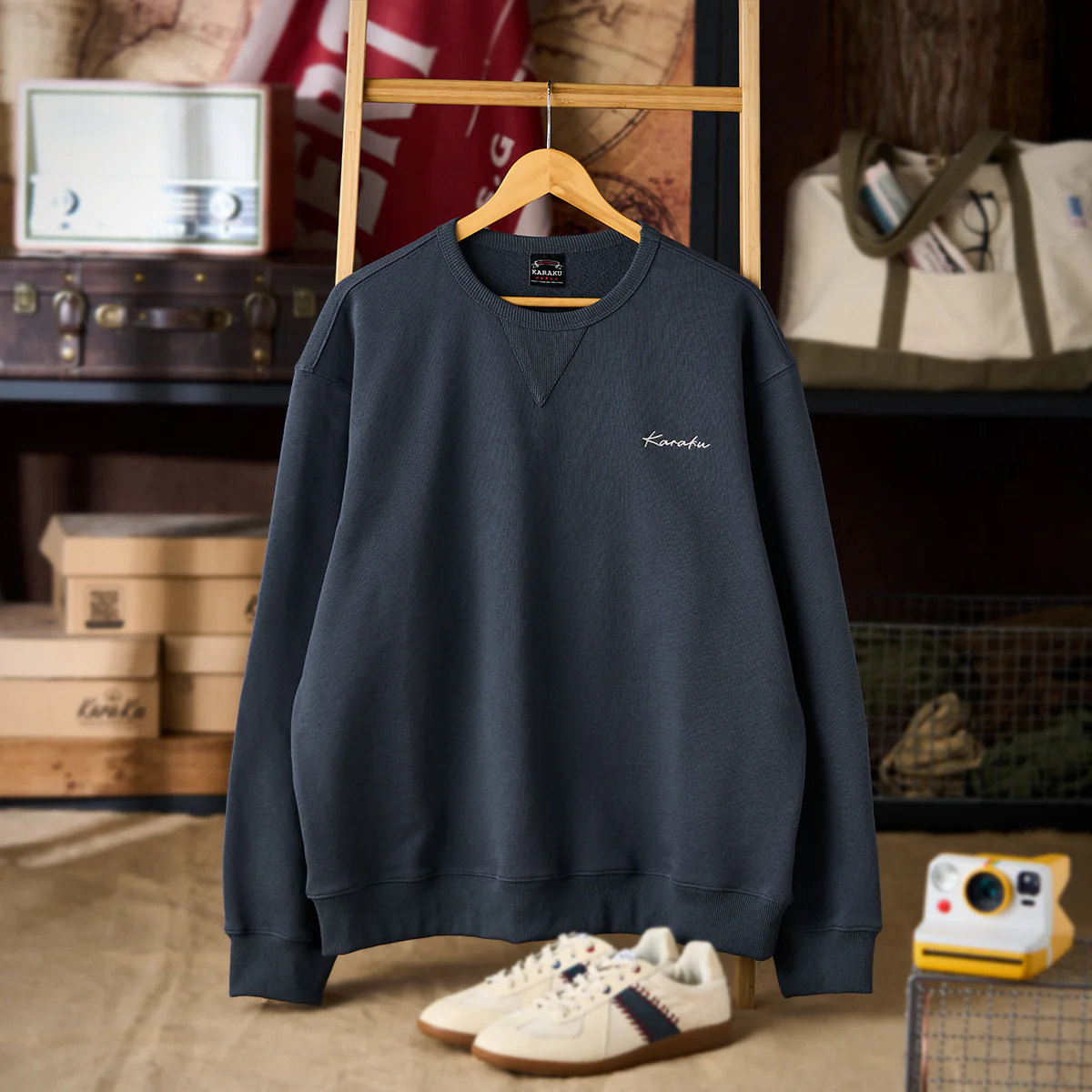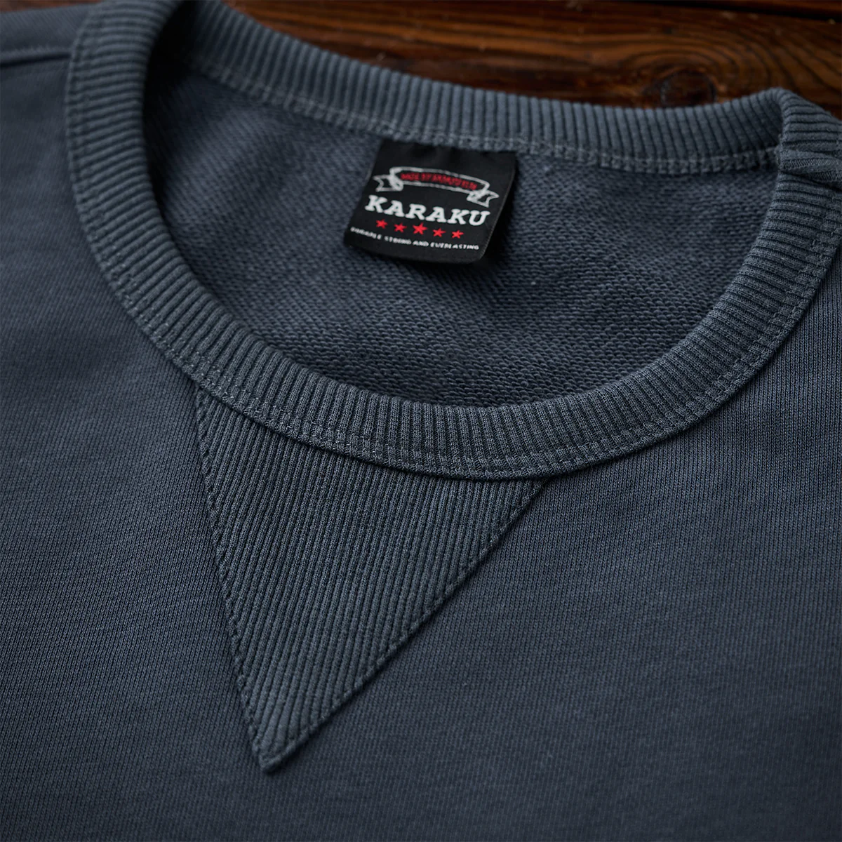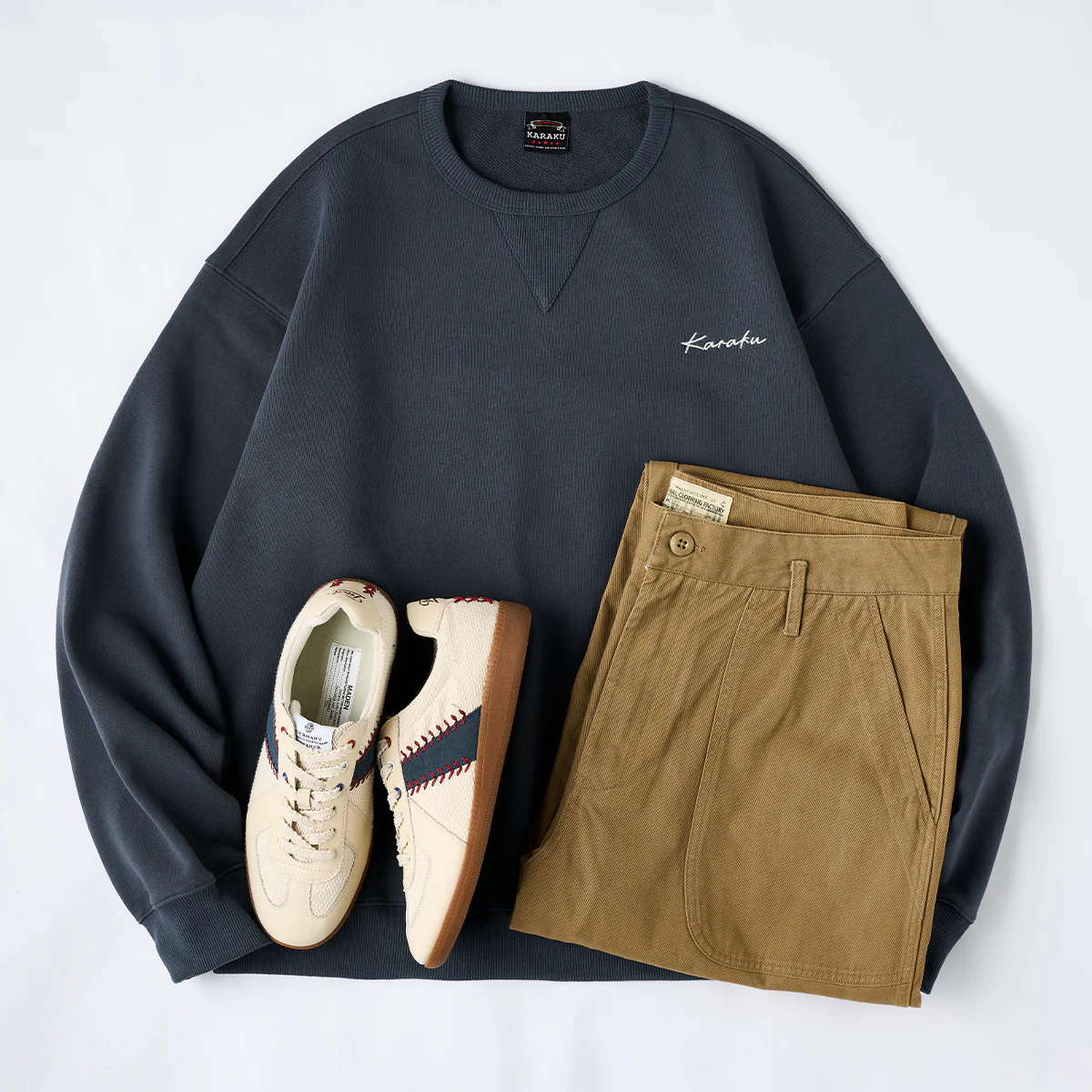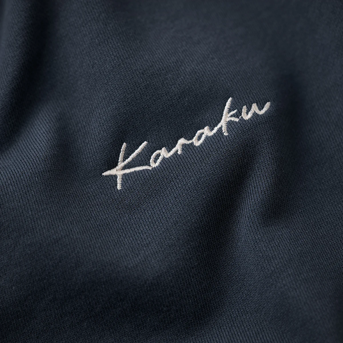 左胸部分に控えめな刺繍で「Karaku」のロゴが配置され、シンプルながらも上品な雰囲気を醸し出し、ミニマルデザインとして全体の調和を損なわないポイントになっています。