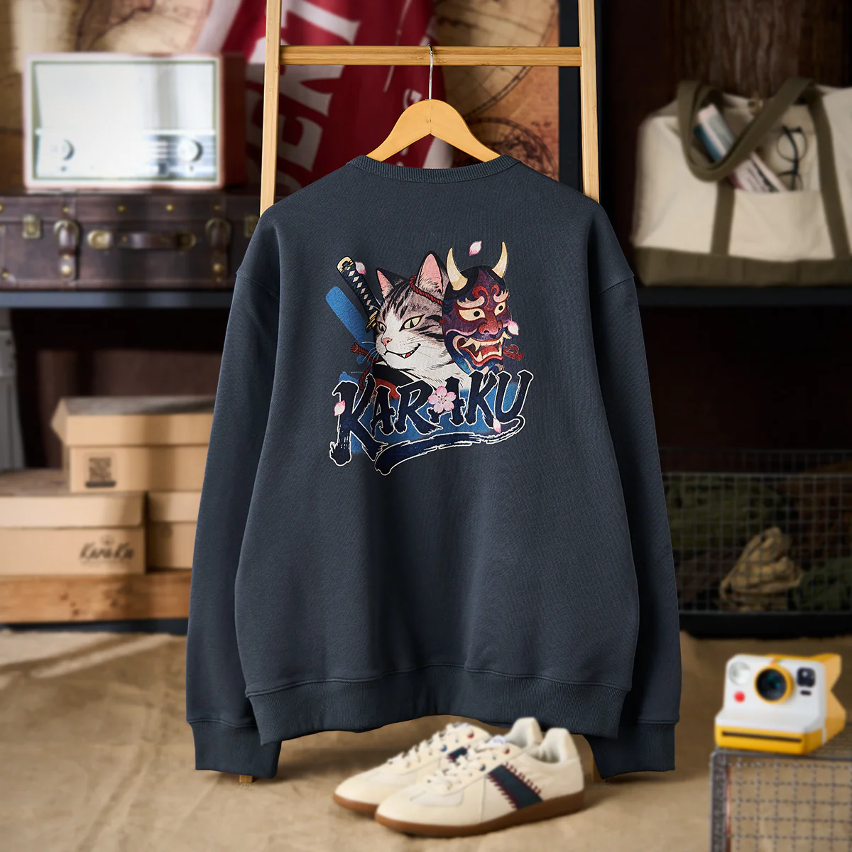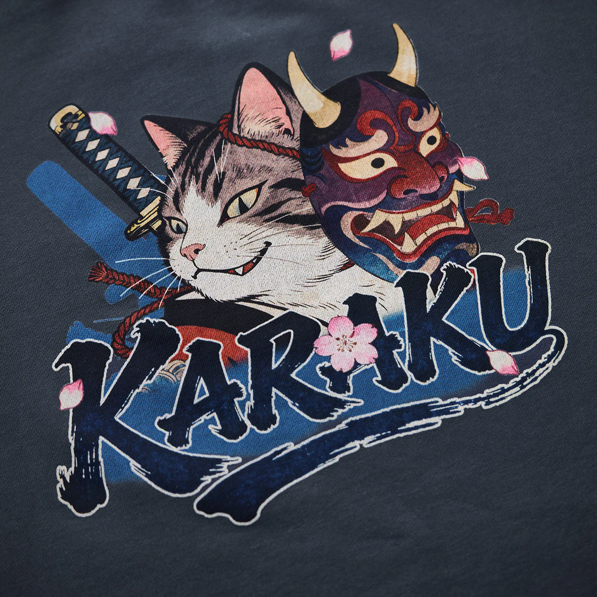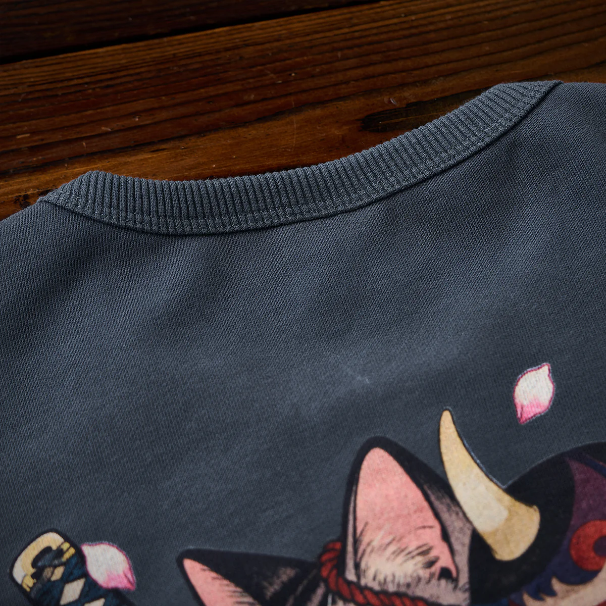 バッグプリントのデザインには猫と般若面が描かれており、刀も含まれていることで、伝統的な日本文化や侍の要素を感じさせます。桜の花びらが舞っており、日本らしい美的感覚を加えています。