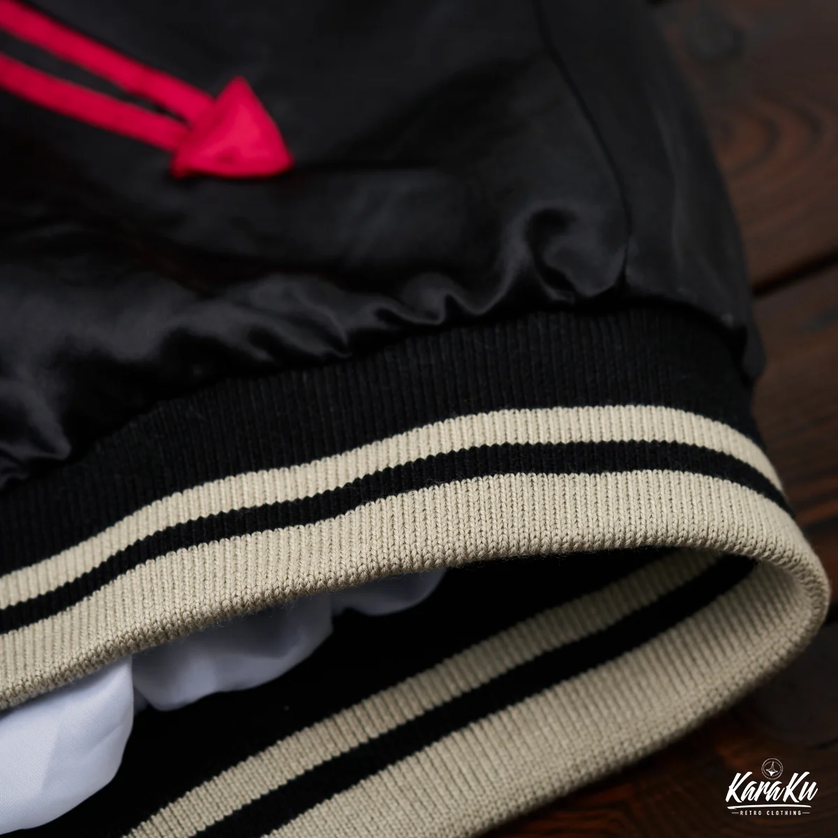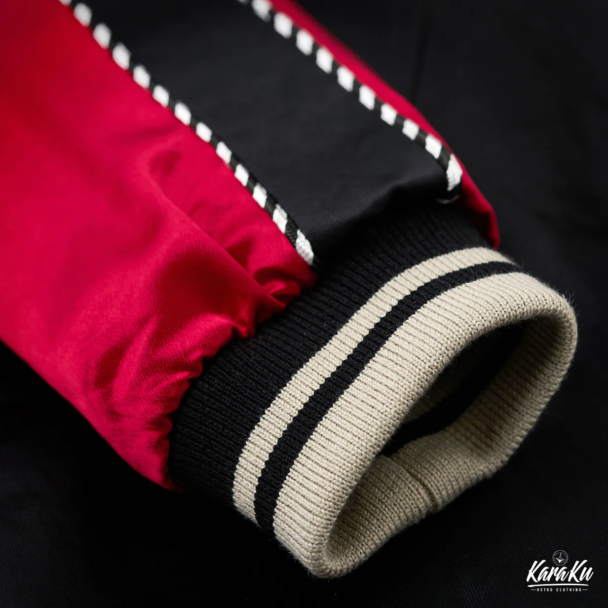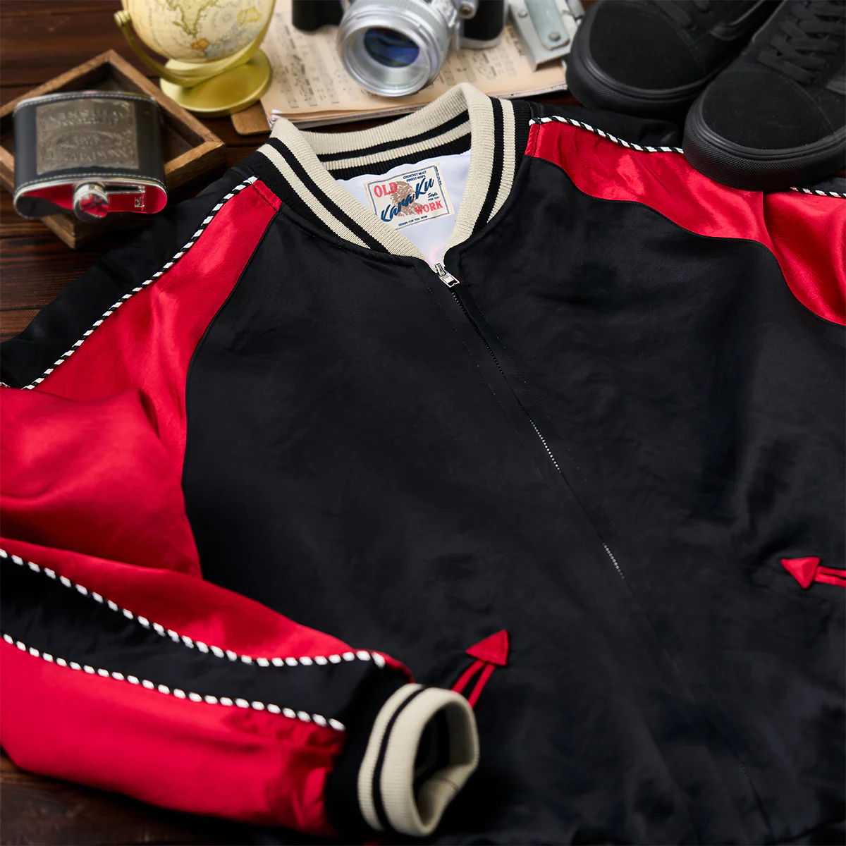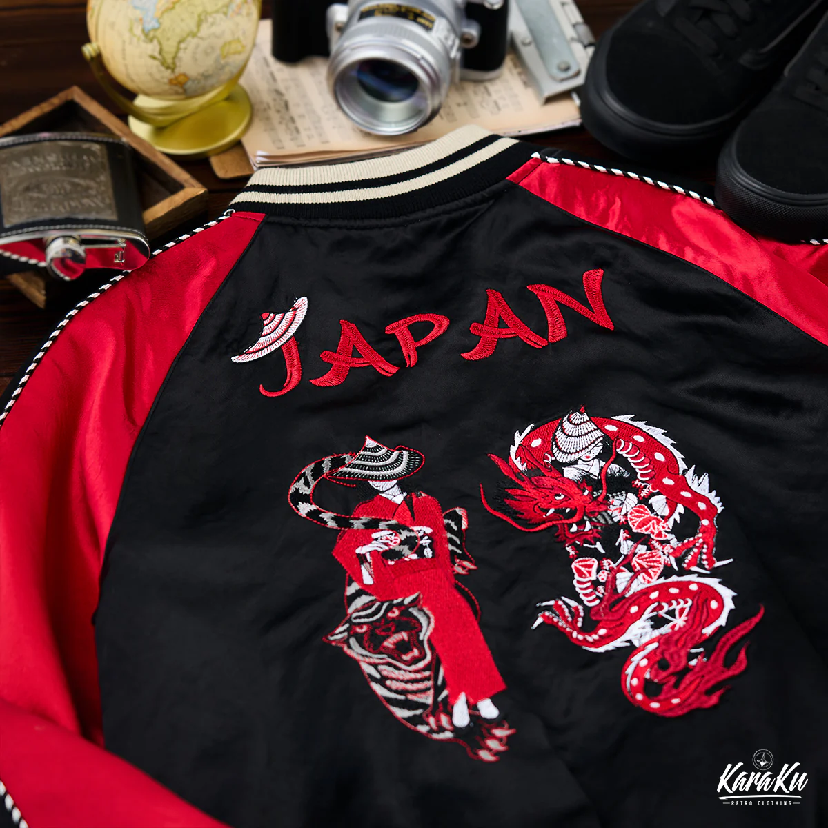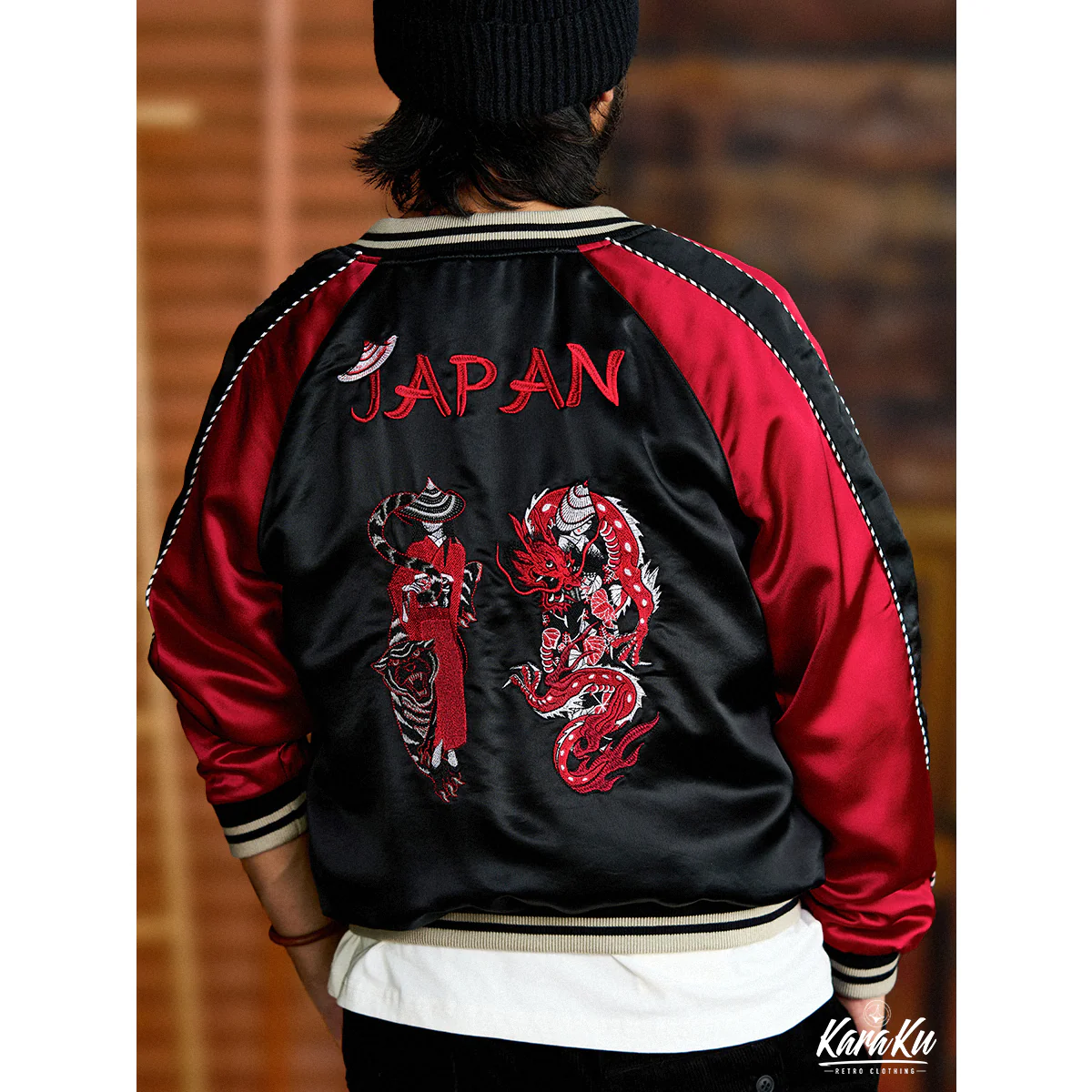 刺繍が施された古着チックなデザインのスーベニアジャケットが登場!背面には精巧な浮世絵風刺繍が施されており、左側には赤い和服を纏った陰陽師と、その式神である黒虎が描かれています。右側には黒い和服を纏った陰陽師と、彼女の式神である赤龍が描かれています。これらのデザインは、陰と陽、静と動のバランスを表現しており、日本の伝統的な陰陽師の世界観と現代のファッションセンスを見事に融合させた、非常にユニークなアイテムです。リブ編みの襟、袖口、裾がスタイリッシュさと快適さを兼ね備えており、これからの季節にも重宝します。