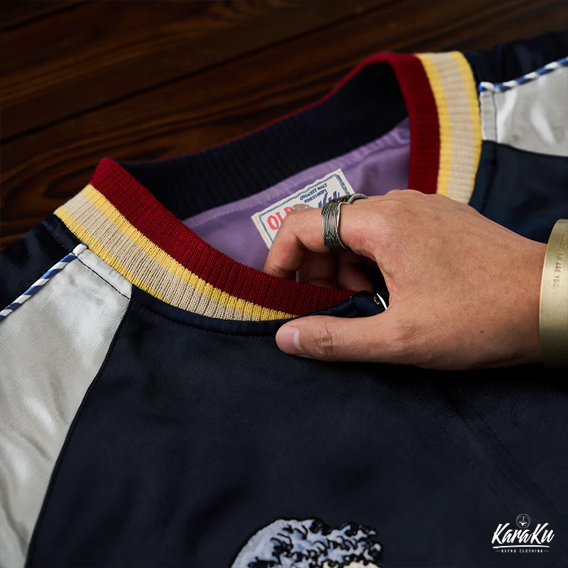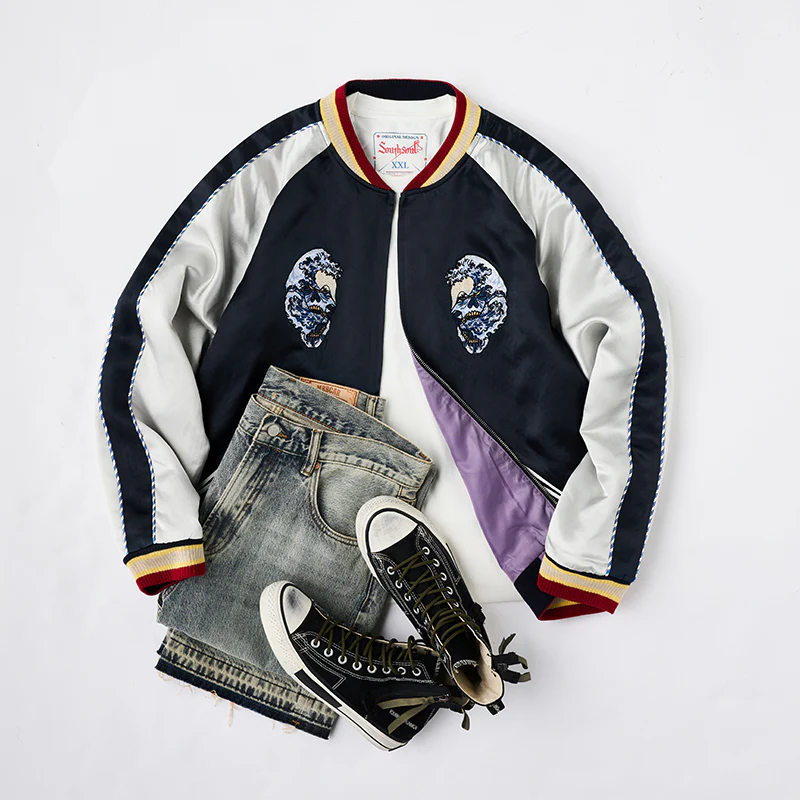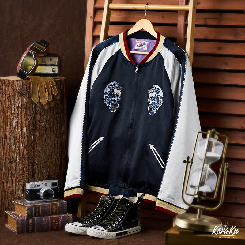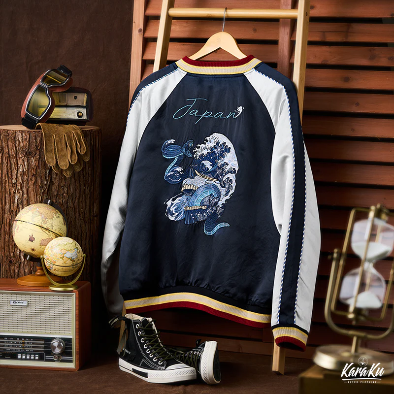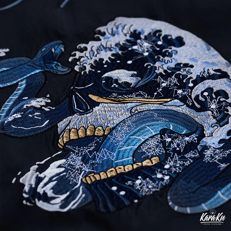 • 横須賀「ドクロ、蛇と波」浮世絵刺繡入りスカジャン