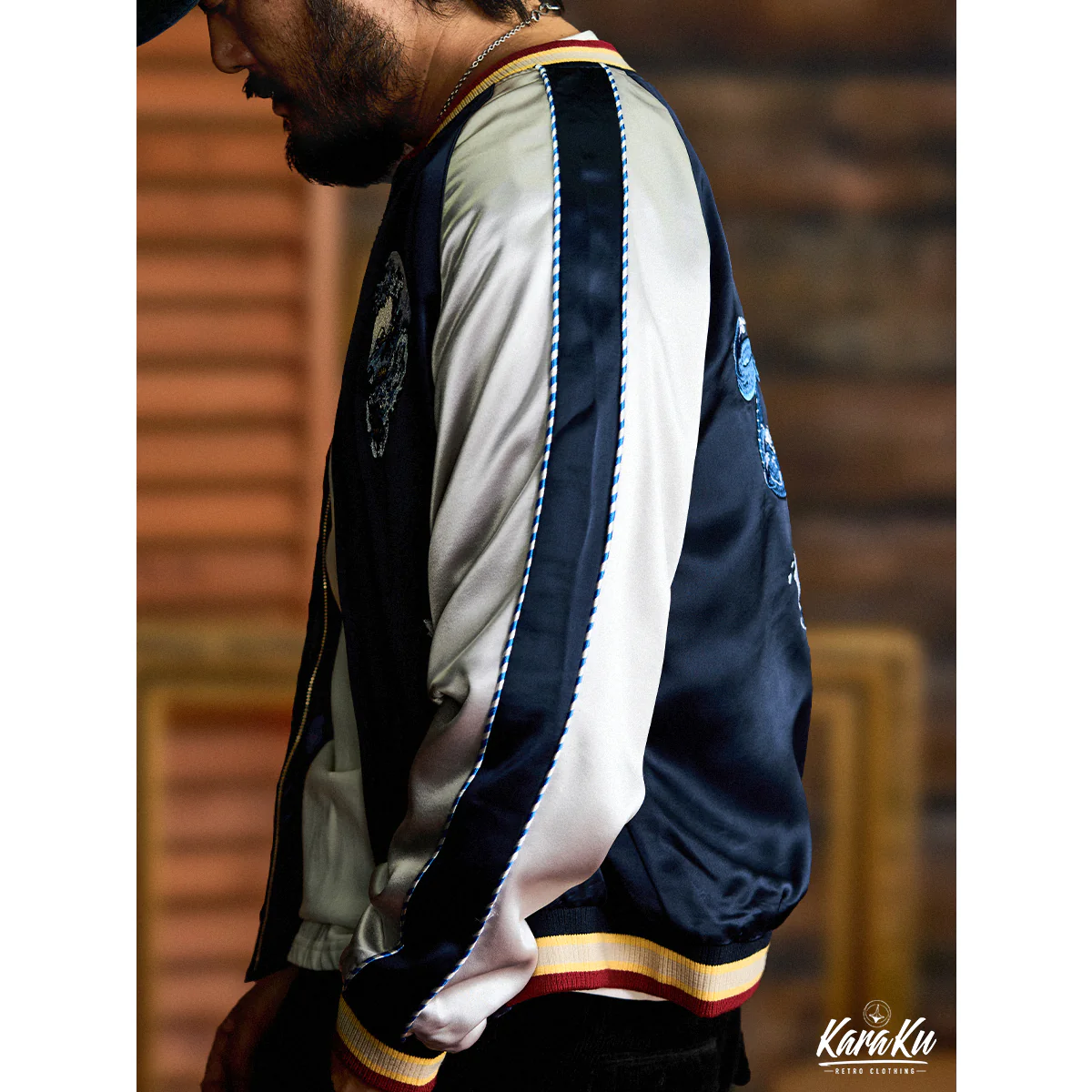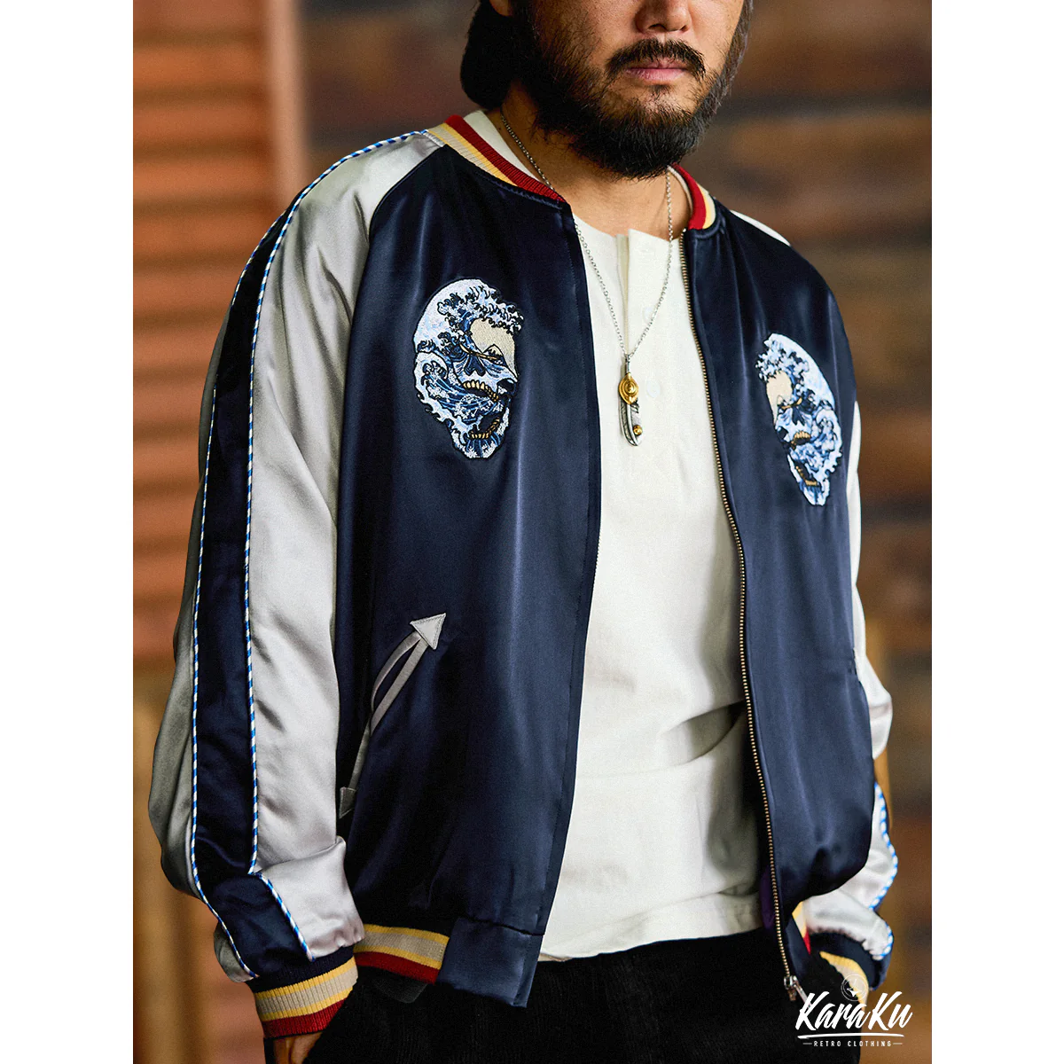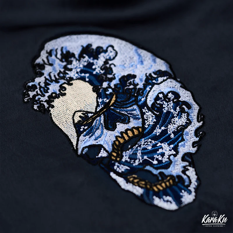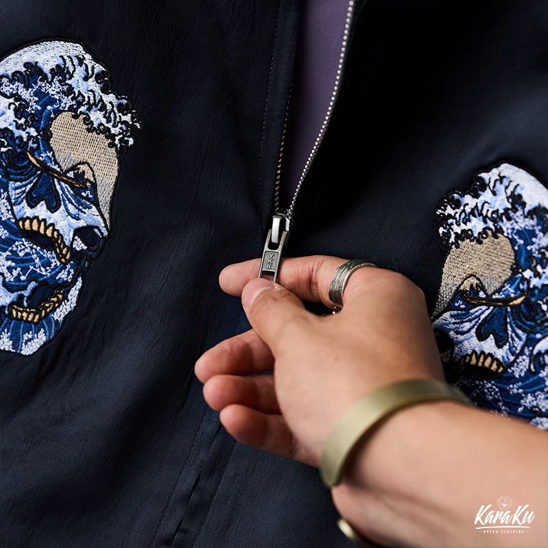 胸元の左右対称のドクロ刺繡は、デザインのバランス感と対称美を強調し、安定感と調和の取れた視覚体験を提供。ドクロの内部や周りには日本の浮世絵風の波の要素が融合されて、バックデザインのテーマを継承している。