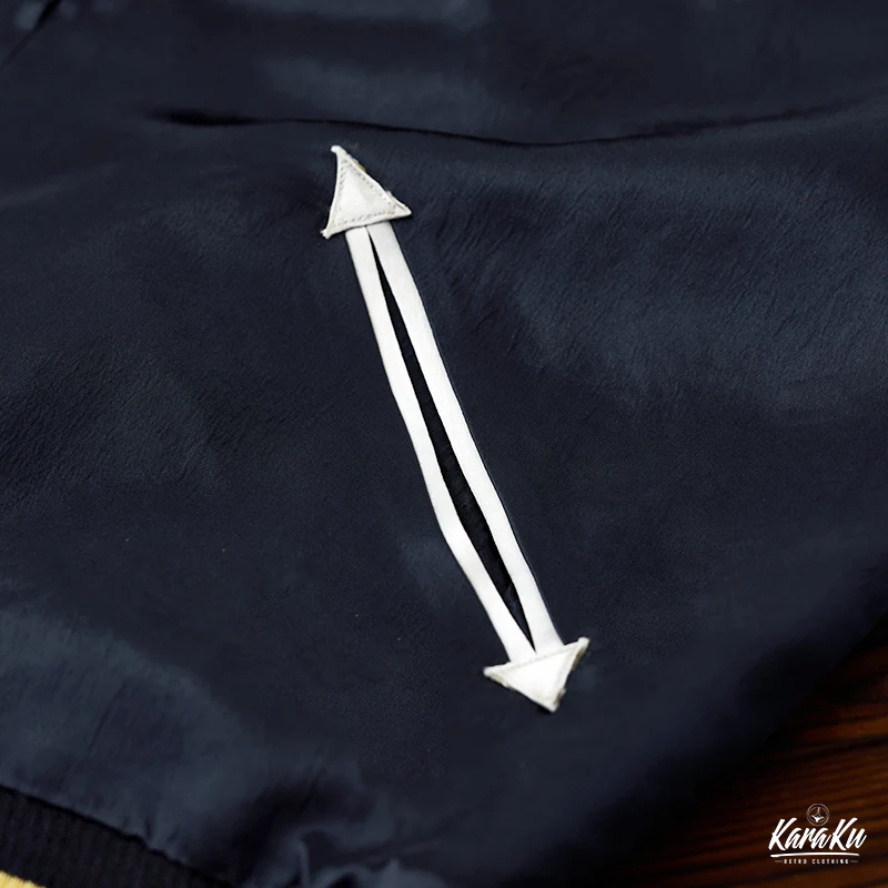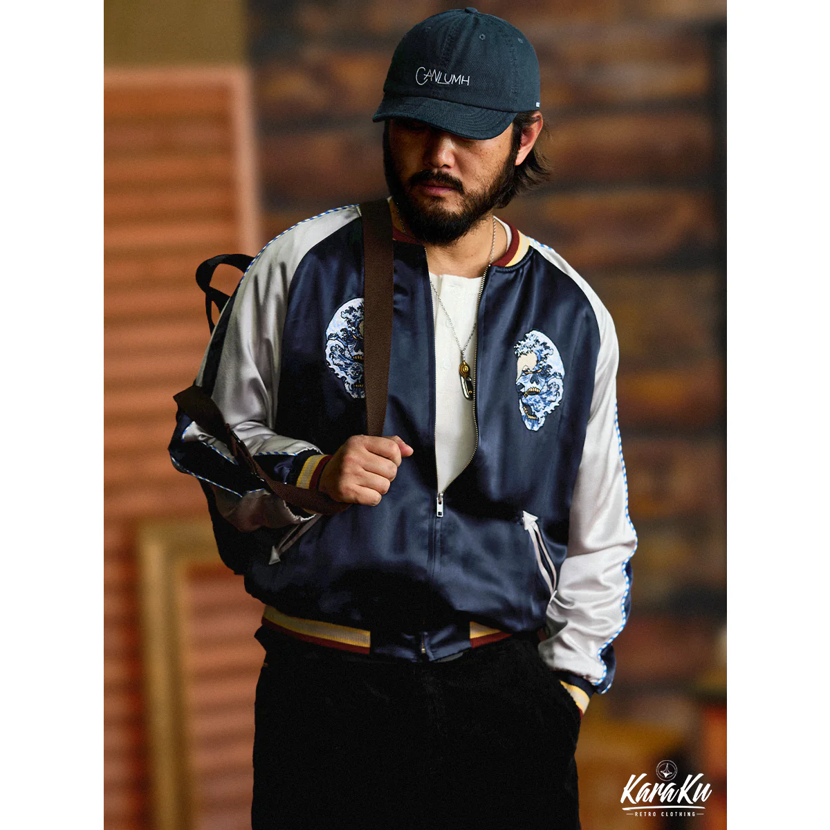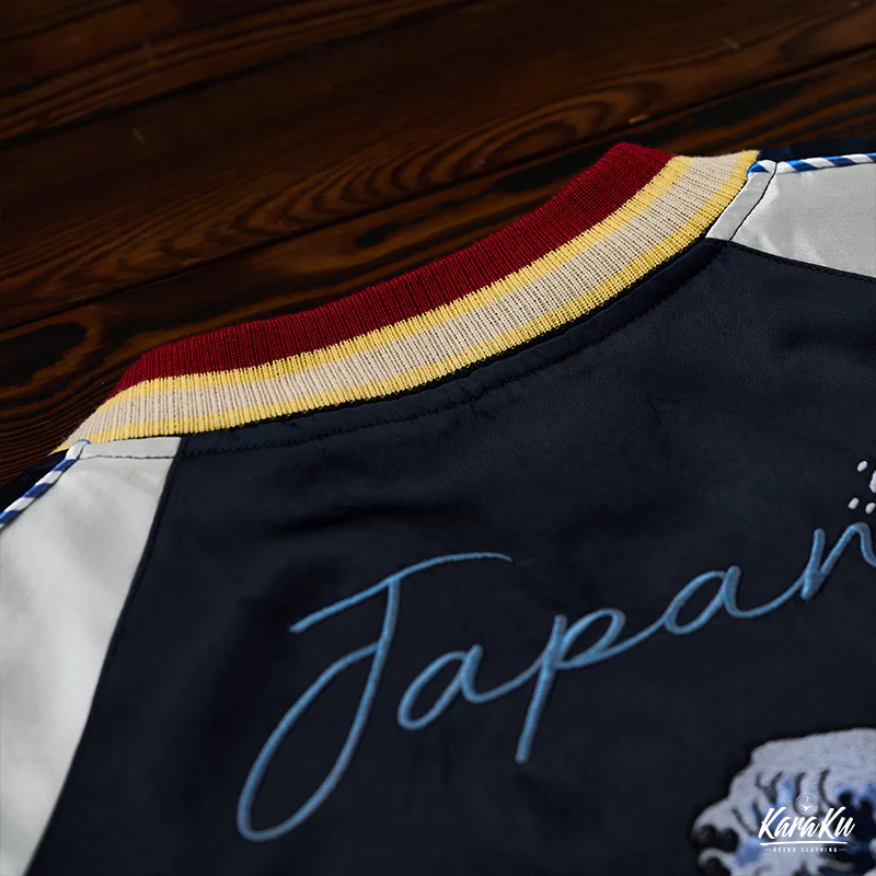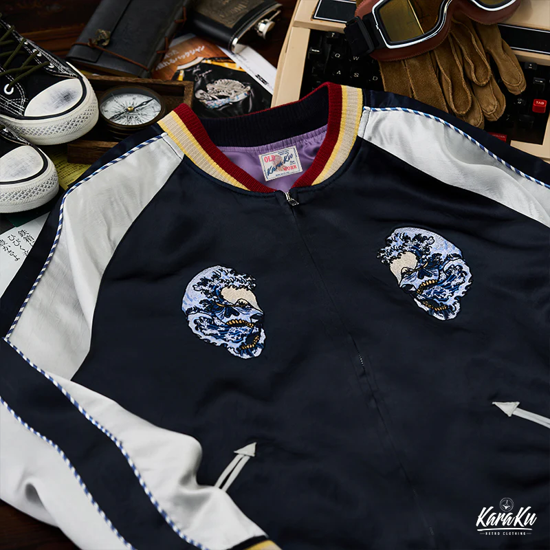 バックには大きなドクロの刺繡が施されて、日本の浮世絵「神奈川沖浪裏」の要素と融合して、非常に独特でインパクトのある。