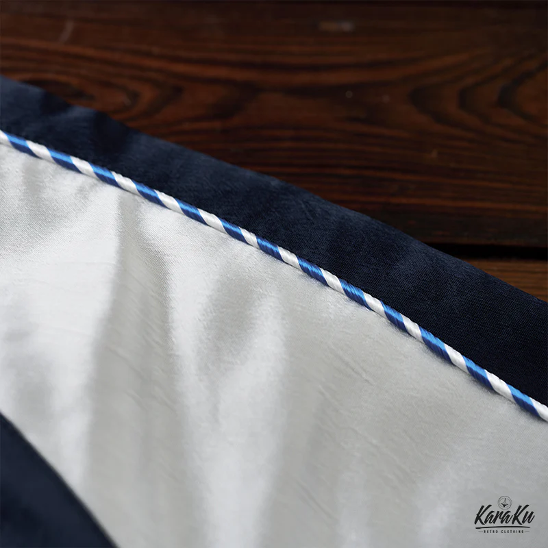 濃紺のボディと白い袖が対照的で、レトロな雰囲気を醸し出しす。襟、袖口、裾のストライプリブがヴィンテージ感を強調、白、青、赤、黄色がアクセントとして使用、この配色は視覚的に引き締まった印象を与える。