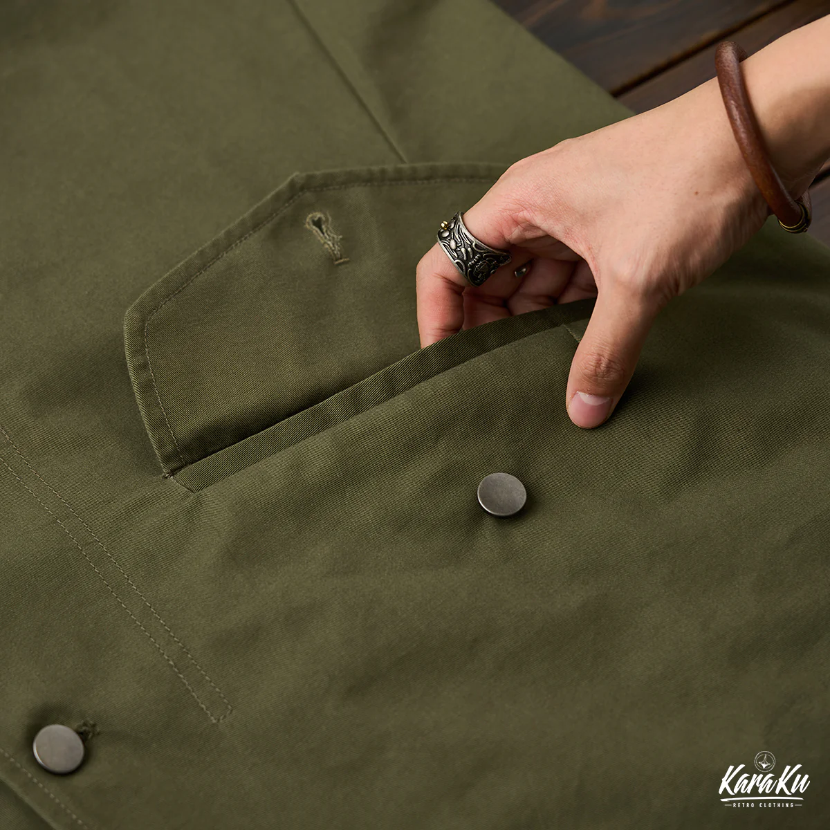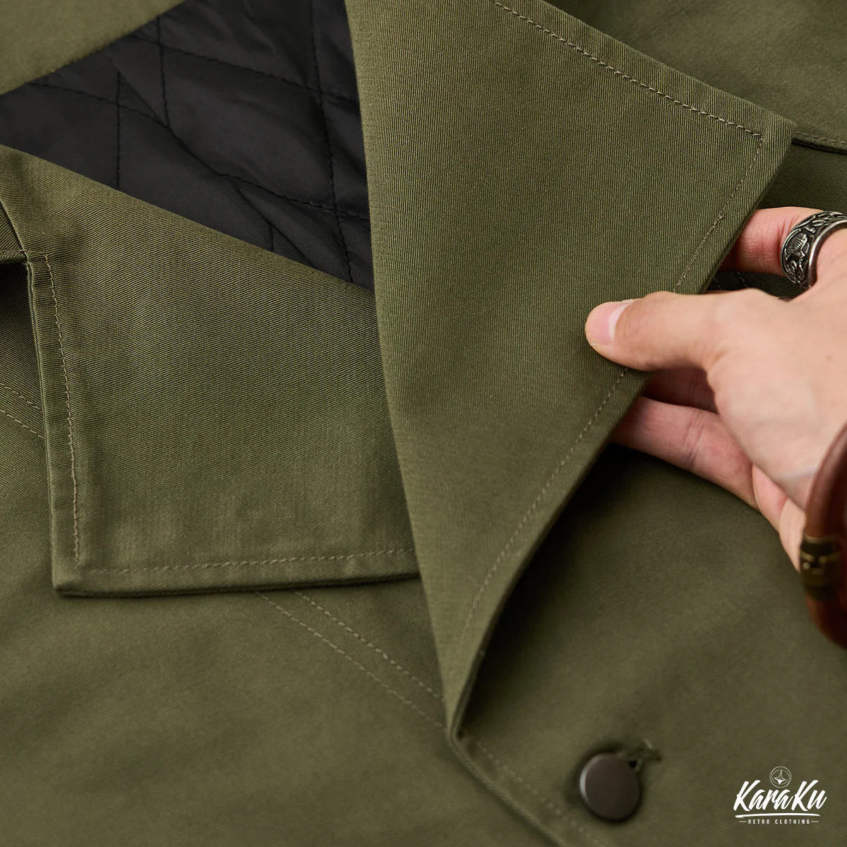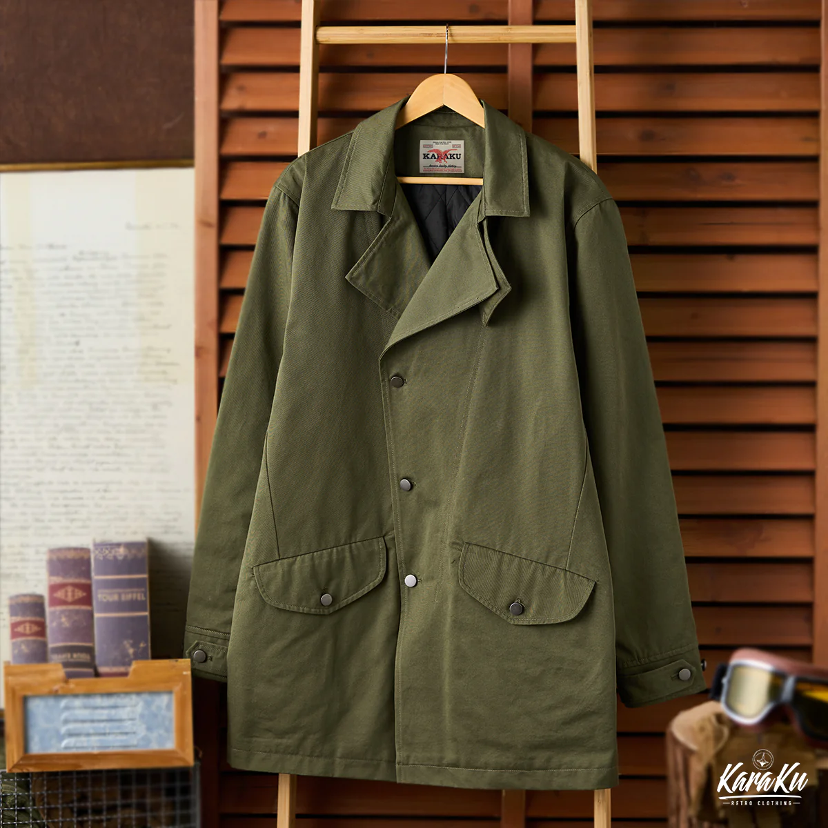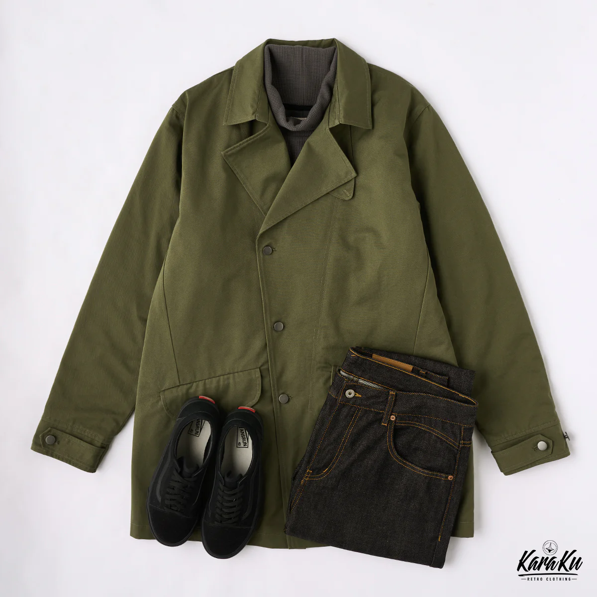 本アイテムは、クラシックなトレンチスタイルにモダンなアレンジを加えた一着です。フロントは斜めにデザインされた前立てで、ユニークな印象を与えると同時に風を防ぎ、寒さから身を守ります。首元にはチンストラップを装備し、しっかりと固定することで冷気をシャットアウト。スタイリッシュなデザインでありながら、実用性も兼ね備えています。ミリタリーテイストと洗練されたシルエットが絶妙にマッチし、都会的なスタイリングを引き立てます。