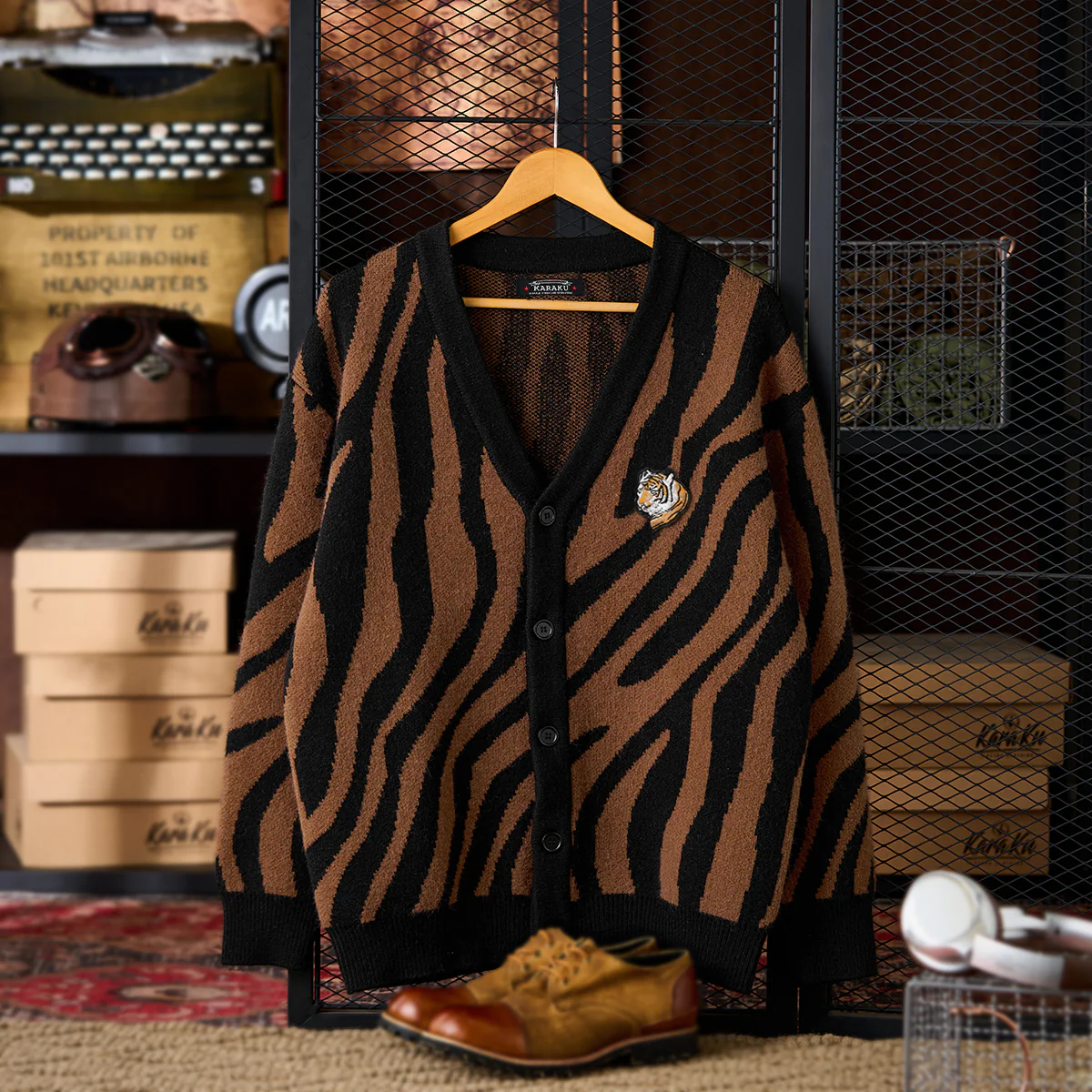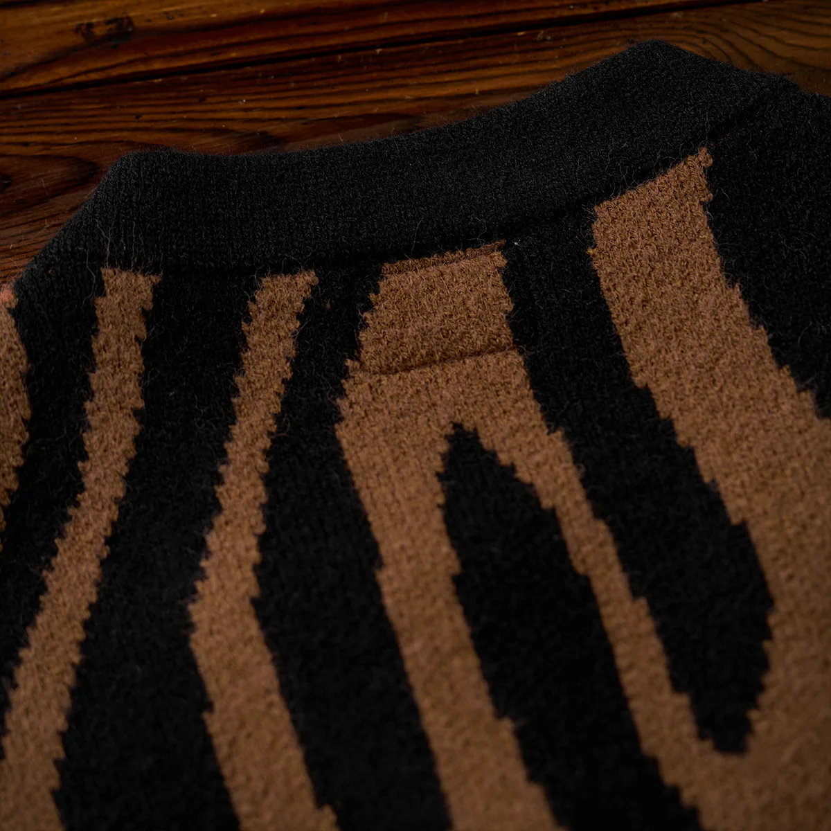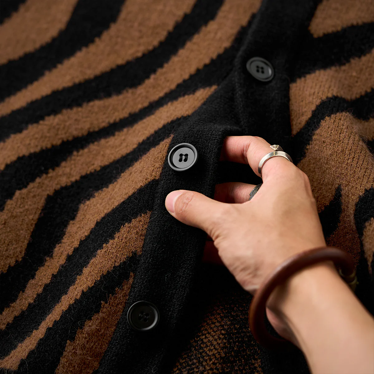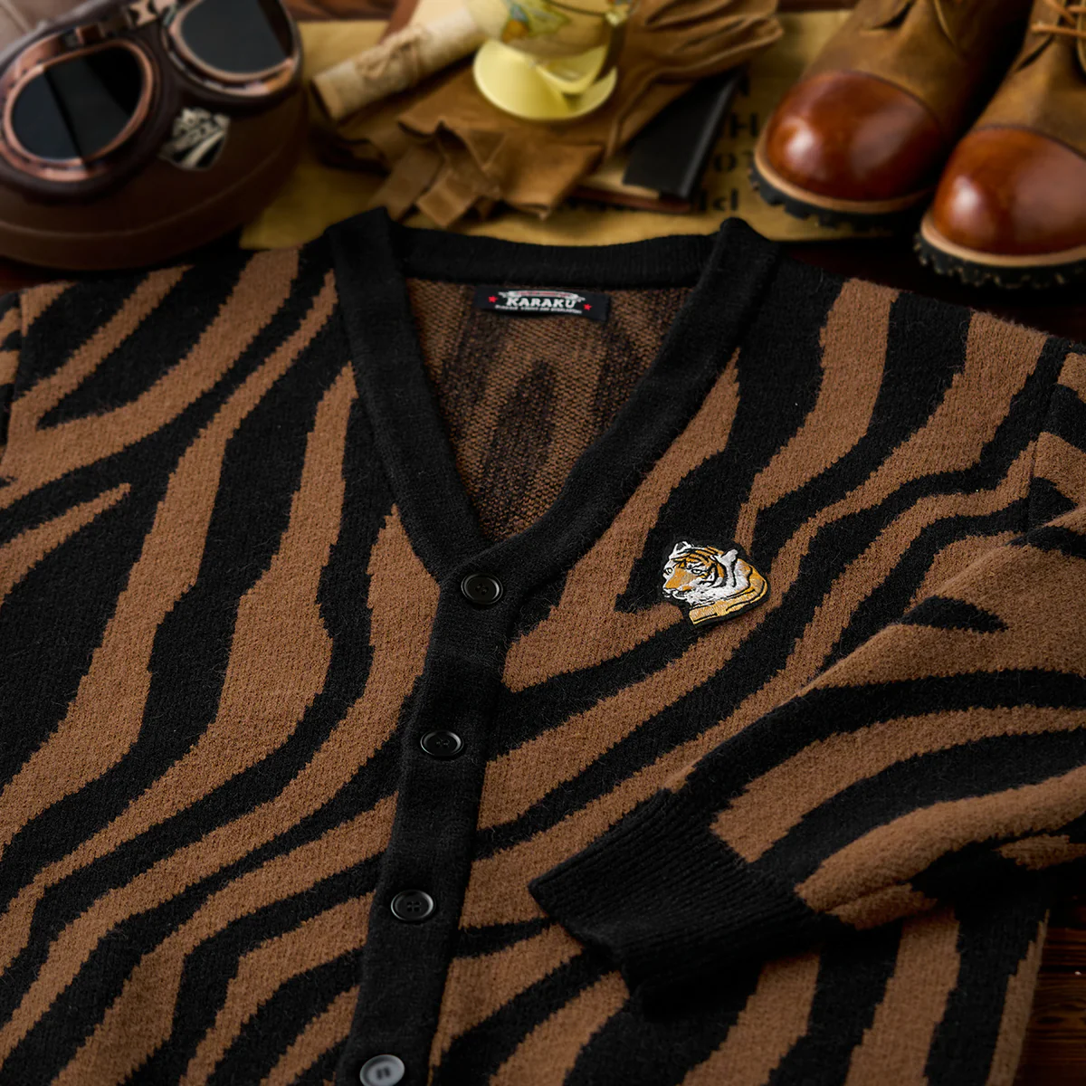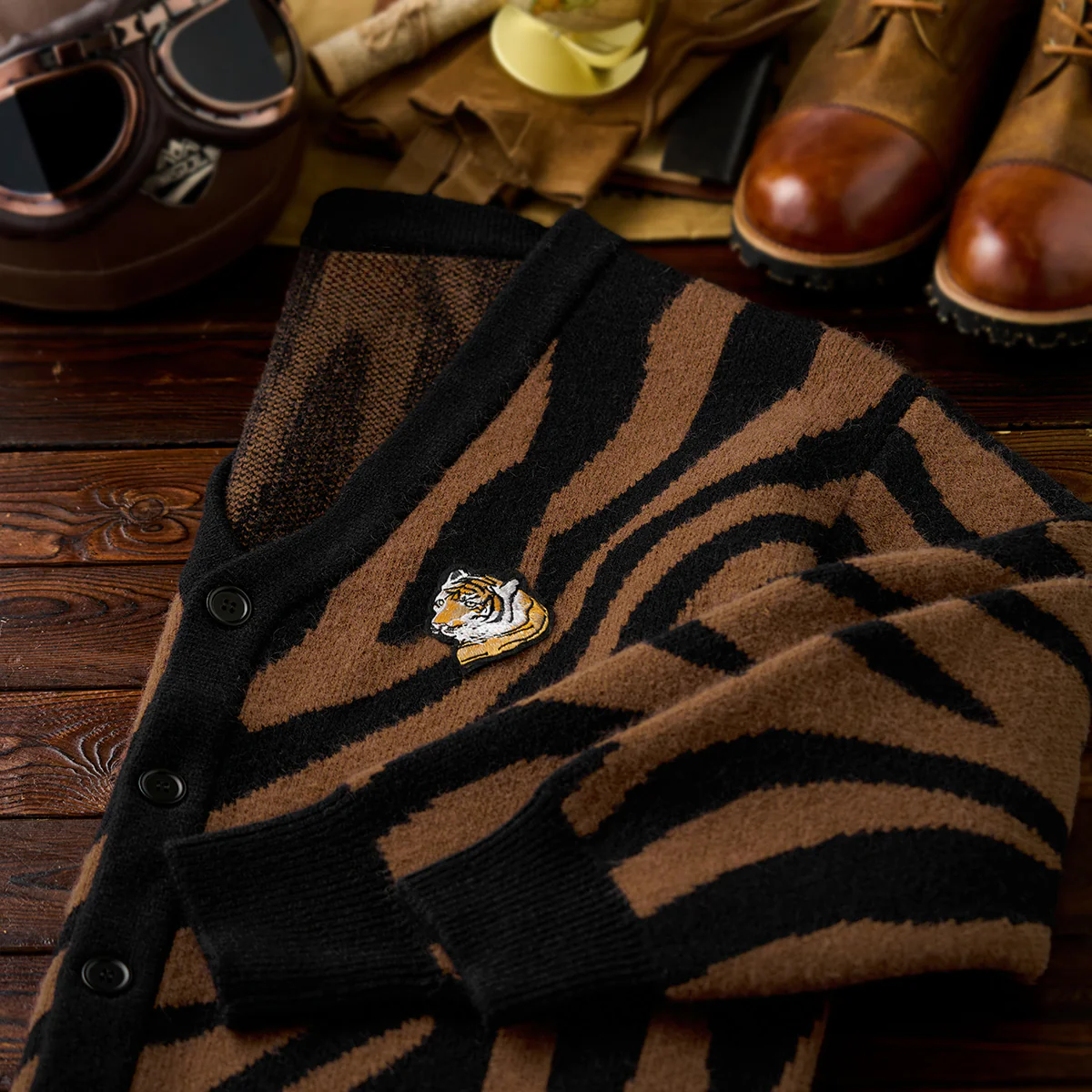 全体に施された虎柄のストライプは、力強さと存在感を与えています。ブラックとコーヒーの組み合わせが落ち着いた印象を与える一方、アニマルモチーフとしての大胆さも感じさせます。