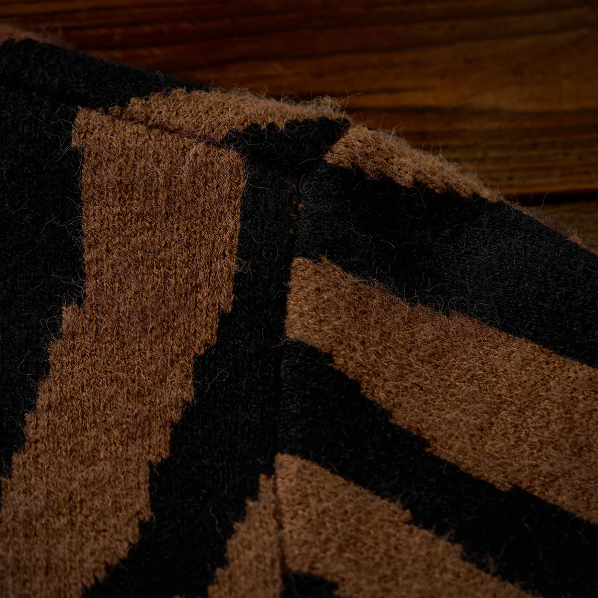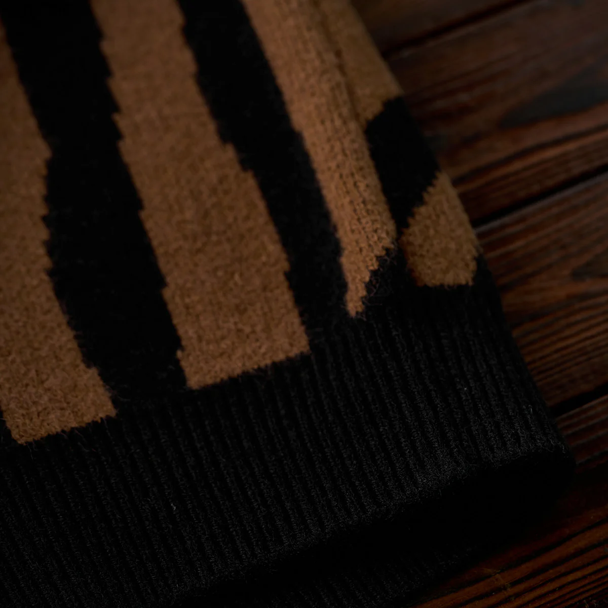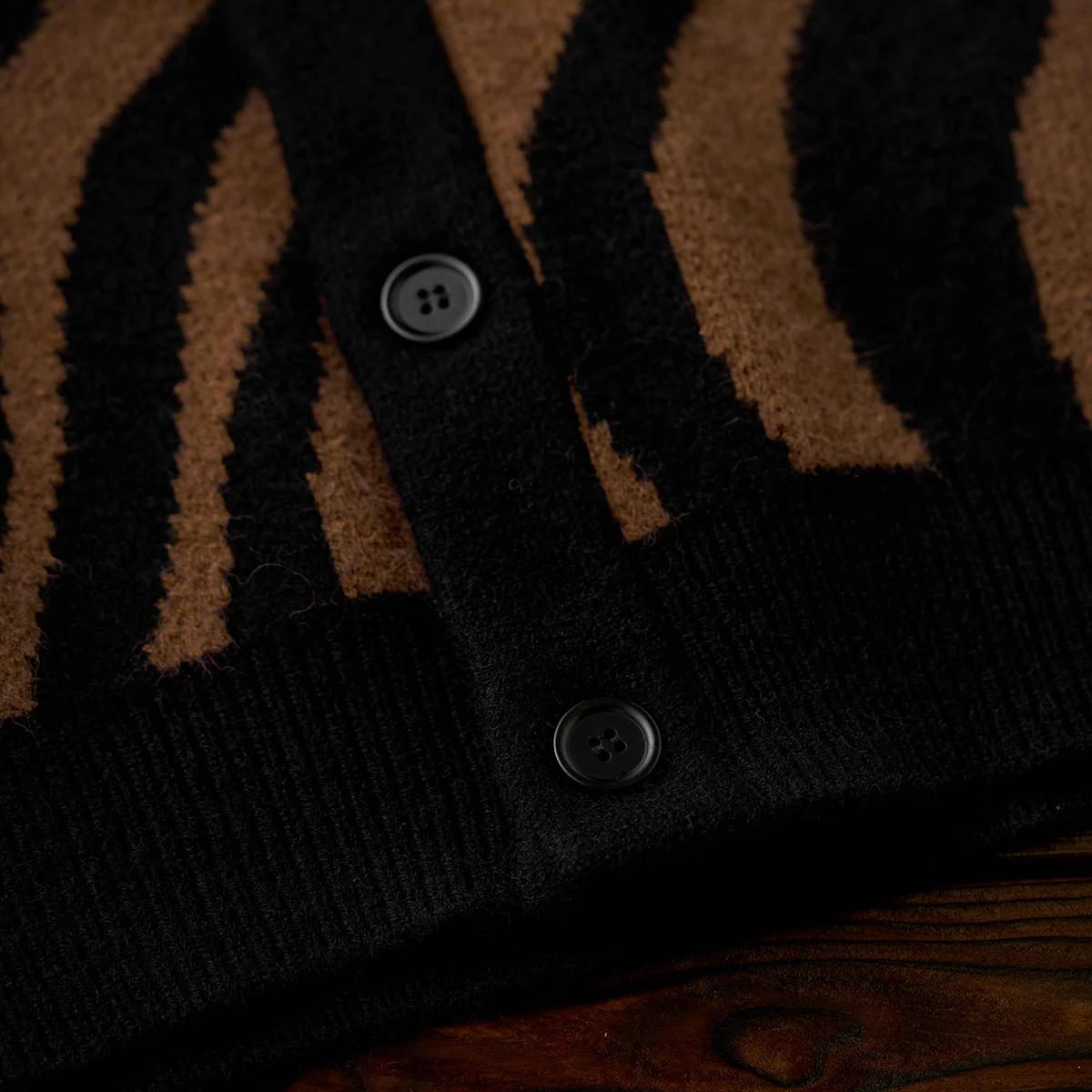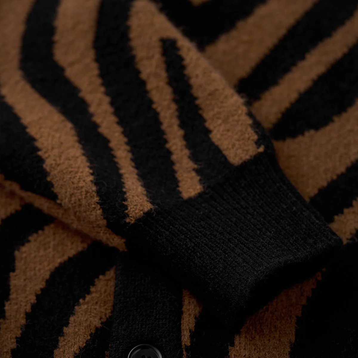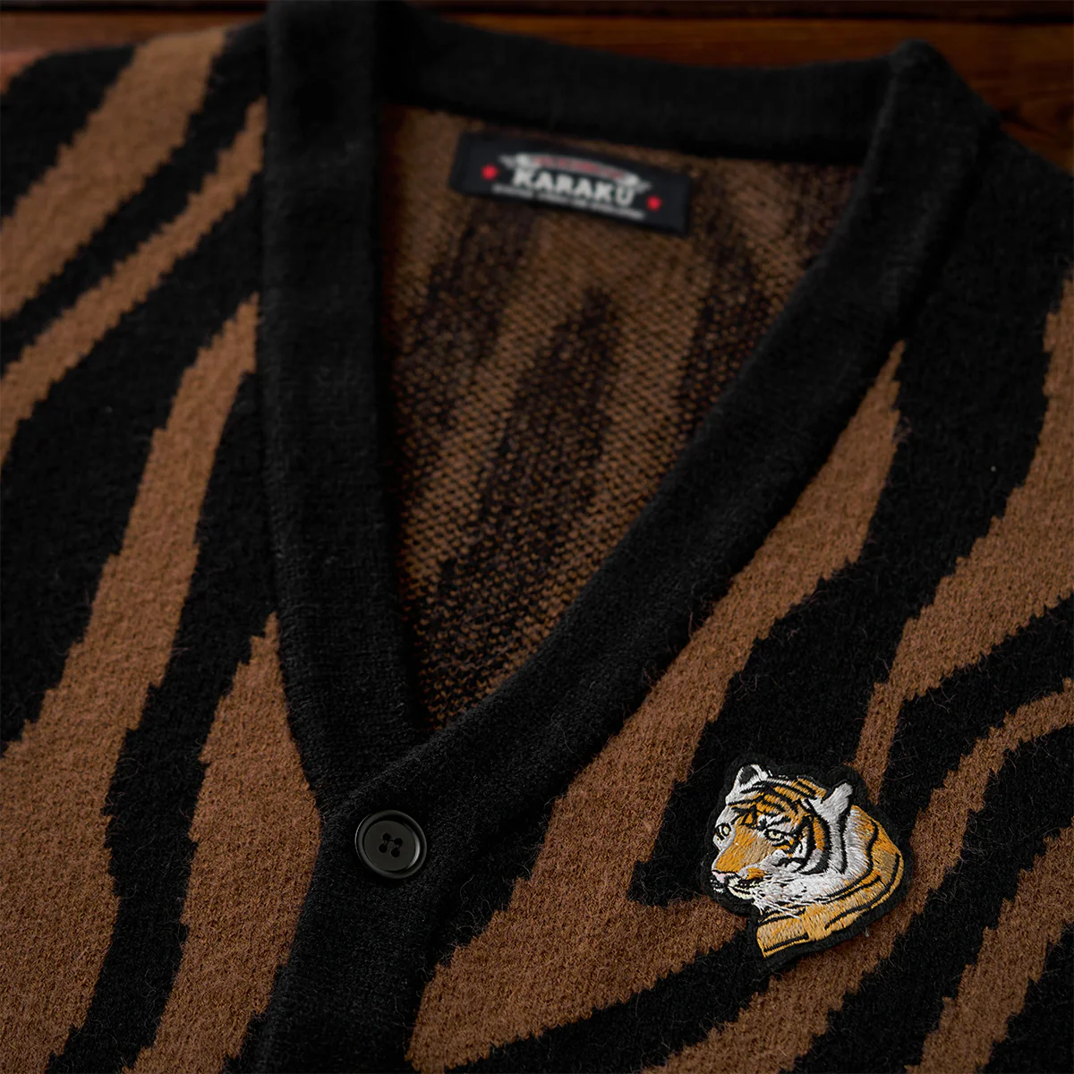 全体に施された虎柄のストライプは、力強さと存在感を与えています。ブラックとコーヒーの組み合わせが落ち着いた印象を与える一方、アニマルモチーフとしての大胆さも感じさせます。