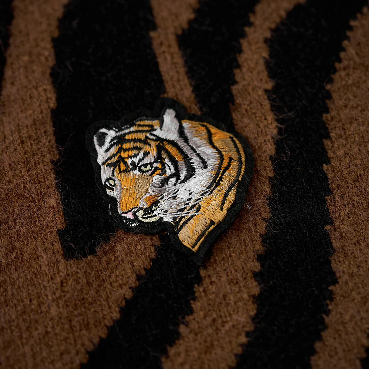 左胸部分にワンポイントで配置された虎の刺繡が、全体の虎柄と調和しつつ、視覚的なアクセントとなっています。刺繡のディテールは非常に繊細で、虎の表情や毛並みがリアルに描かれています。
