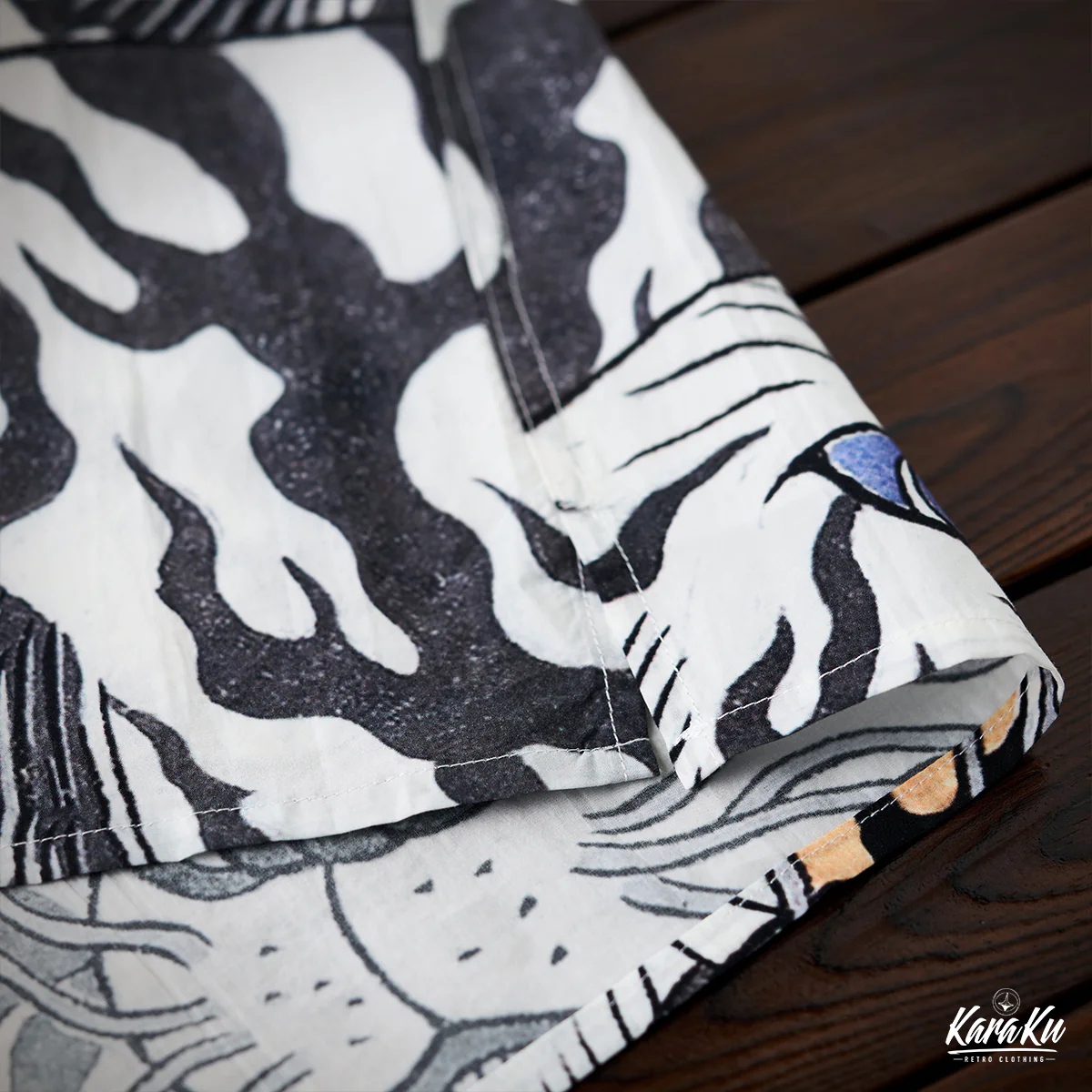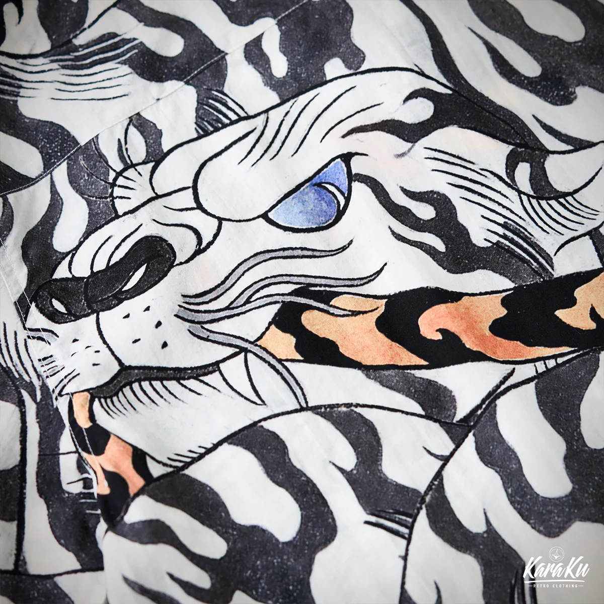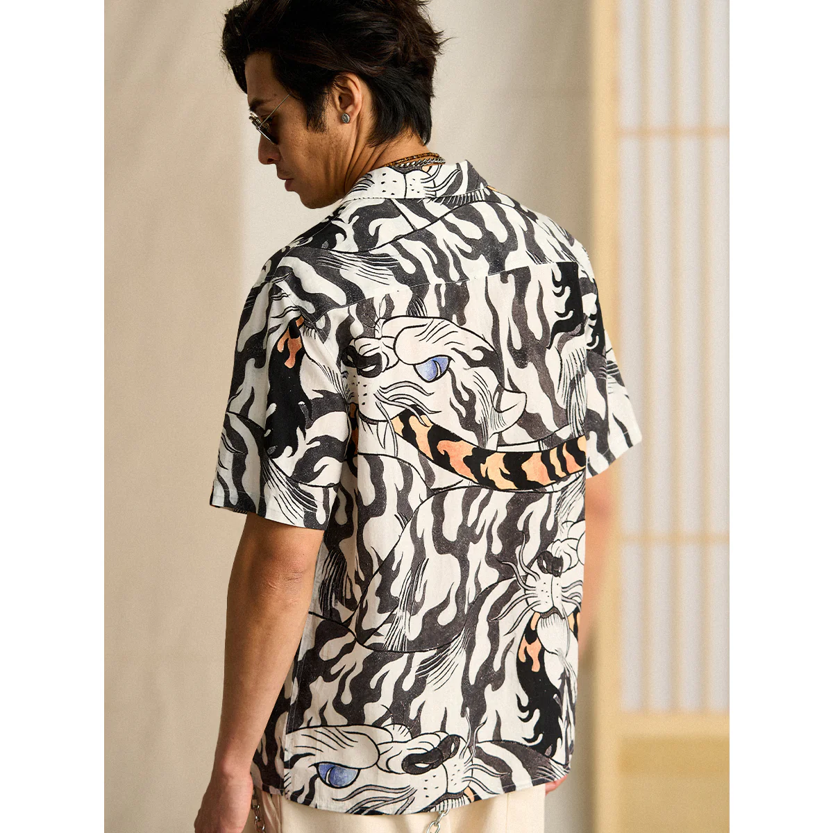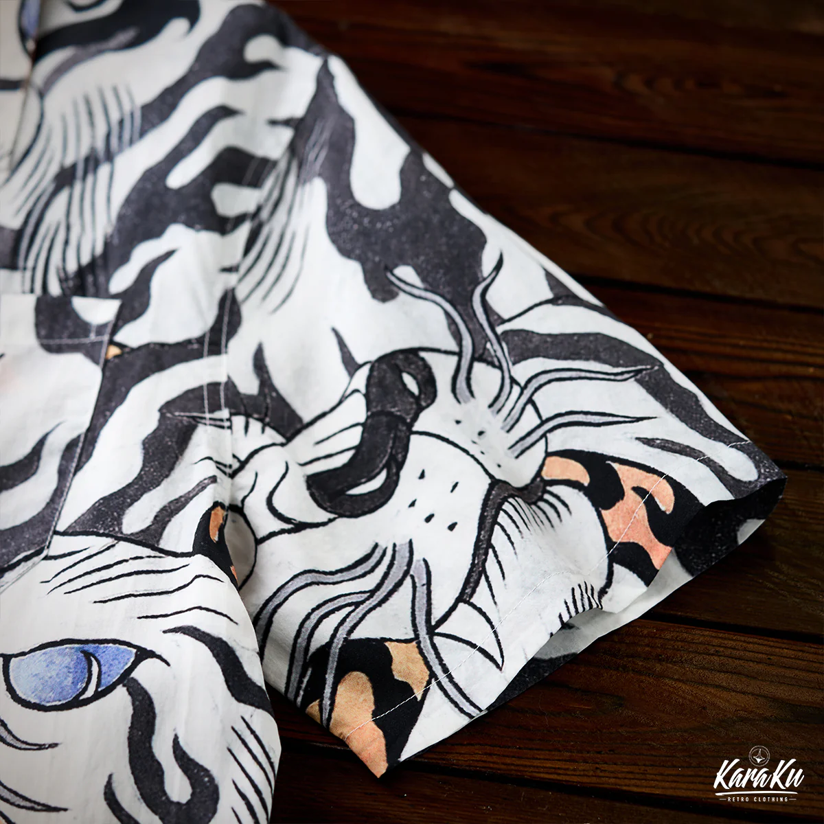 白く燃え上がるような縞模様をまとった白虎たちが、それぞれ前の虎のしっぽを噛みながら、力強く連なる――。石黒亜矢子氏による独創的な「しっぽを噛む白虎」の世界観を、シャツ全面に総柄プリントで表現しました。重なり合う白虎たちの視線やうねる尾が生み出す躍動感は、どこか神秘的なムードを漂わせます。落ち感のある生地にオープンカラーを合わせ、リラックス感たっぷりに仕上げました。遊び心と大人の抜け感を絶妙なバランスで楽しめる、KARAKUならではのオリジナルシャツです。