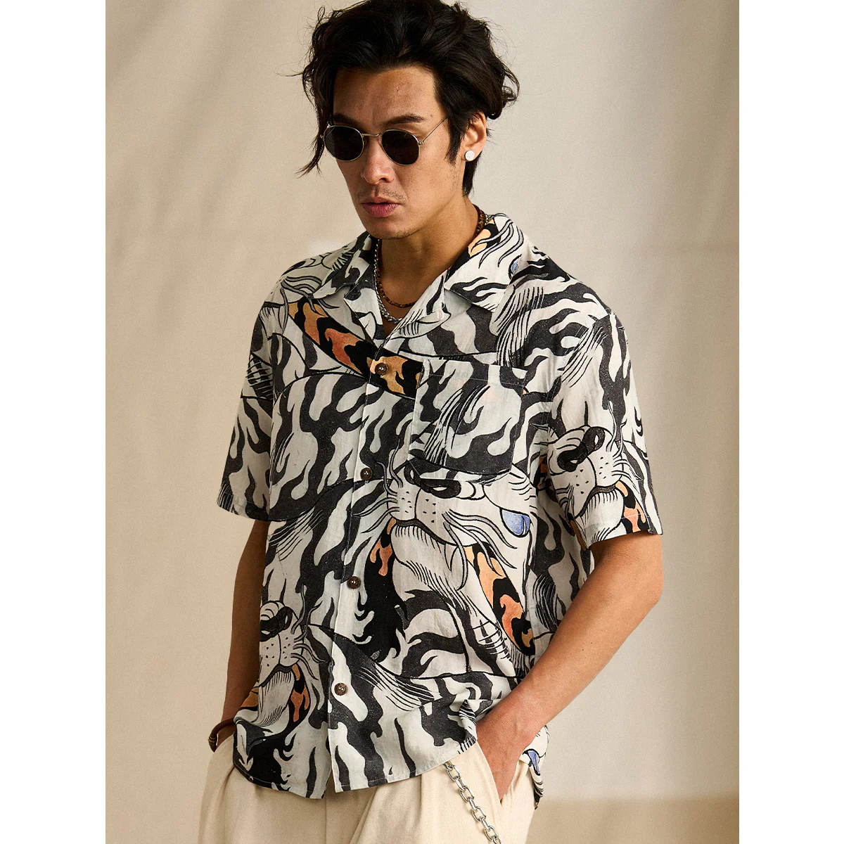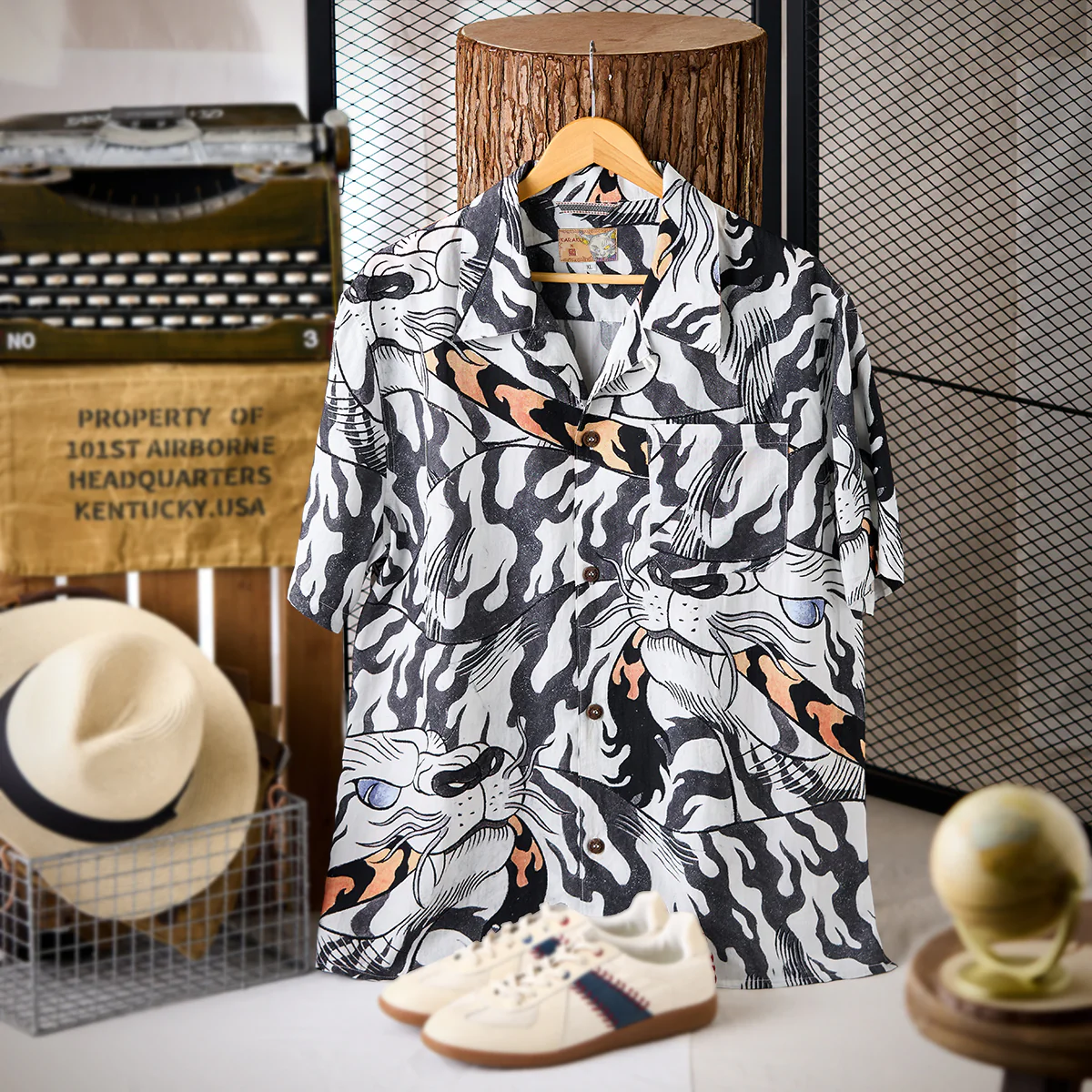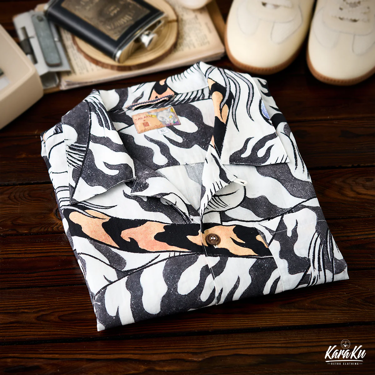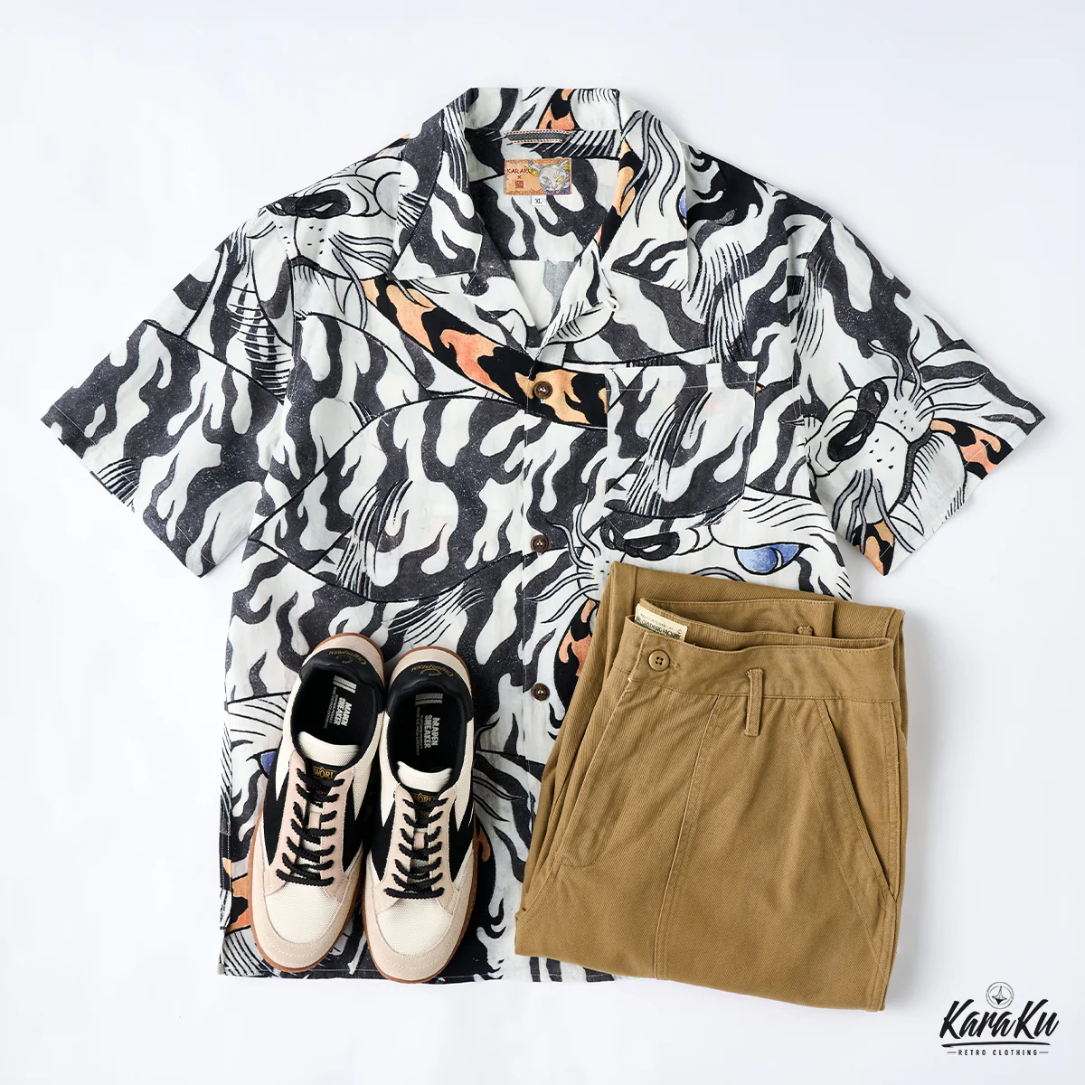 白く燃え上がるような縞模様をまとった白虎たちが、それぞれ前の虎のしっぽを噛みながら、力強く連なる――。石黒亜矢子氏による独創的な「しっぽを噛む白虎」の世界観を、シャツ全面に総柄プリントで表現しました。重なり合う白虎たちの視線やうねる尾が生み出す躍動感は、どこか神秘的なムードを漂わせます。落ち感のある生地にオープンカラーを合わせ、リラックス感たっぷりに仕上げました。遊び心と大人の抜け感を絶妙なバランスで楽しめる、KARAKUならではのオリジナルシャツです。