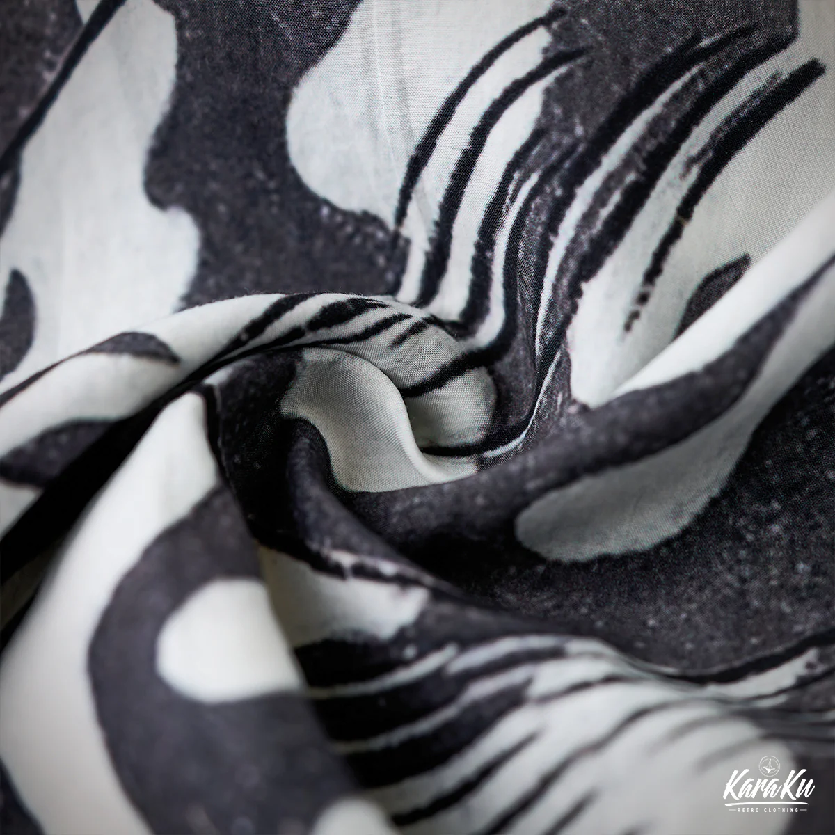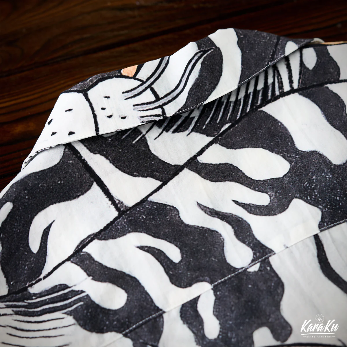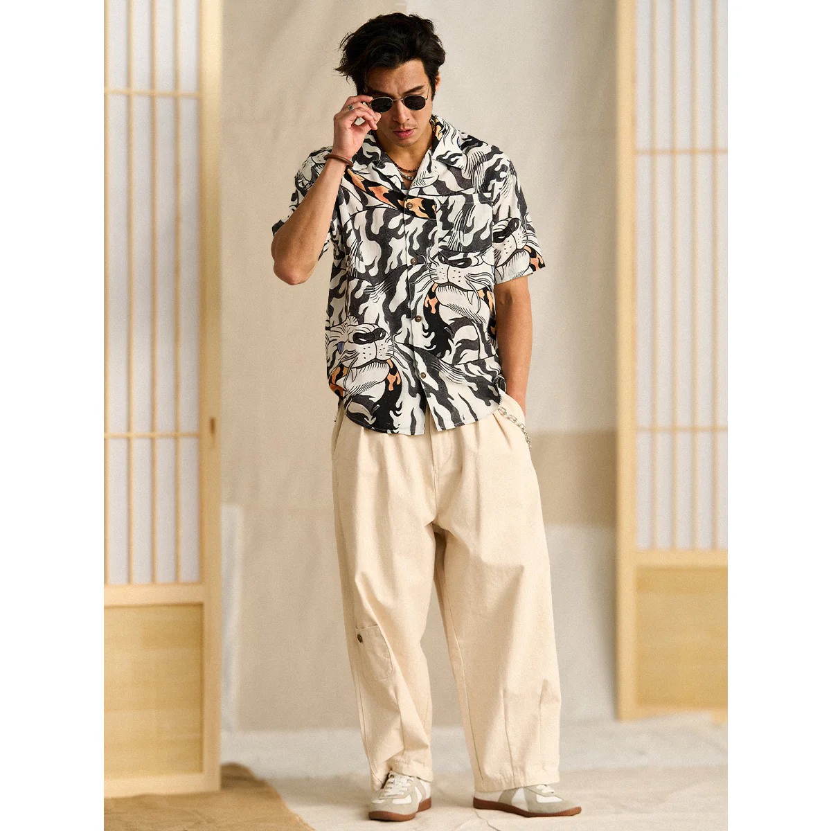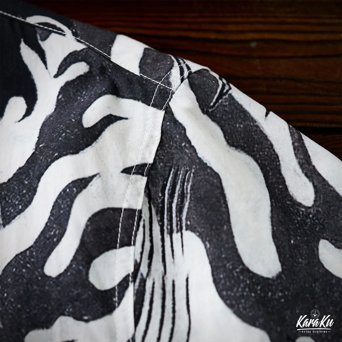 白く燃え上がるような縞模様をまとった白虎たちが、それぞれ前の虎のしっぽを噛みながら、力強く連なる――。石黒亜矢子氏による独創的な「しっぽを噛む白虎」の世界観を、シャツ全面に総柄プリントで表現しました。重なり合う白虎たちの視線やうねる尾が生み出す躍動感は、どこか神秘的なムードを漂わせます。落ち感のある生地にオープンカラーを合わせ、リラックス感たっぷりに仕上げました。遊び心と大人の抜け感を絶妙なバランスで楽しめる、KARAKUならではのオリジナルシャツです。