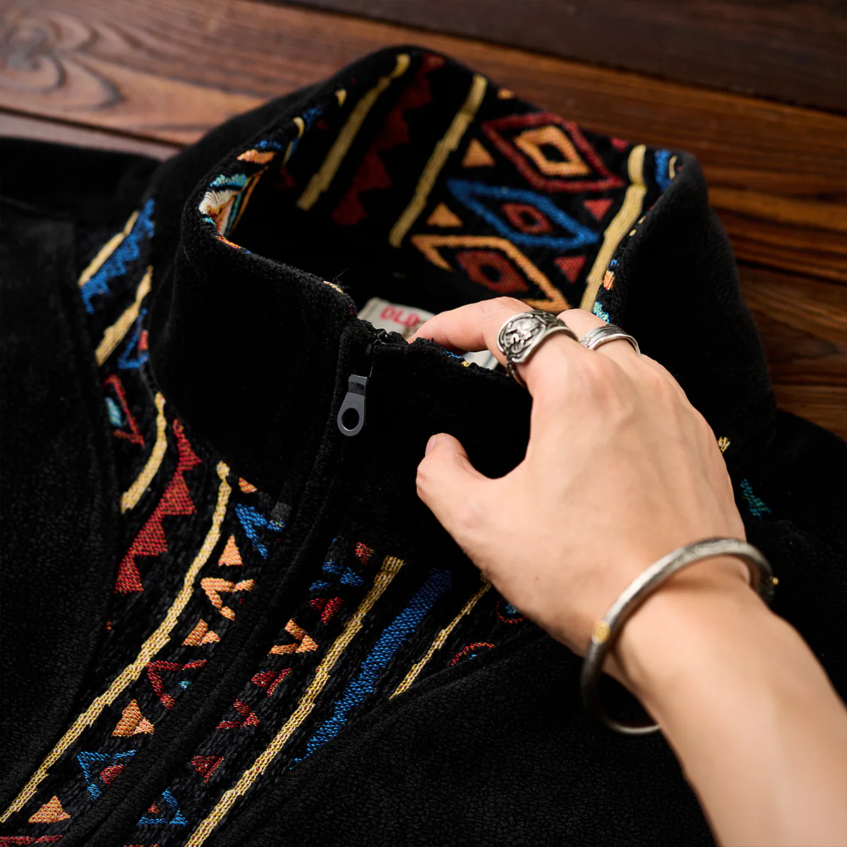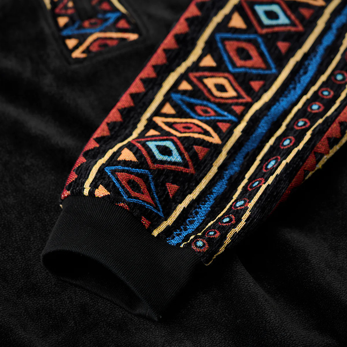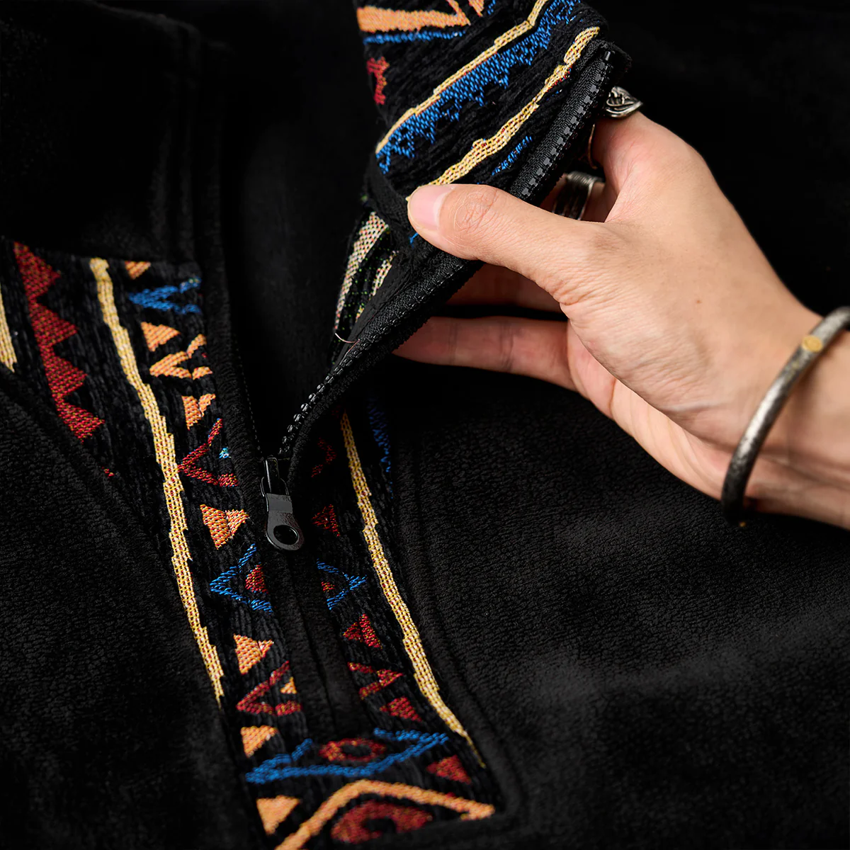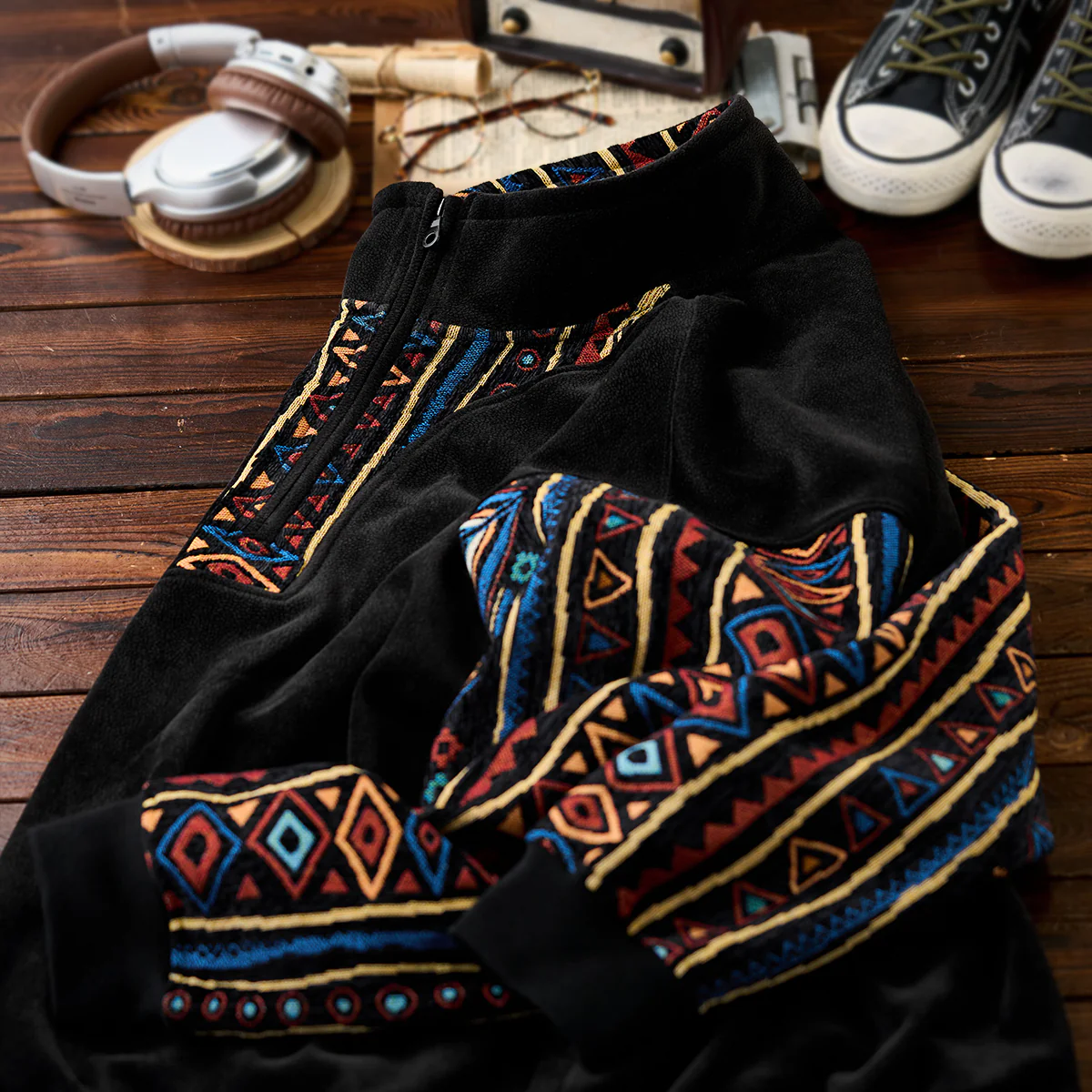 暖かみのあるポーラーフリースをベースに、袖にはシェニール素材を採用。その上から民族調のジャカード柄を織り込むことで、独特の立体感と重厚な表情を生み出しました。異素材のコンビネーションが目を引くデザインで、シンプルなシルエットながらも存在感抜群。ハーフジップ仕様により温度調整が容易で、アウトドアからタウンユースまで幅広く対応します。伝統的な民族モチーフと現代的なスポーティー要素が融合した、秋冬シーズンの主役となる一着です。