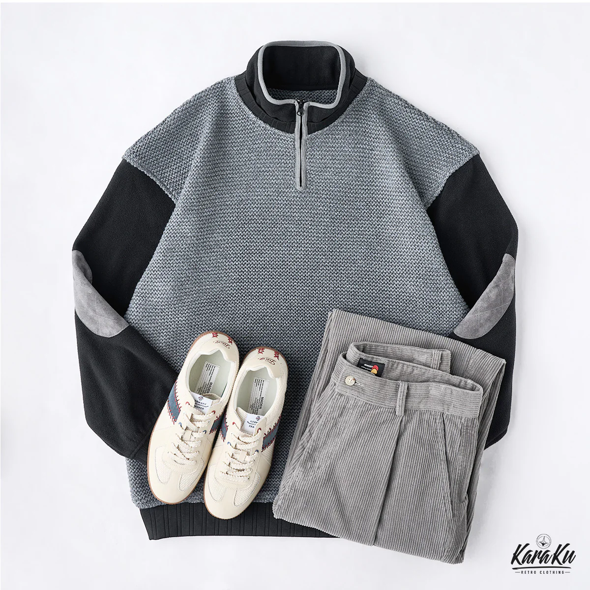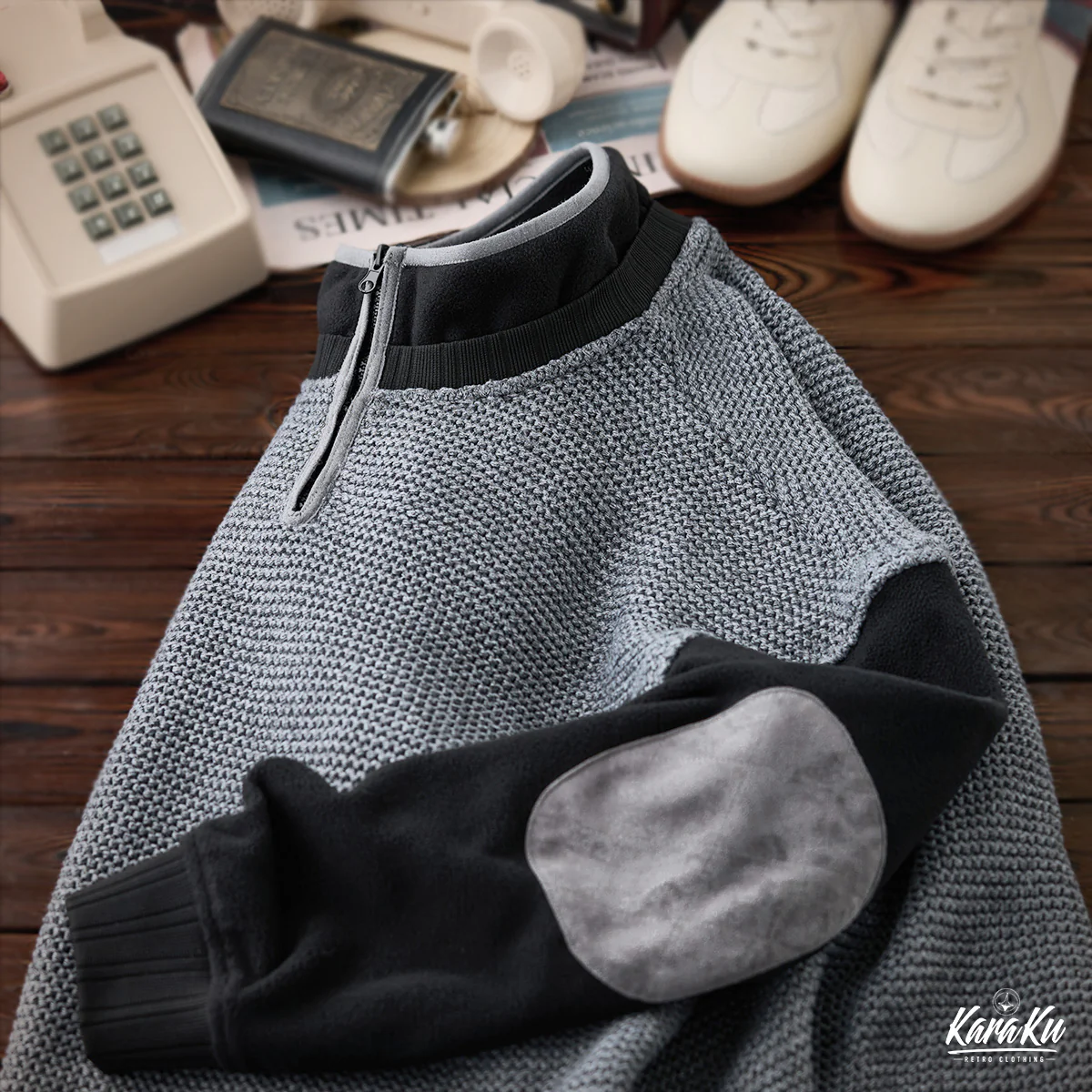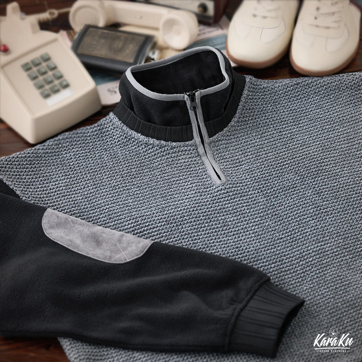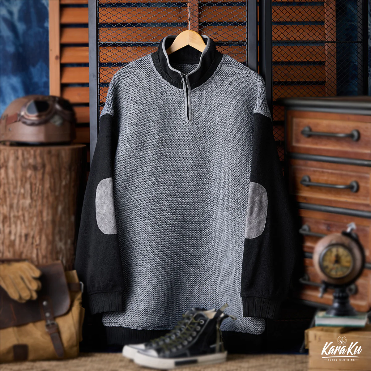 • 肘パッチ パイナップルパイルニット&フリース切替スタンドカラースウェット