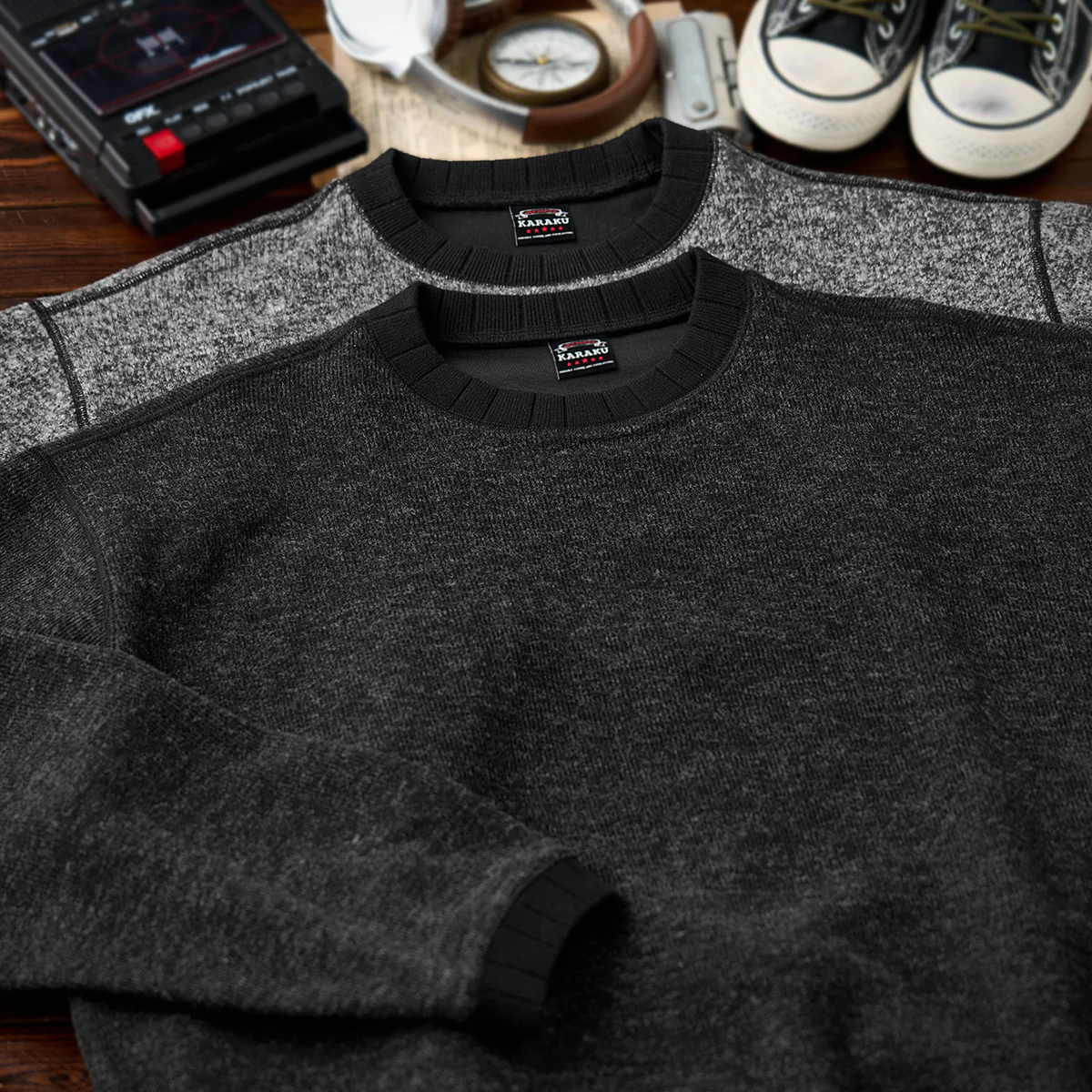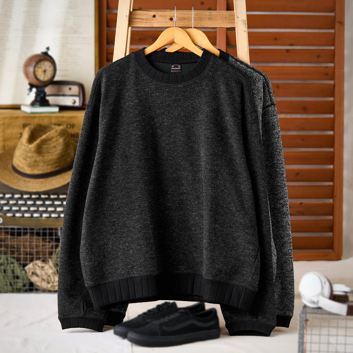 ブラックとグレーの2色展開で、どちらも落ち着いた色合い。 ヴィンテージ感のある色合いは、様々なボトムスと合わせやすく、コーディネートしやすい。