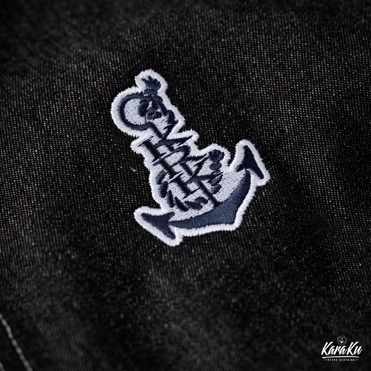 左胸元にイカリの刺繍は、マリンテイストを象徴する。  繊細な刺繍であれば、上品な印象になり、太い糸を使った刺繍であれば、よりカジュアルな印象になる。