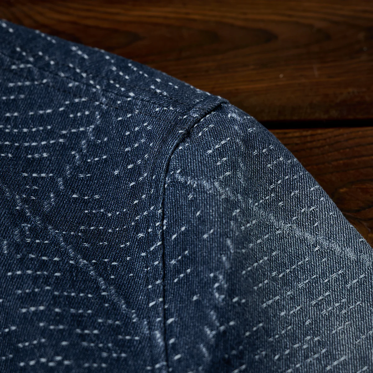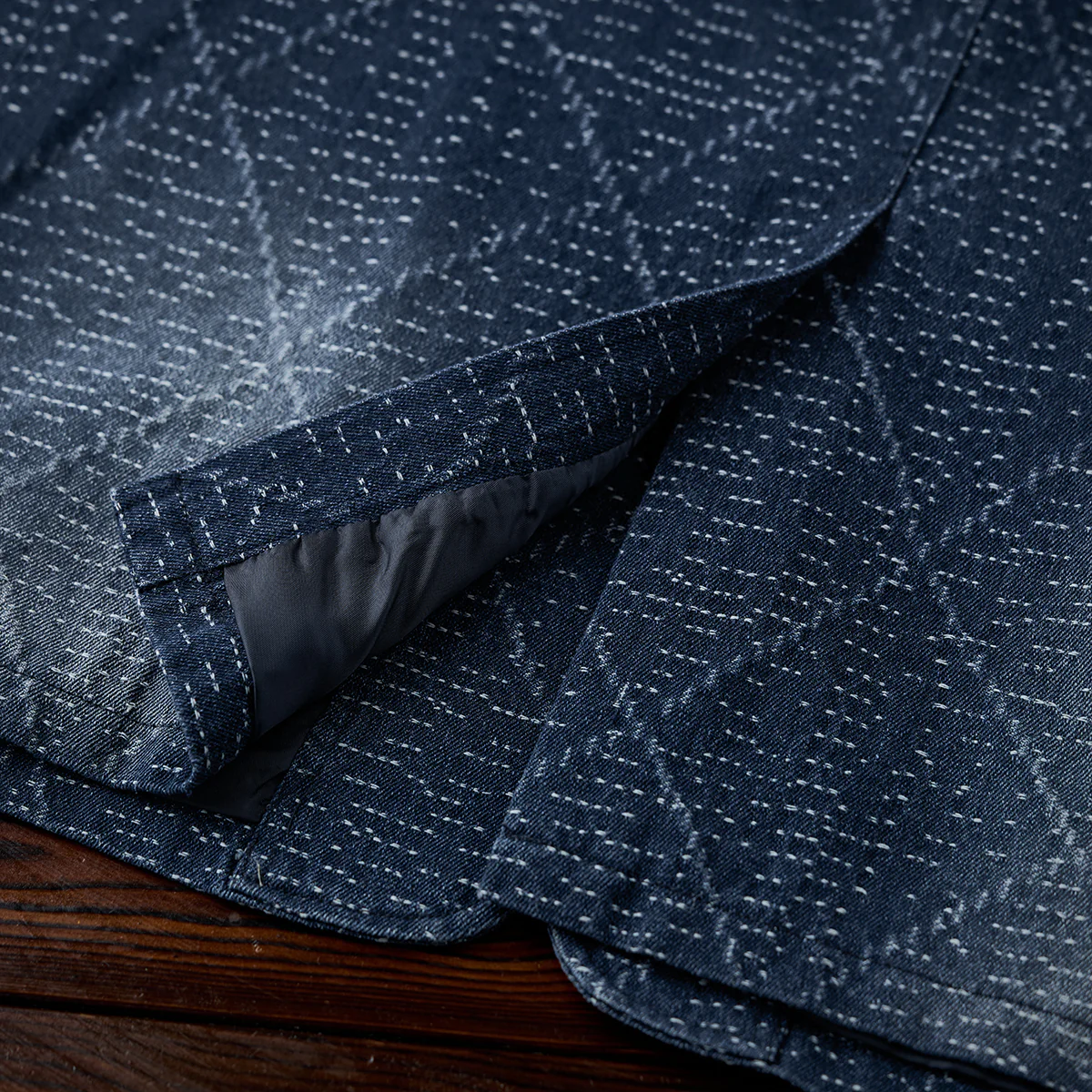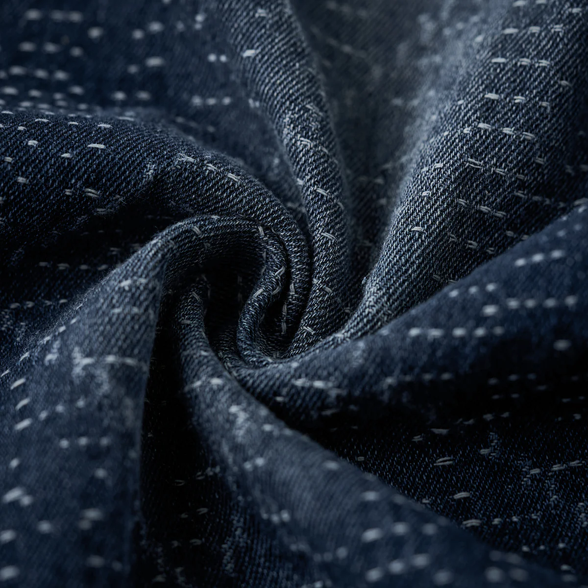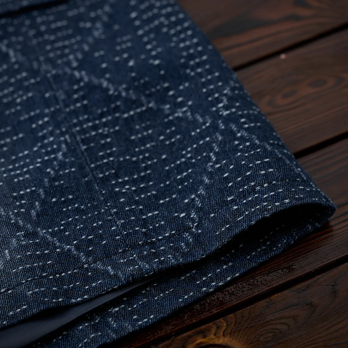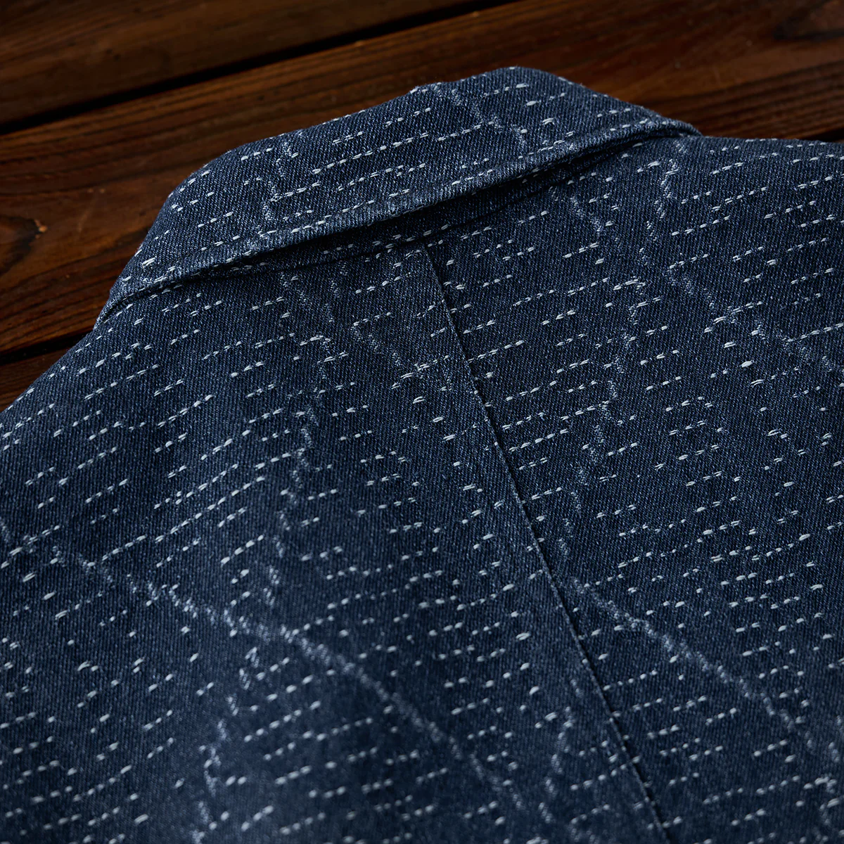 デニム生地に複雑な幾何学模様がジャガード織りで施されています。伝統的な刺し子や和柄を想起させる織り模様が特徴的で、テクスチャー感があり、視覚的にも触覚的にも豊かなデザインです。