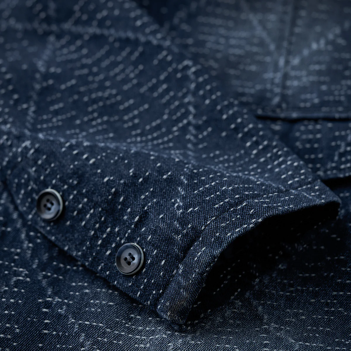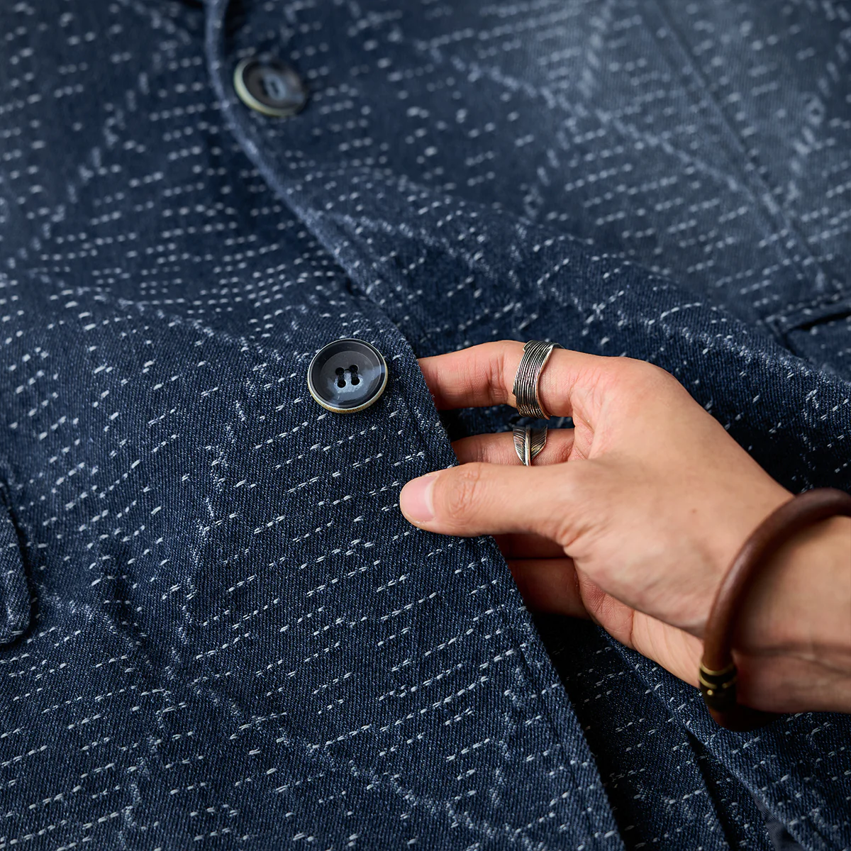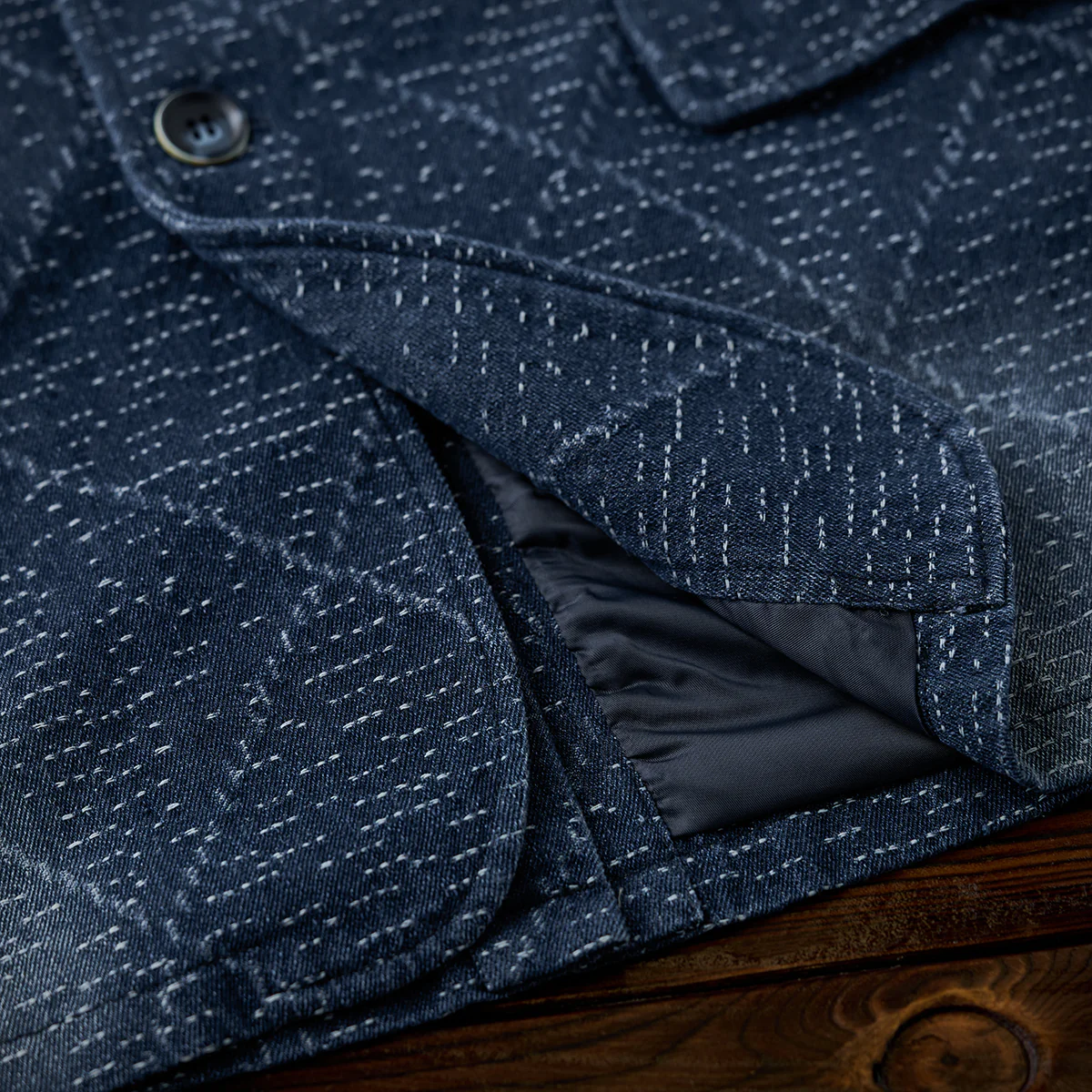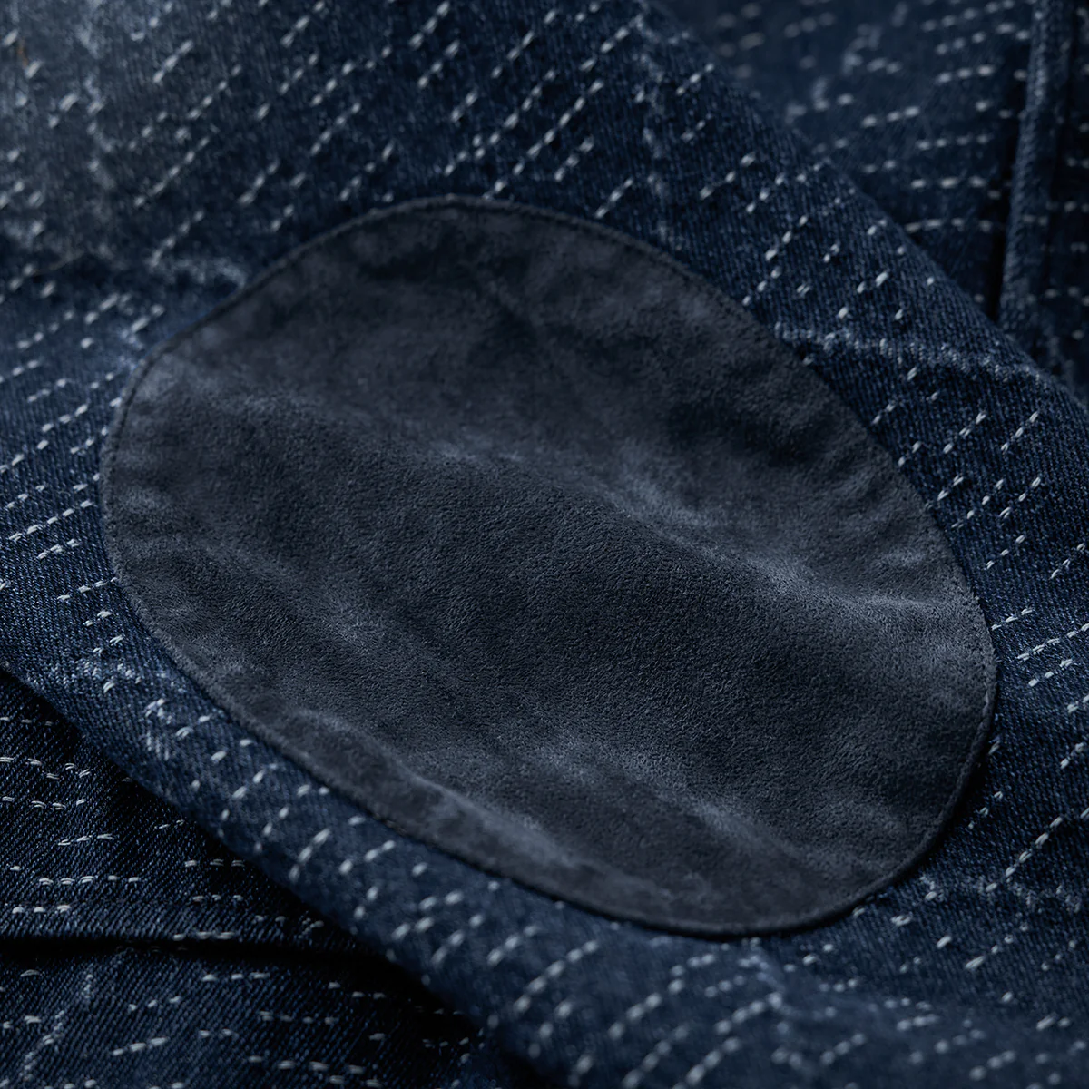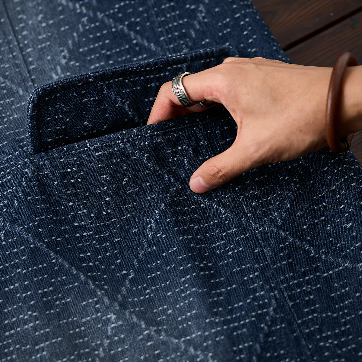 デニム生地に複雑な幾何学模様がジャガード織りで施されています。伝統的な刺し子や和柄を想起させる織り模様が特徴的で、テクスチャー感があり、視覚的にも触覚的にも豊かなデザインです。