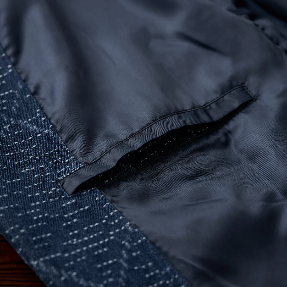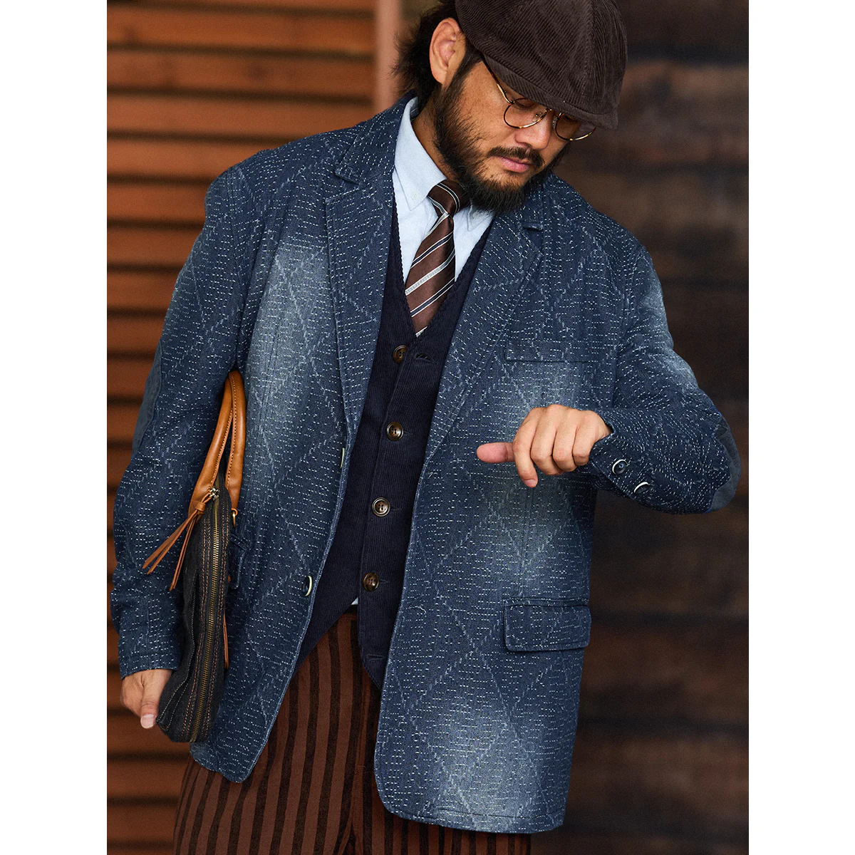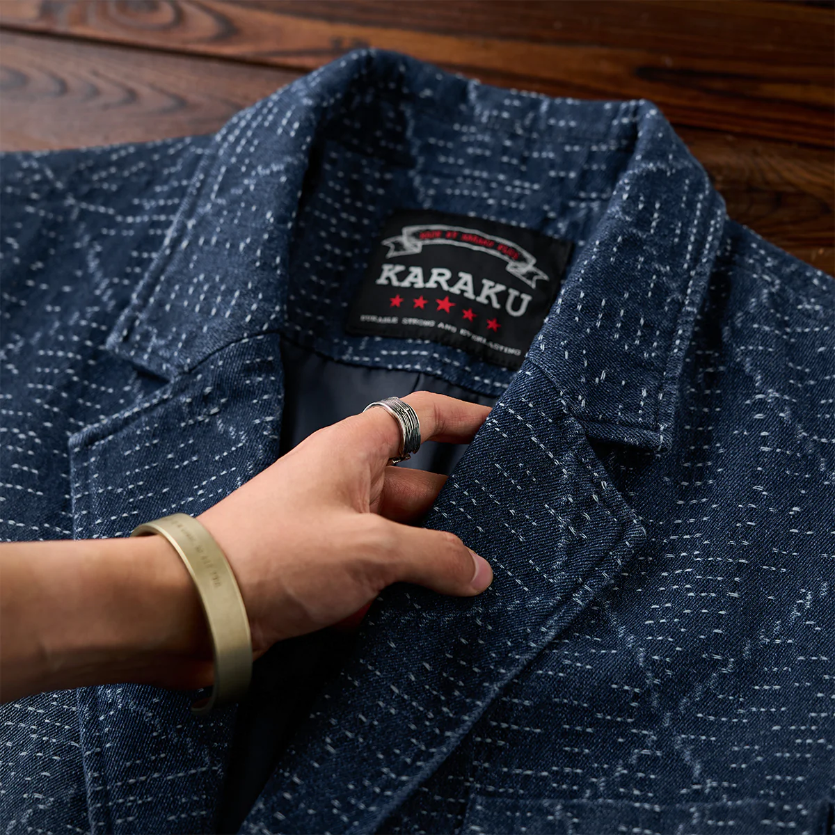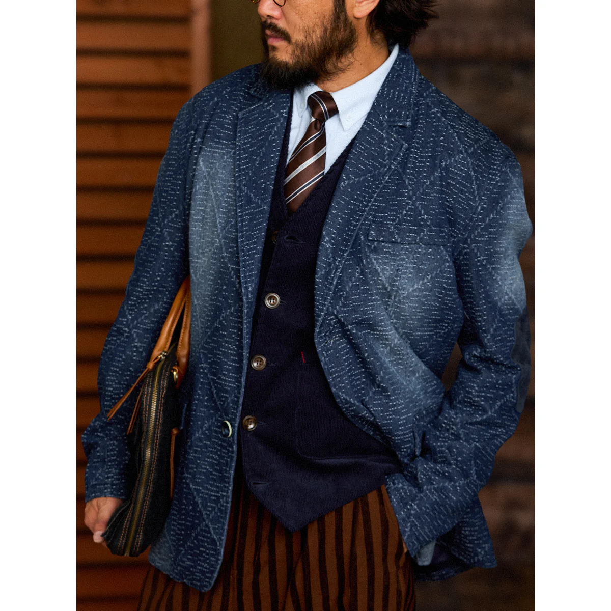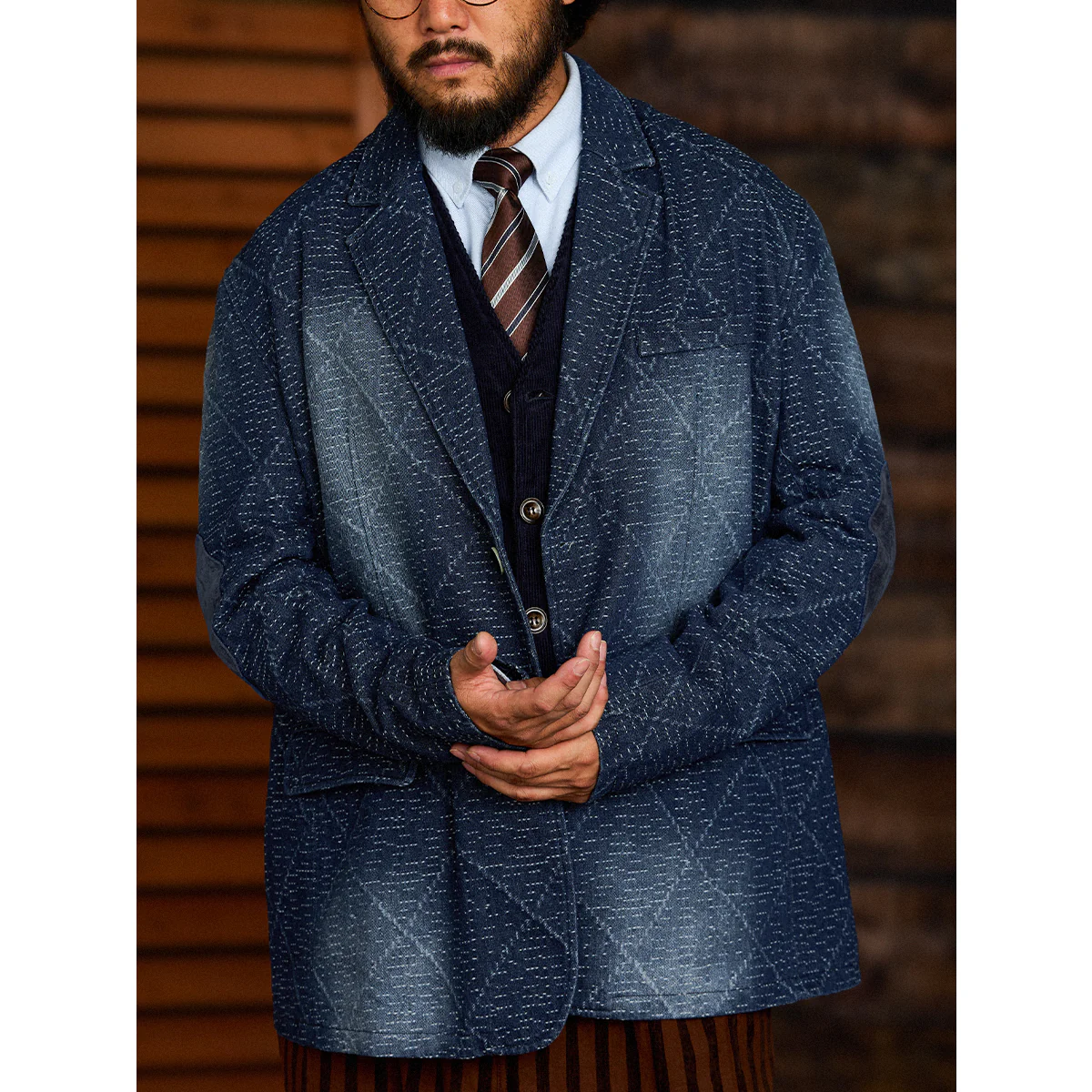 デニム生地に複雑な幾何学模様がジャガード織りで施されています。伝統的な刺し子や和柄を想起させる織り模様が特徴的で、テクスチャー感があり、視覚的にも触覚的にも豊かなデザインです。