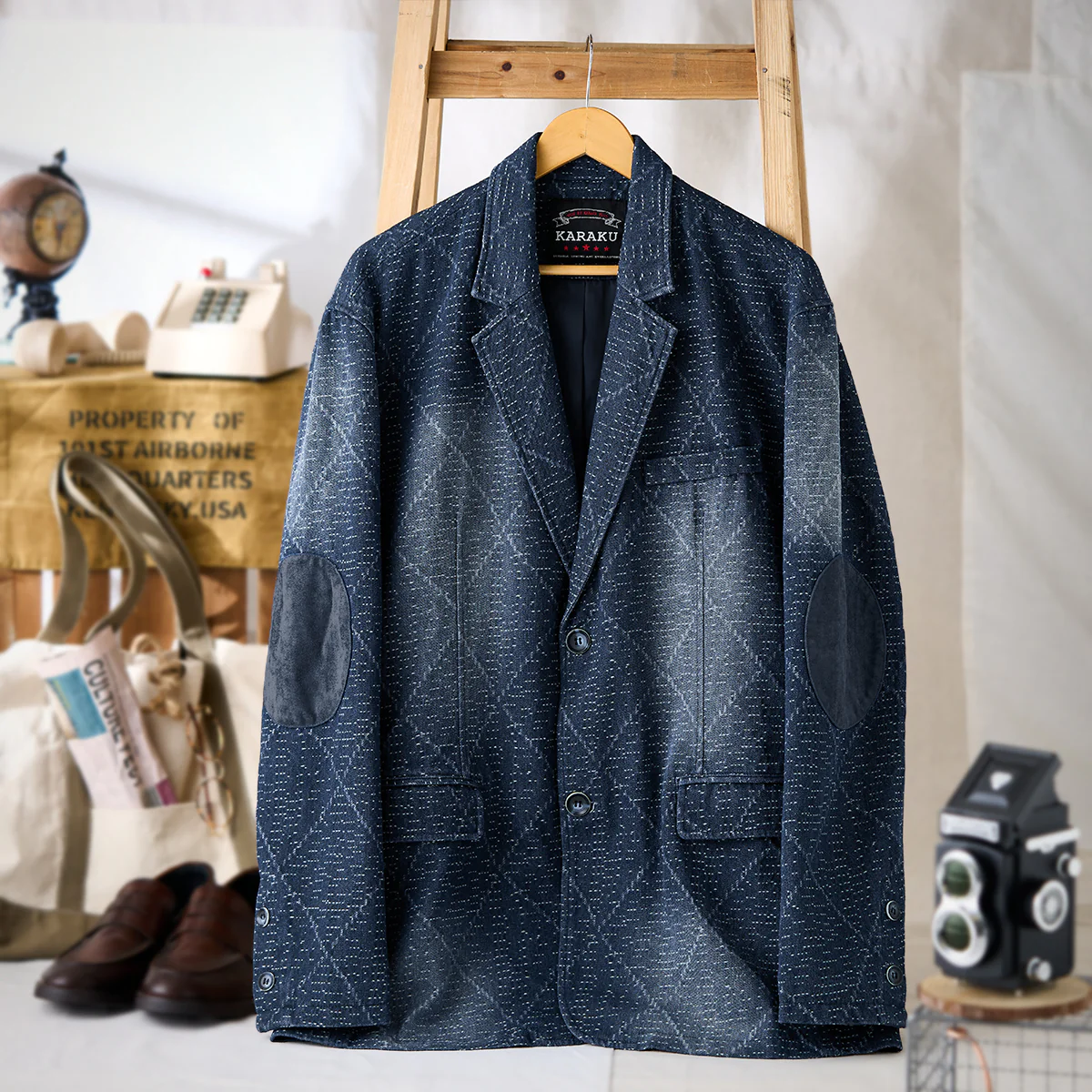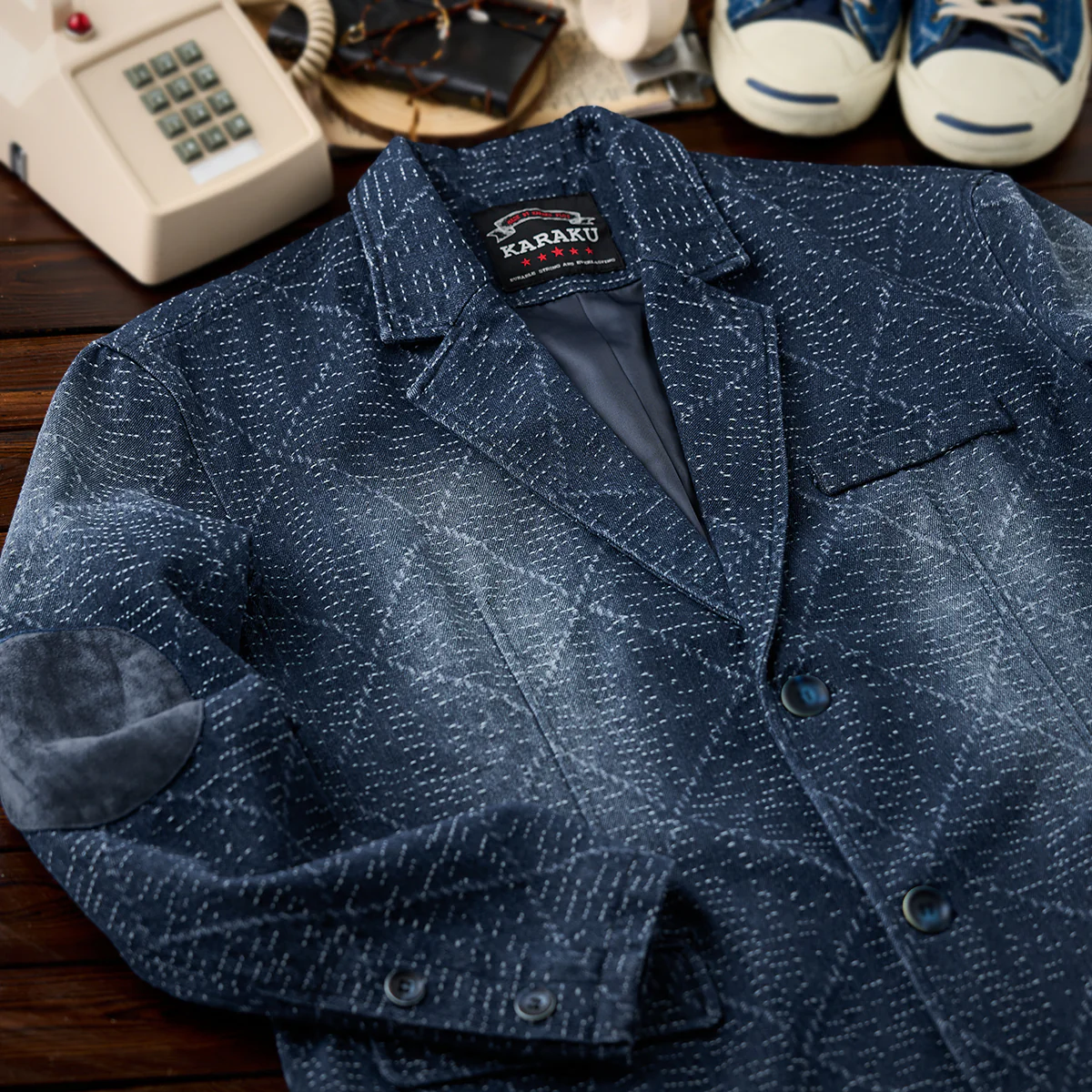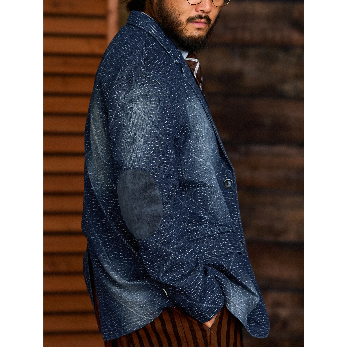 シンプルなボタンフロントで、伝統的なテーラードスタイルを踏襲。胸ポケットと両サイドのフラップポケットが追加され、機能性を確保。丸型のスエードパッチが両肘に付いて、クラシックなテーラードの要素を取り入れています。これにより耐久性が増し、デザイン性も高まっています。