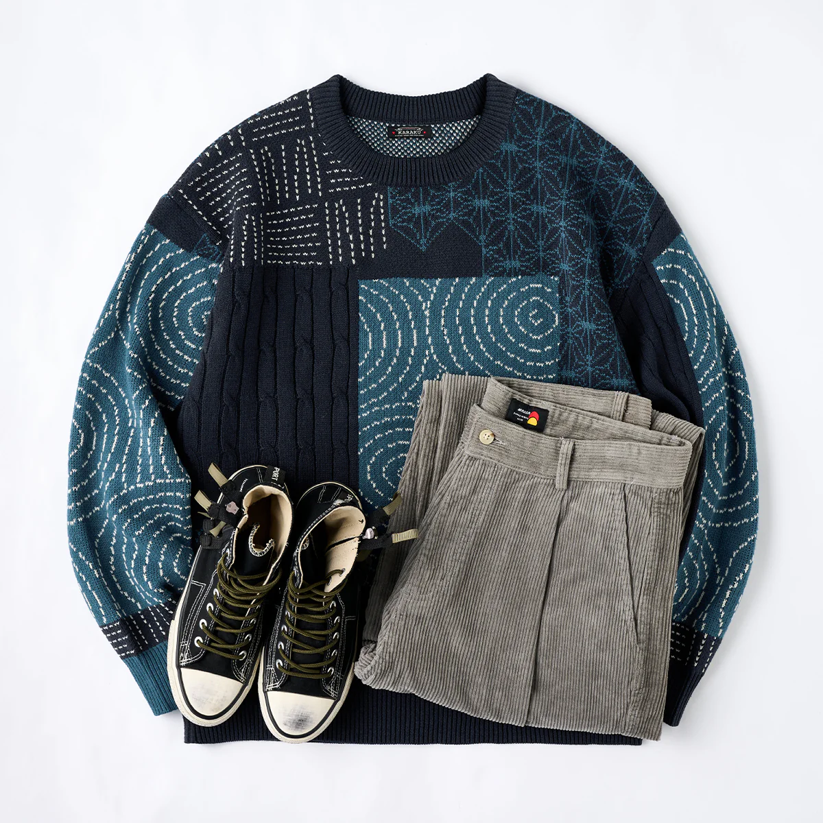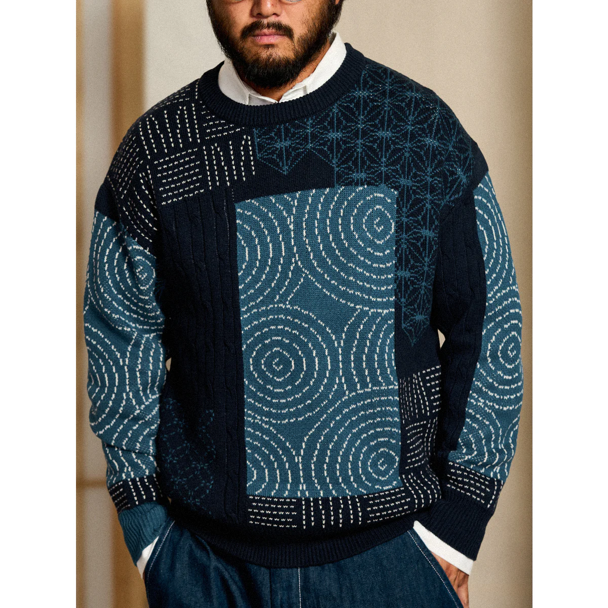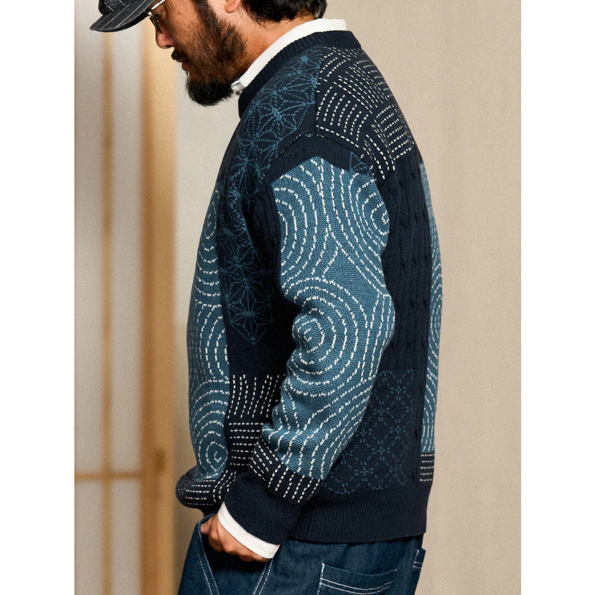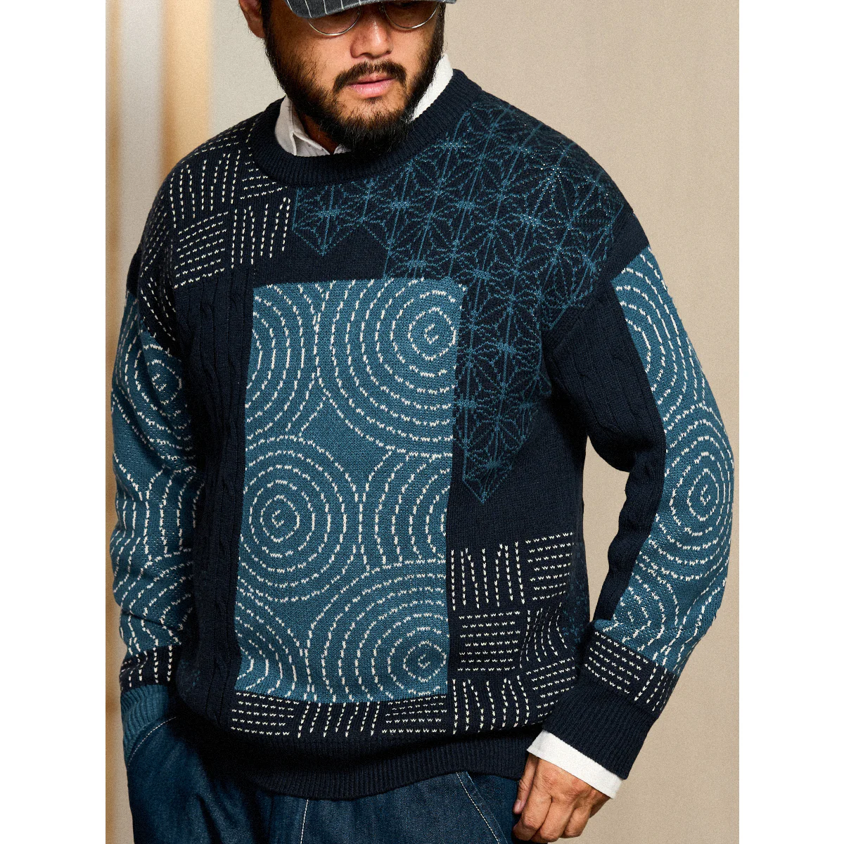 左胸と袖周りには、伝統的なケーブル編みが施されています。和柄の平面的なデザインと、ケーブル編みの立体感の対比が、視覚的な奥行きを生み出しています。