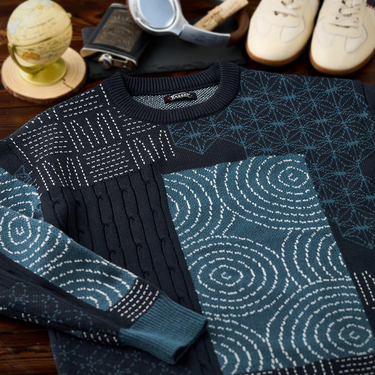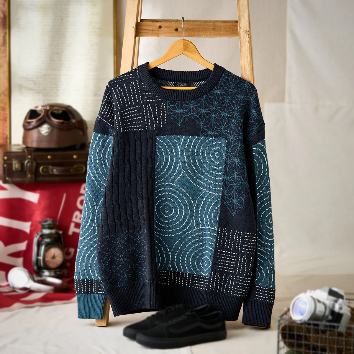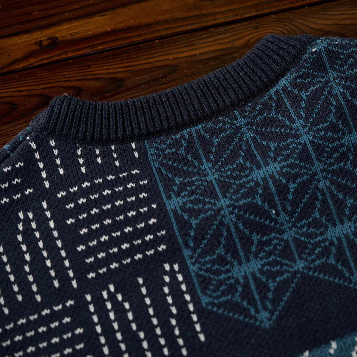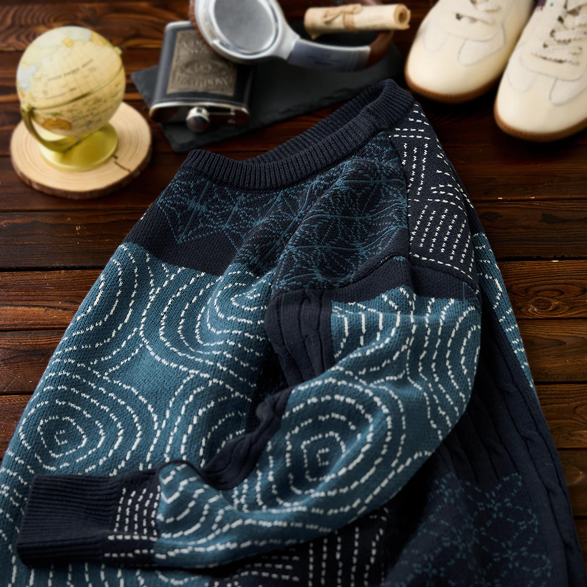 左胸と袖周りには、伝統的なケーブル編みが施されています。和柄の平面的なデザインと、ケーブル編みの立体感の対比が、視覚的な奥行きを生み出しています。