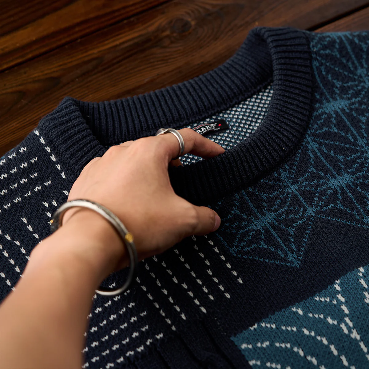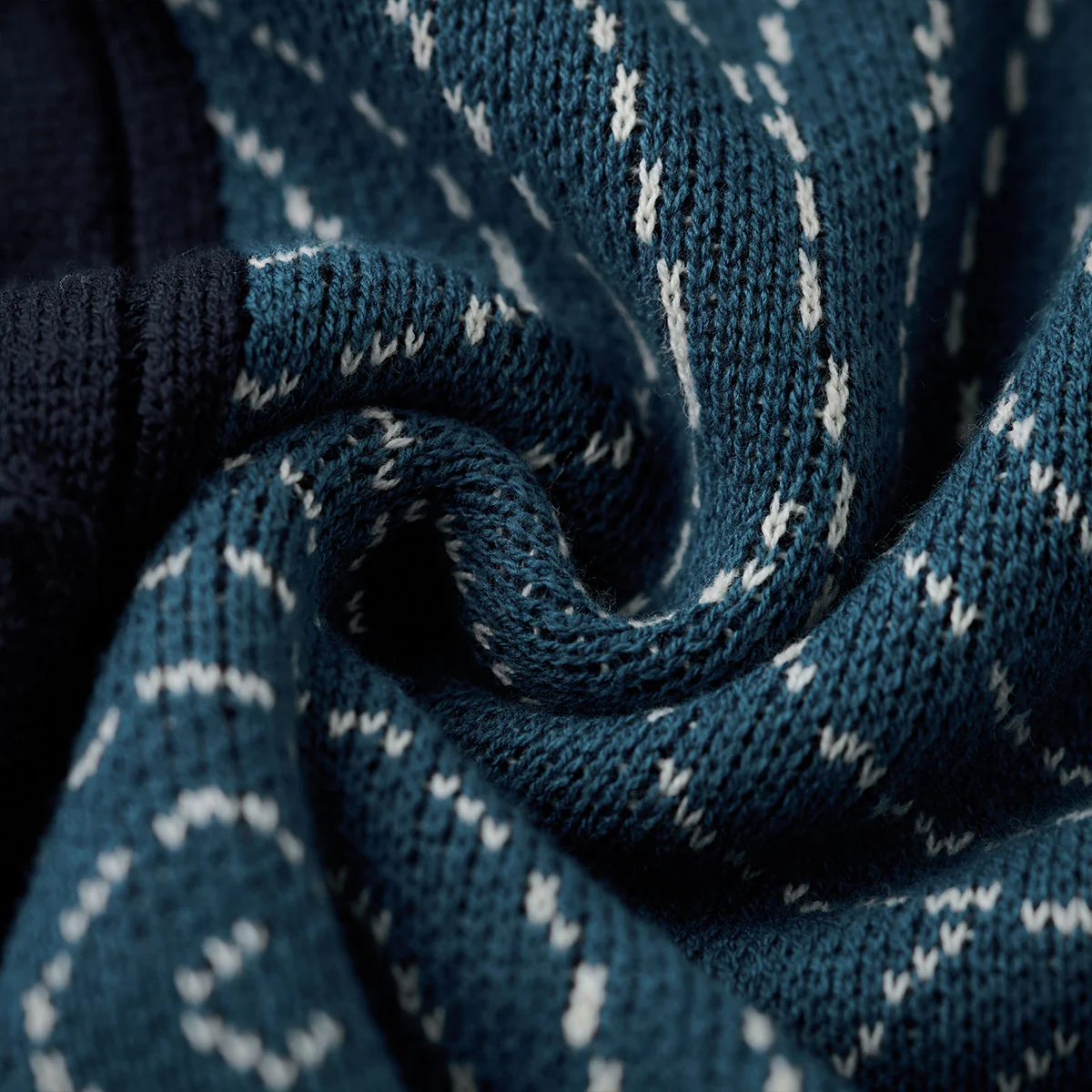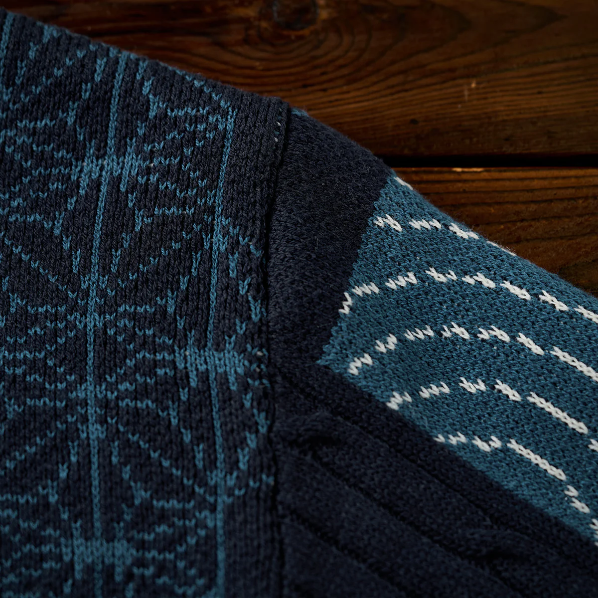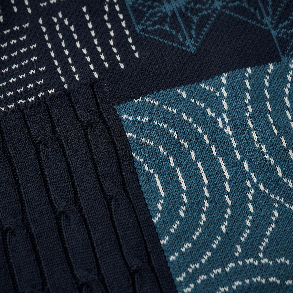左胸と袖周りには、伝統的なケーブル編みが施されています。和柄の平面的なデザインと、ケーブル編みの立体感の対比が、視覚的な奥行きを生み出しています。