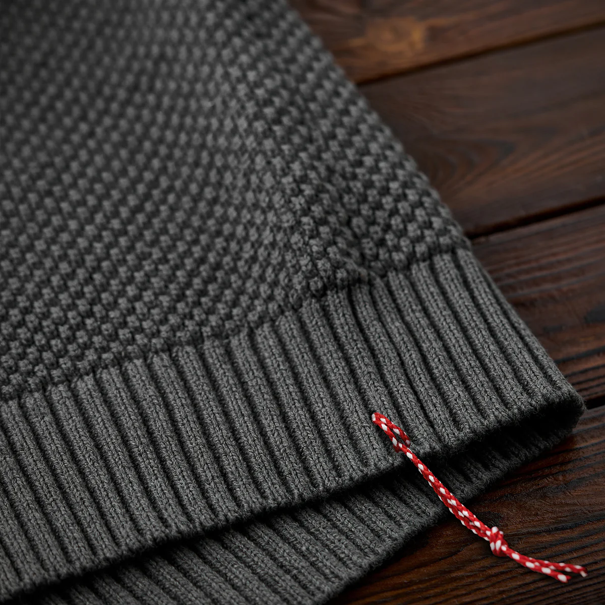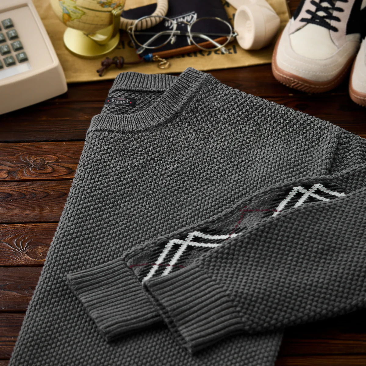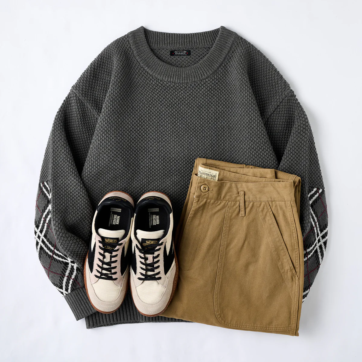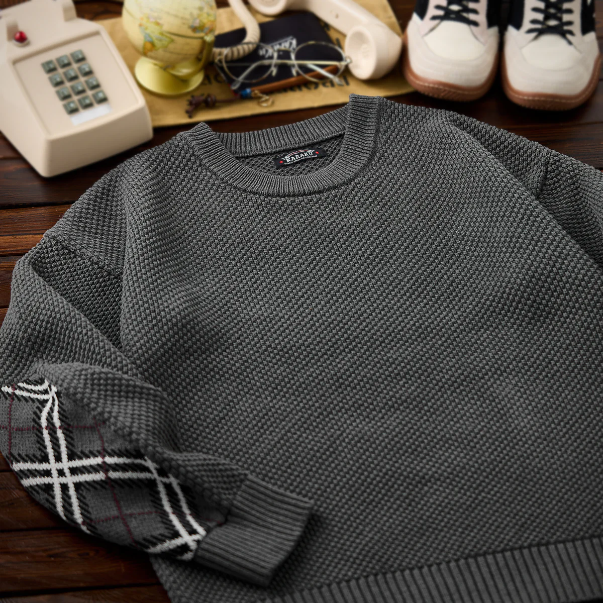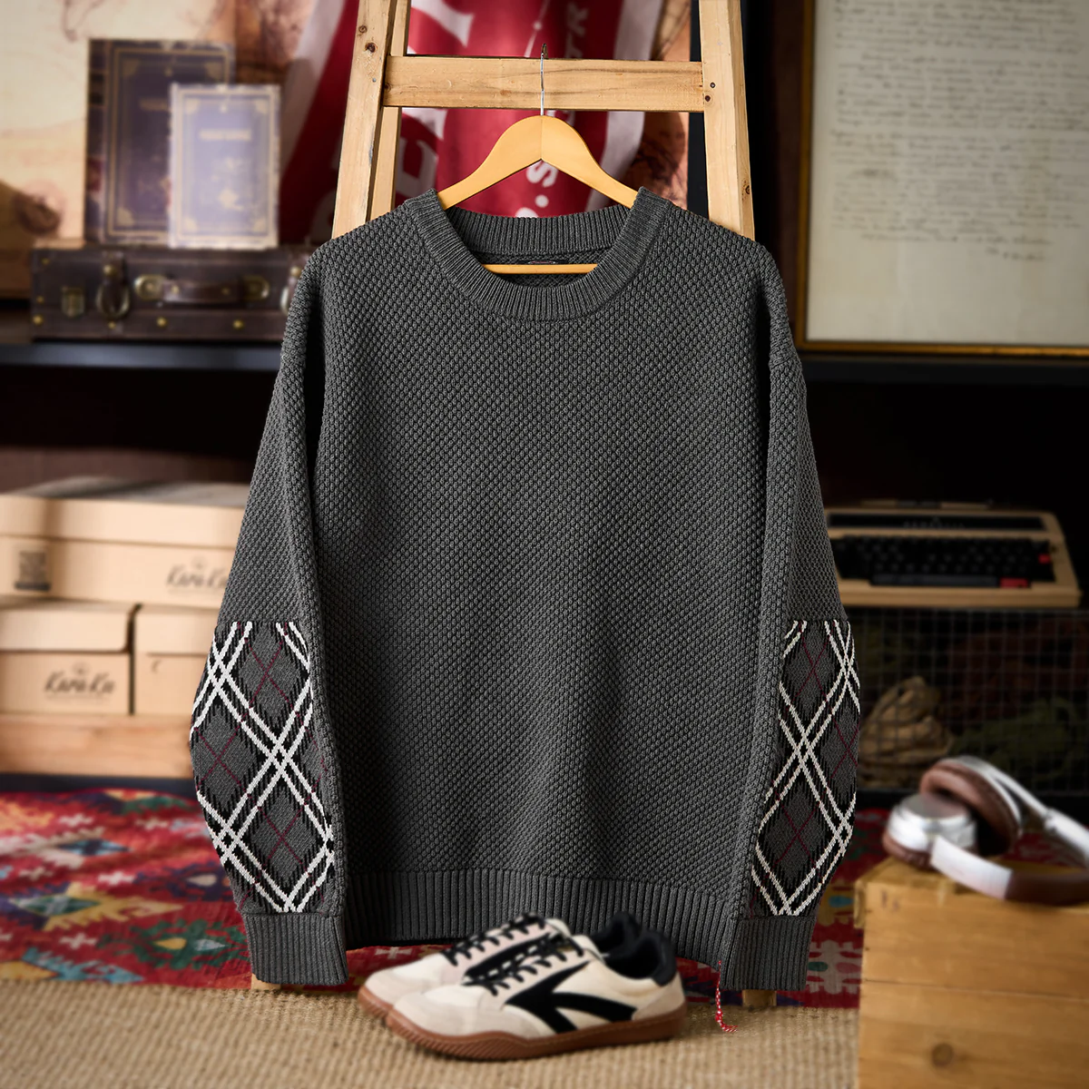 立体感のある“パイナップル織り”をベースに、肘部分へアーガイルチェックのジャカード織りを切り替えた、表情豊かなニットセーター。凹凸のある編み地が生み出す陰影と、クラシックなアーガイル柄のアクセントが絶妙に調和し、1枚でコーデの主役になるデザインです。裾にはデザインのワンポイントとなる“赤い紐”を配置。さりげない遊び心が、スタイリングに個性を添えます。適度な厚みとふんわりした着心地で、秋冬のデイリー使いにぴったり。リラックス感のあるシルエットながら、編み柄の奥行きによって品よくまとめられ、カジュアルからきれいめまで幅広いスタイルにマッチします。
