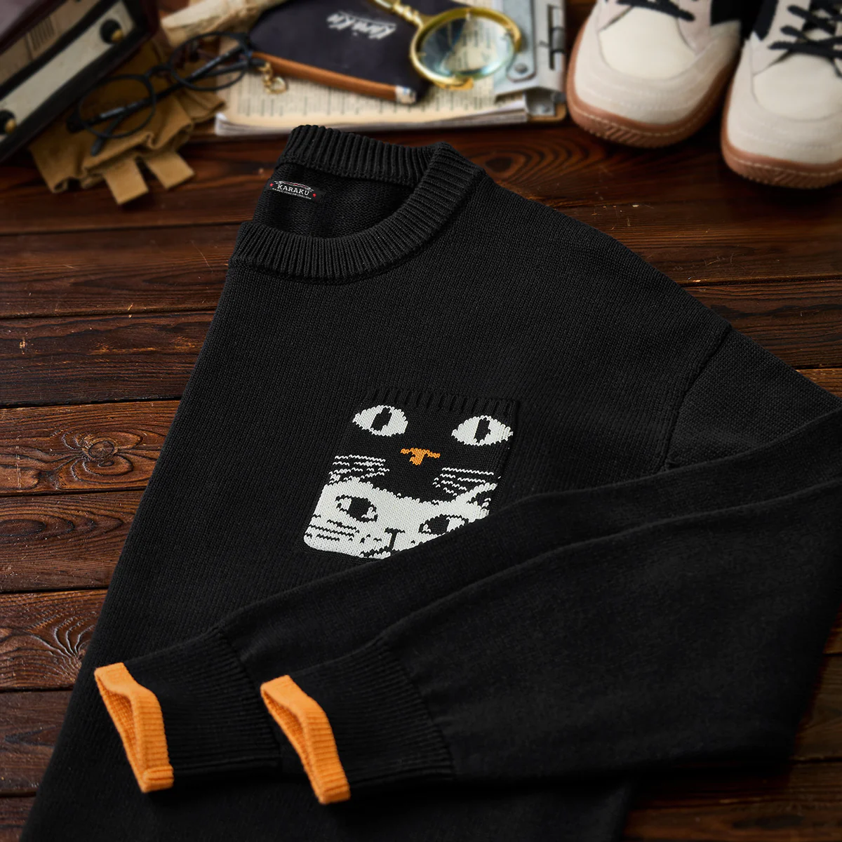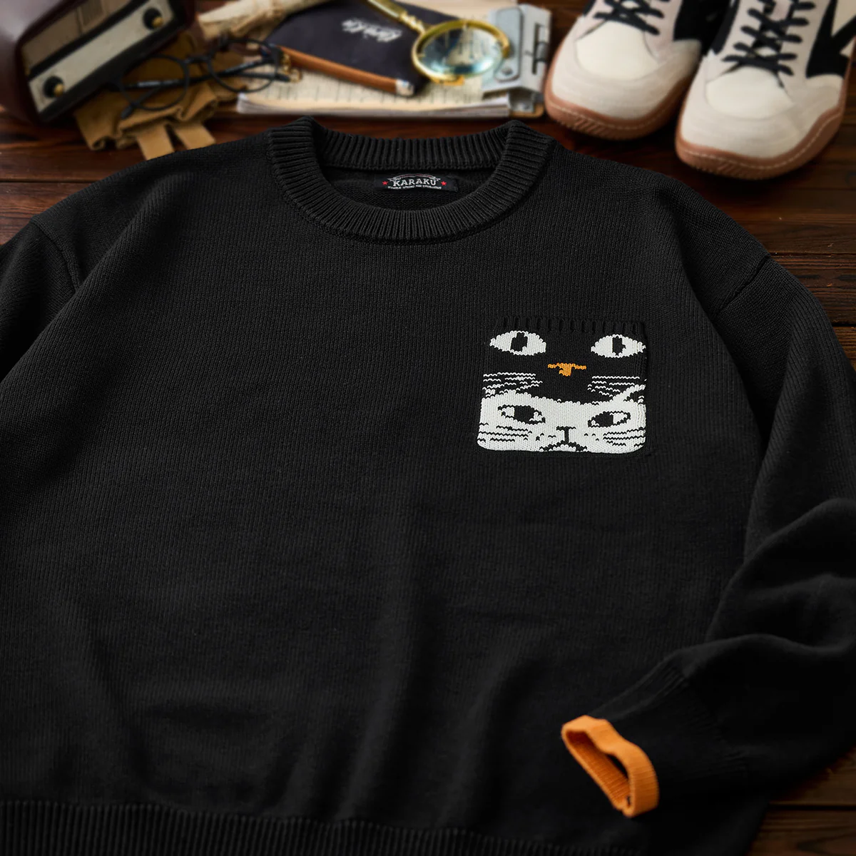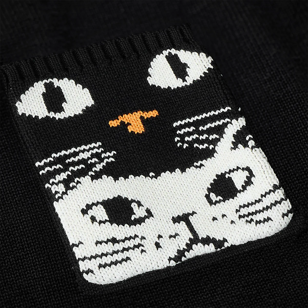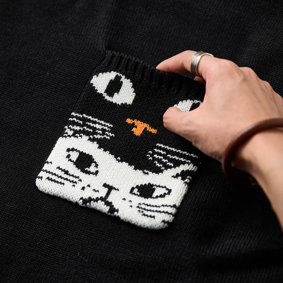 胸ポケット部分には猫の目や顔がジャガード織りで表現され、ユニークで目を引くデザインとなっています。シンプルな黒いセーターに対して、ポケット部分の猫のデザインが視覚的な焦点を作り、個性を強調しています。