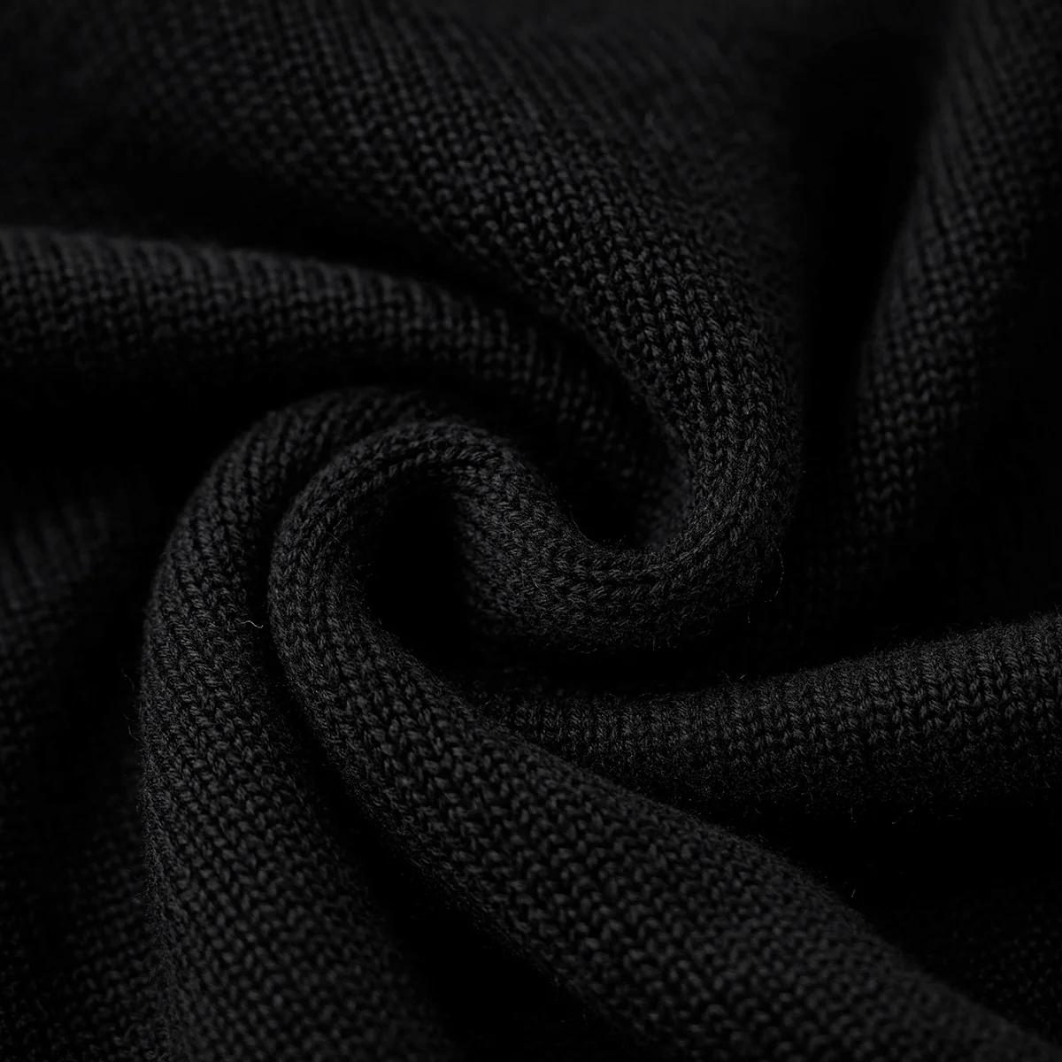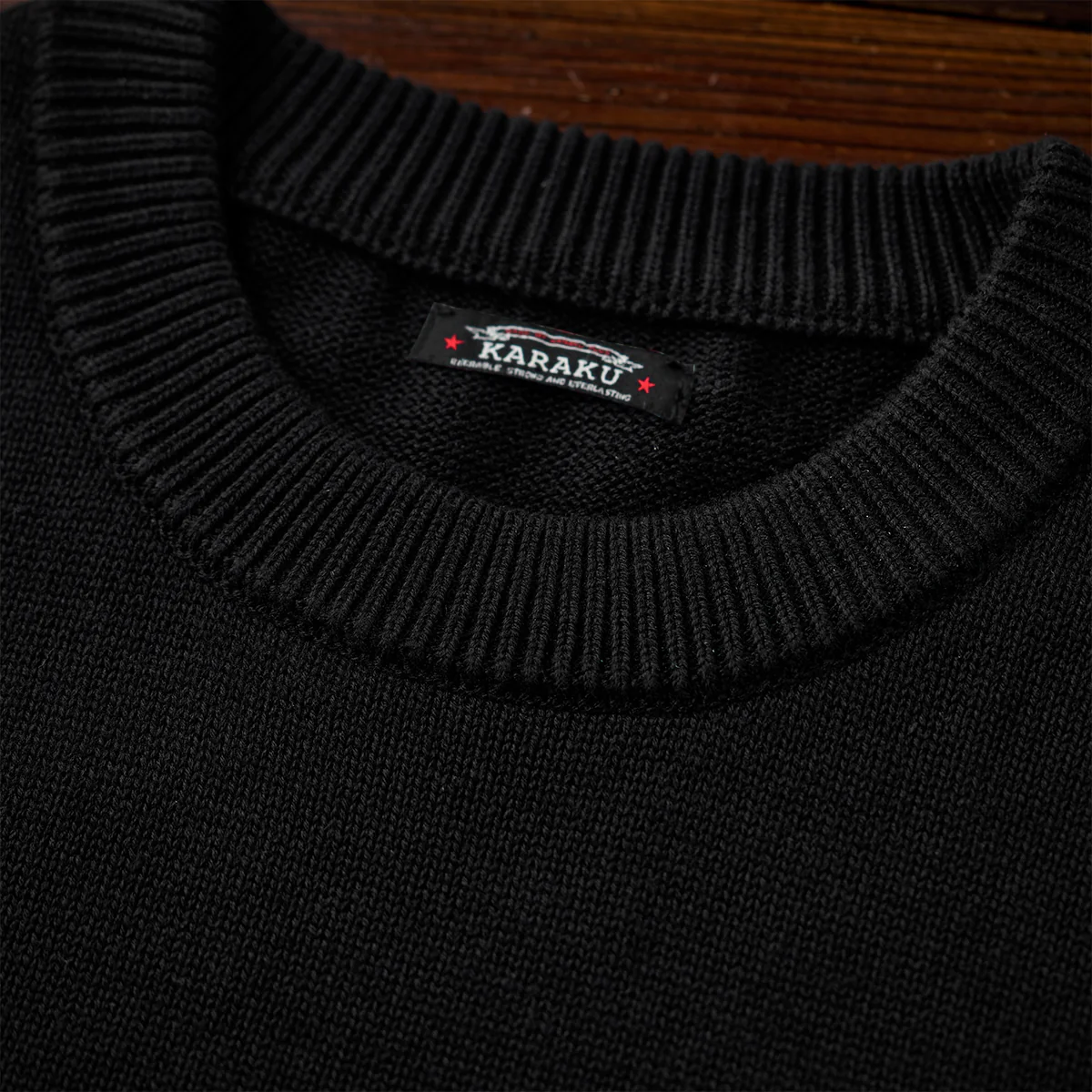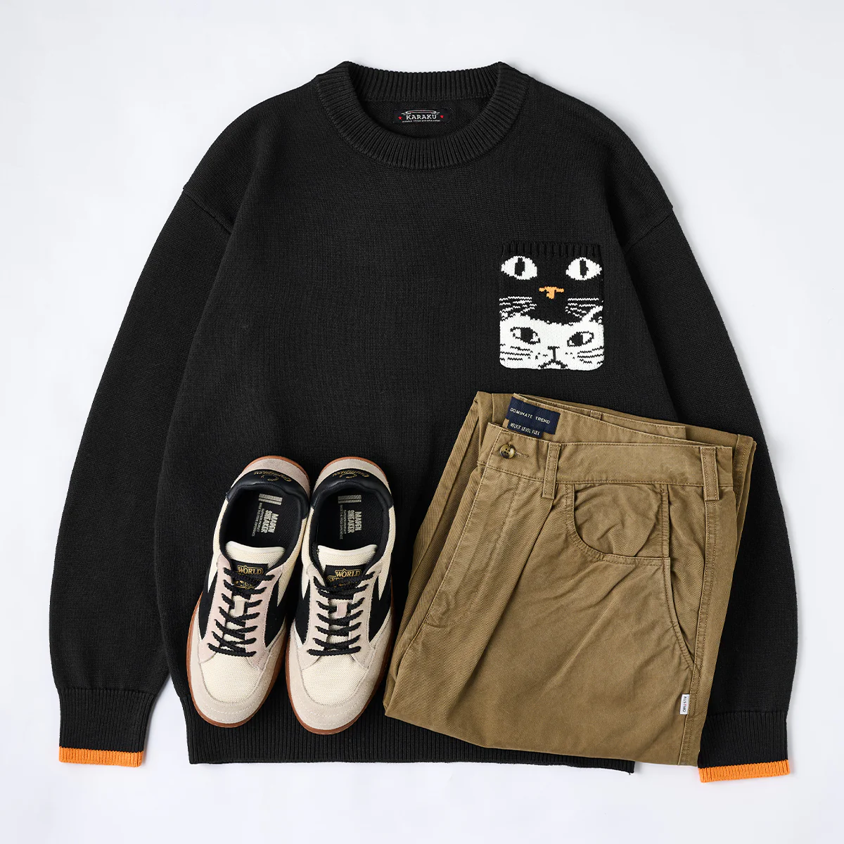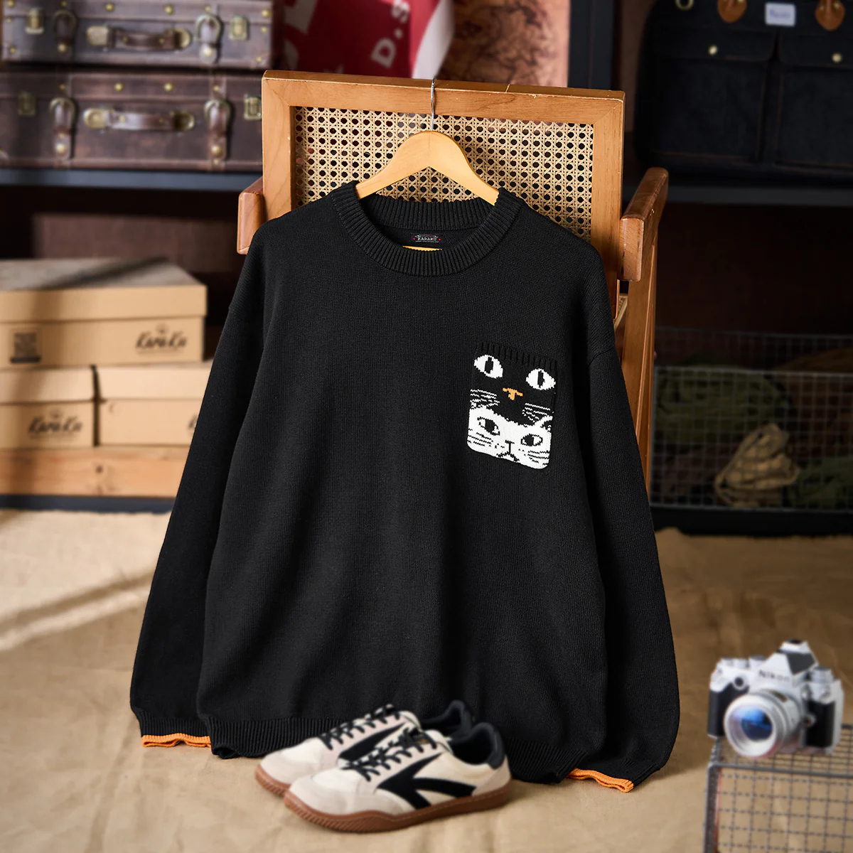 胸ポケット部分には猫の目や顔がジャガード織りで表現され、ユニークで目を引くデザインとなっています。シンプルな黒いセーターに対して、ポケット部分の猫のデザインが視覚的な焦点を作り、個性を強調しています。