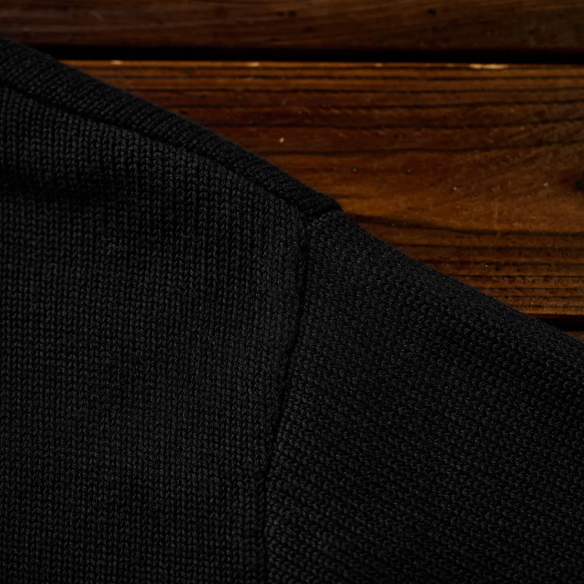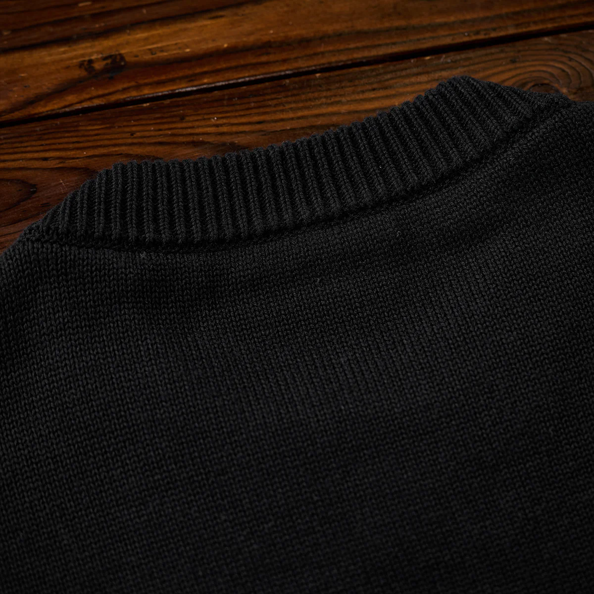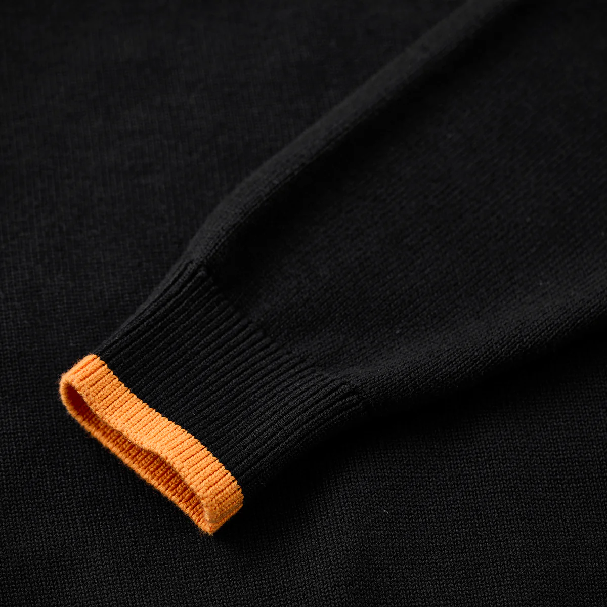 クルーネックのデザインで、カジュアルかつ着用時の快適さを意識した仕様です。リブ編みの首回りはシンプルながらも丈夫で、長期間の使用に耐えるよう配慮されています。袖口にオレンジ色の配色切り替えが施されており、全体の黒い配色と対照的で、さりげないアクセントになっています。