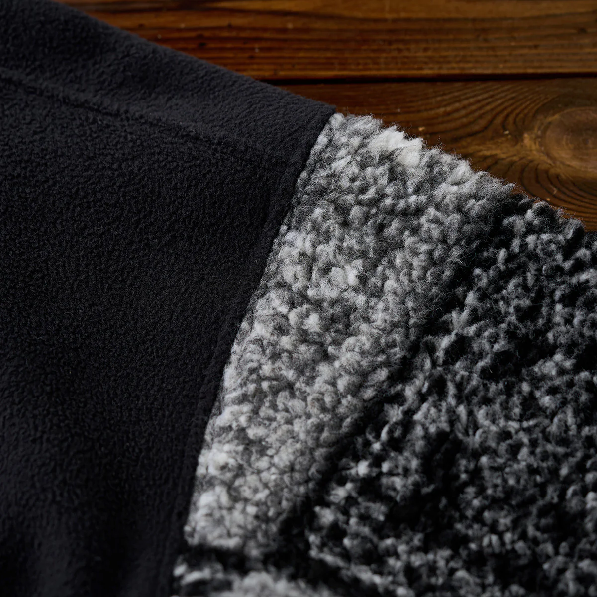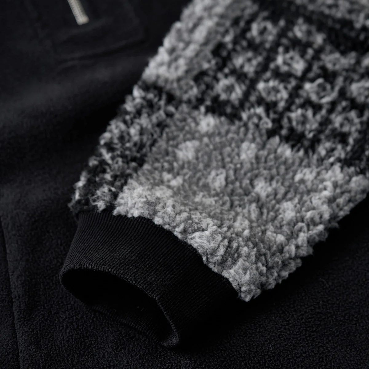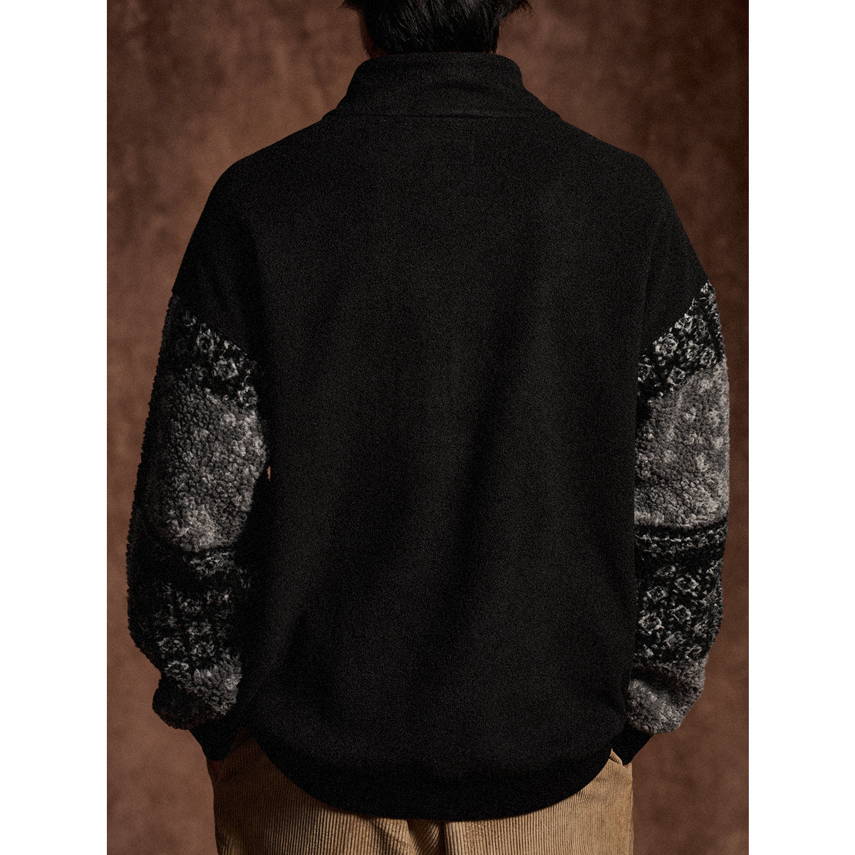 ボディ部分はフリース素材を使用して、保温性と軽量感が特徴。袖部分には白黒を基調としたペイズリー柄が施されて、ボア素材でデザインされています。この切替デザインにより、シンプルなフリースにアクセントが加えられています。
