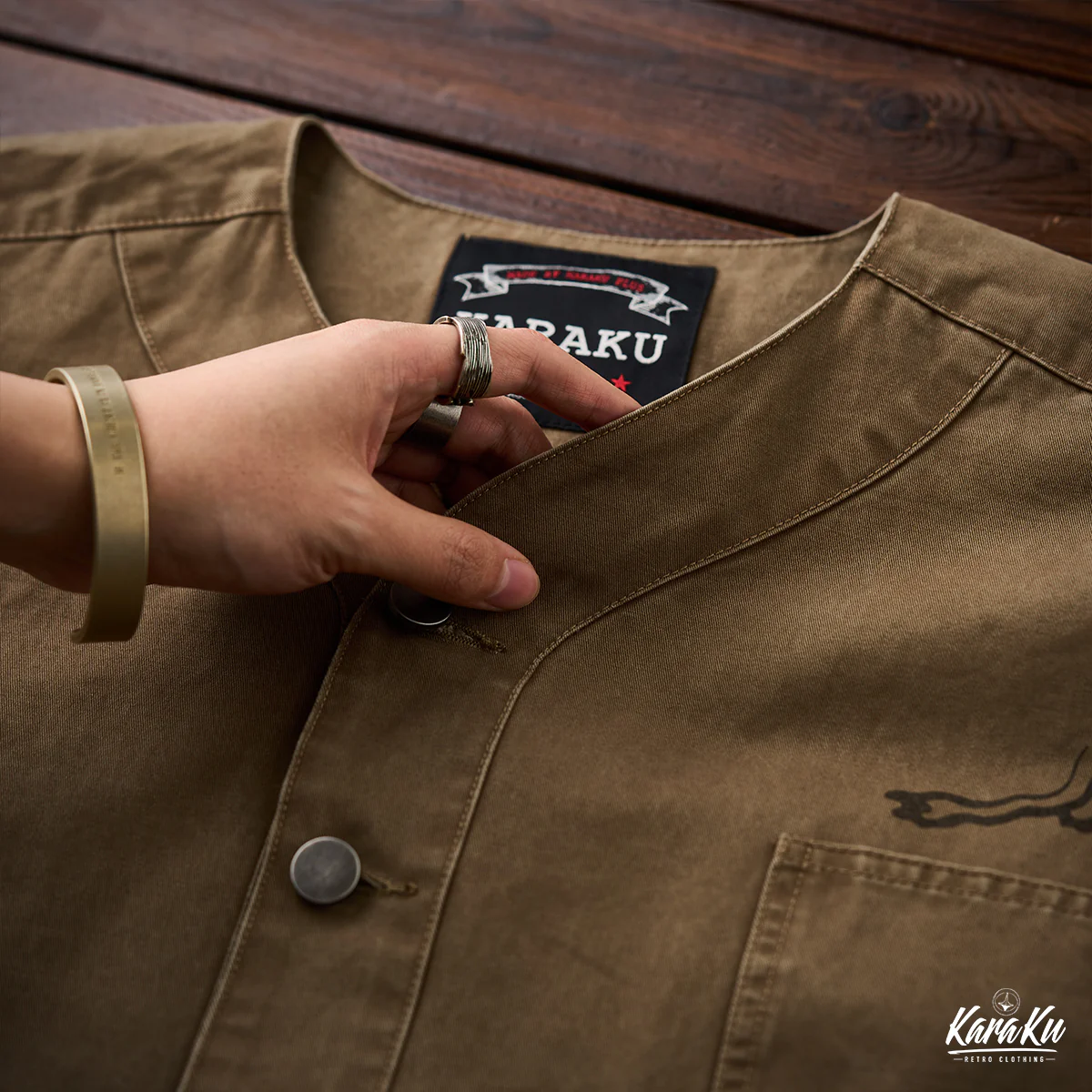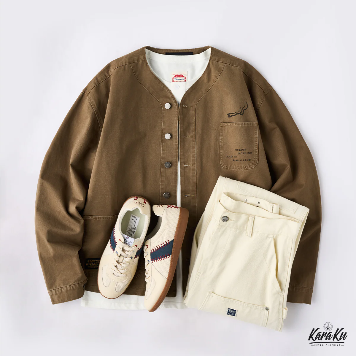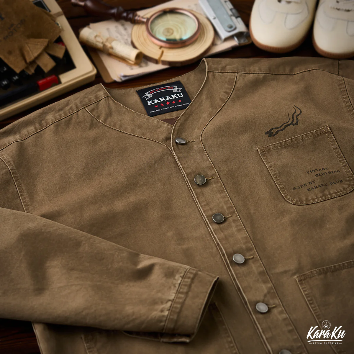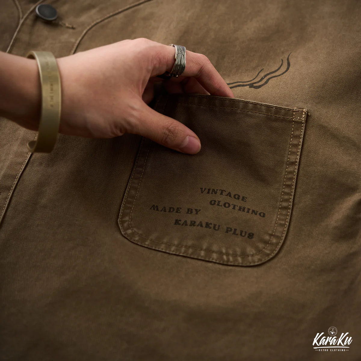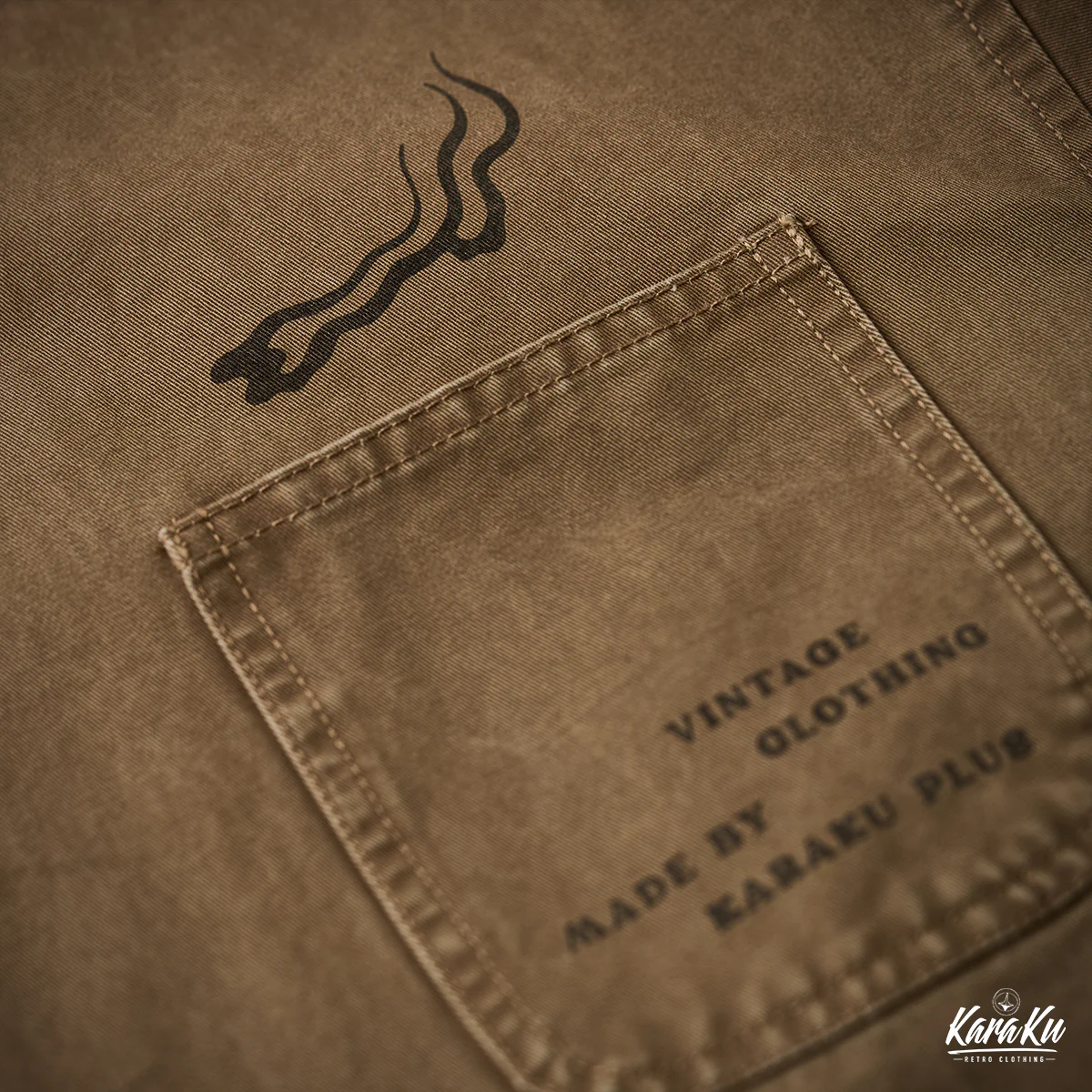 胸ポケットには「VINTAGE CLOTHING MADE BY KARAKU PLUS」というテキストがプリントされて、ブランドのコンセプトを表現している。