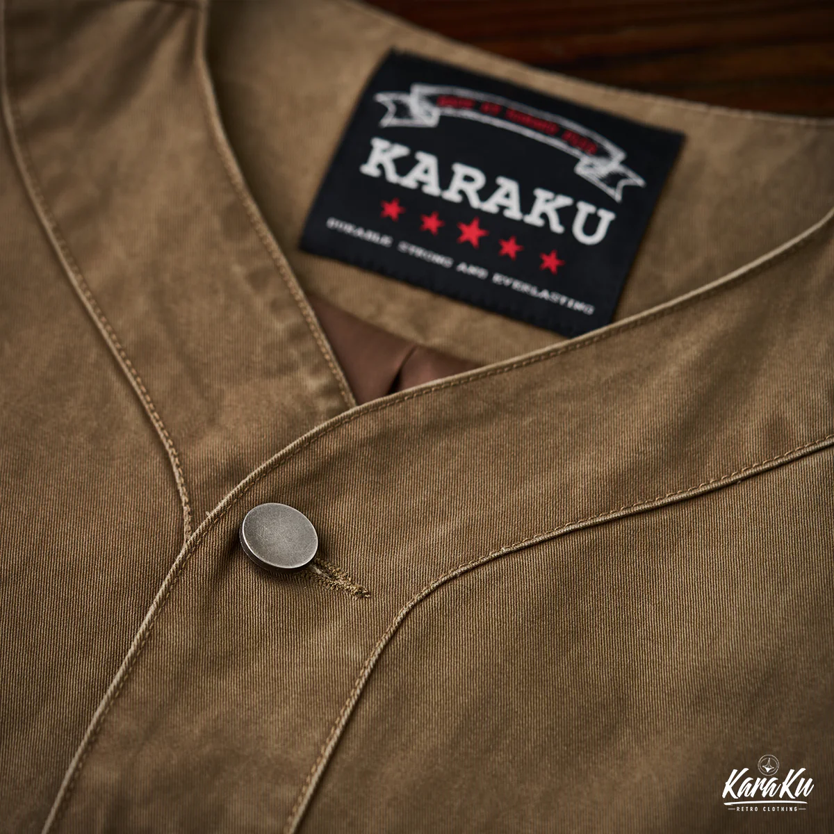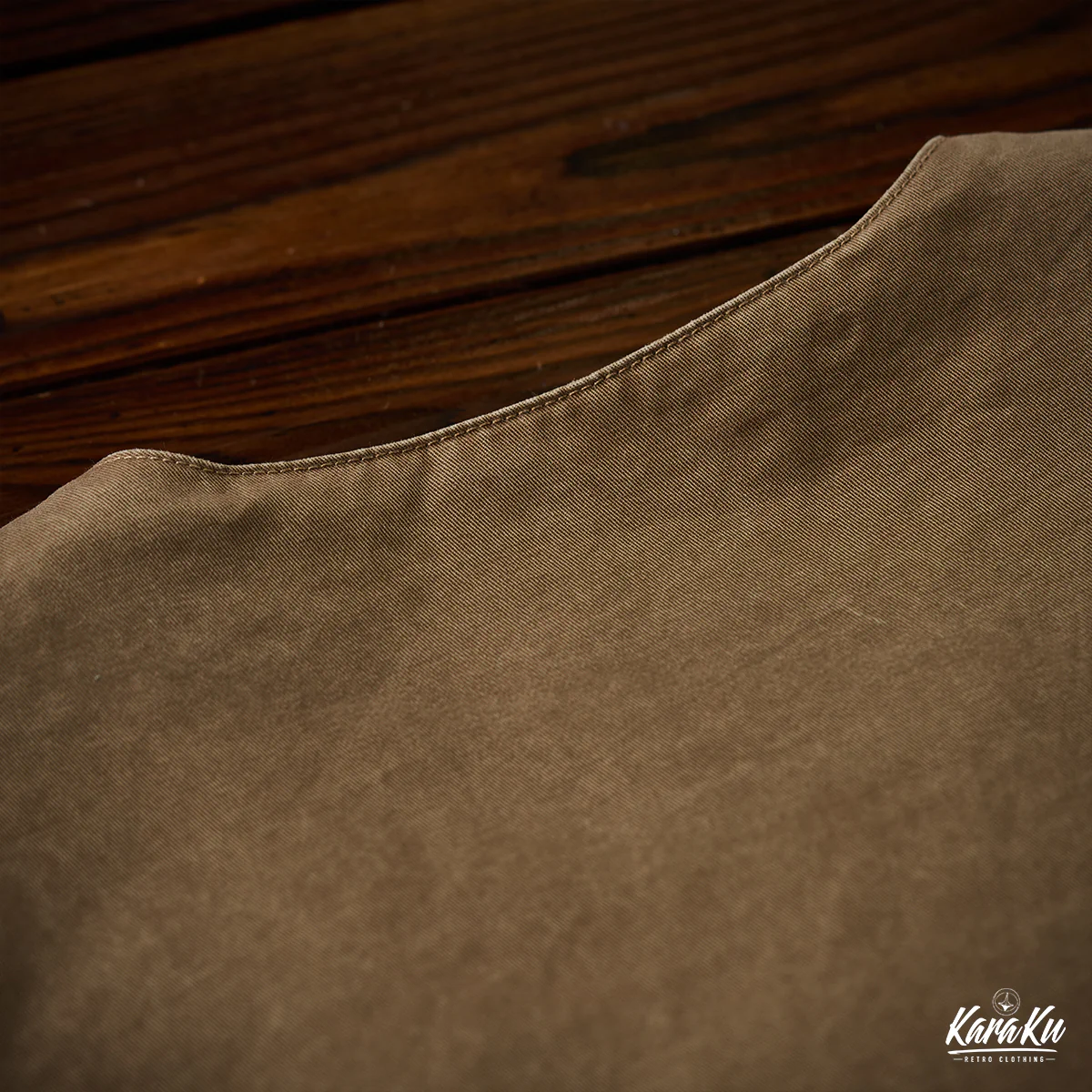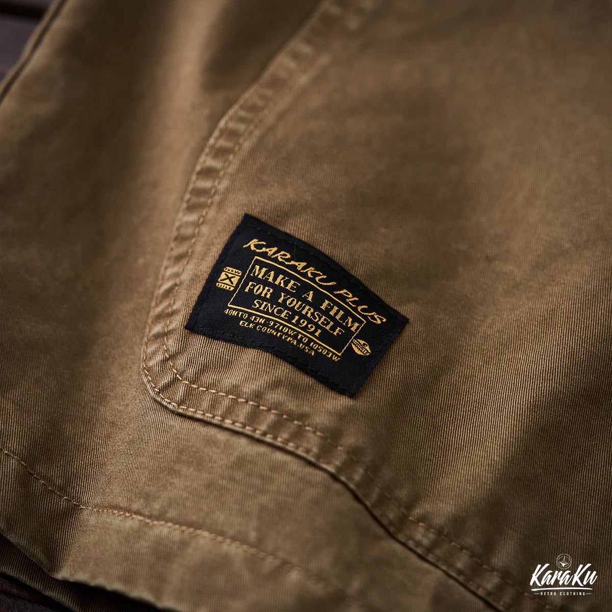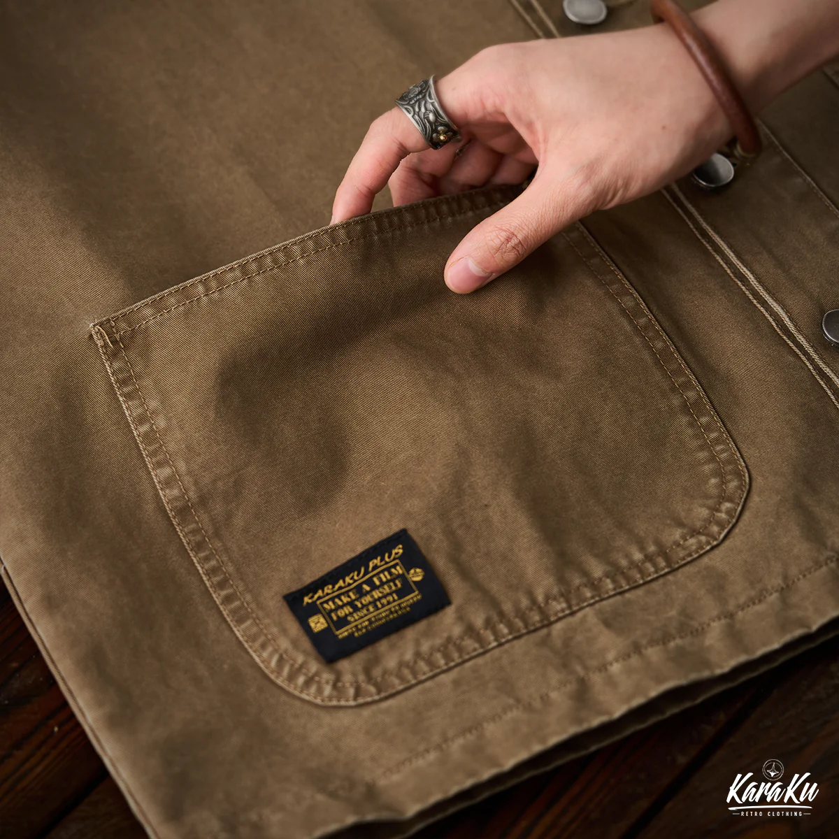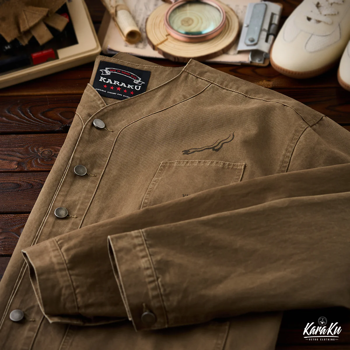 胸ポケットには「VINTAGE CLOTHING MADE BY KARAKU PLUS」というテキストがプリントされて、ブランドのコンセプトを表現している。