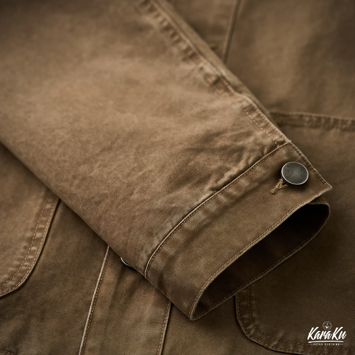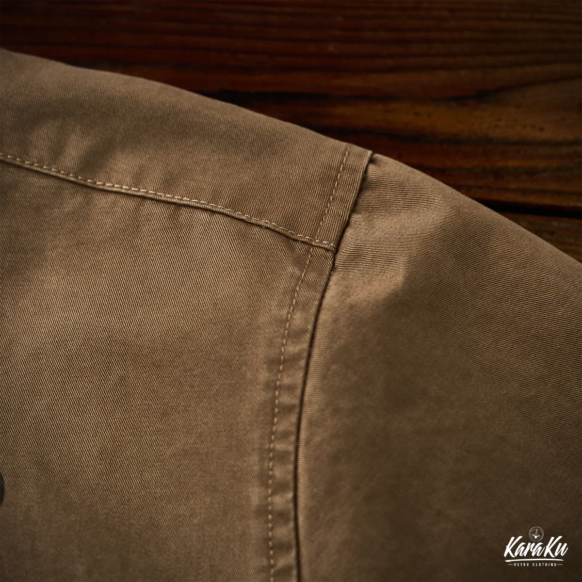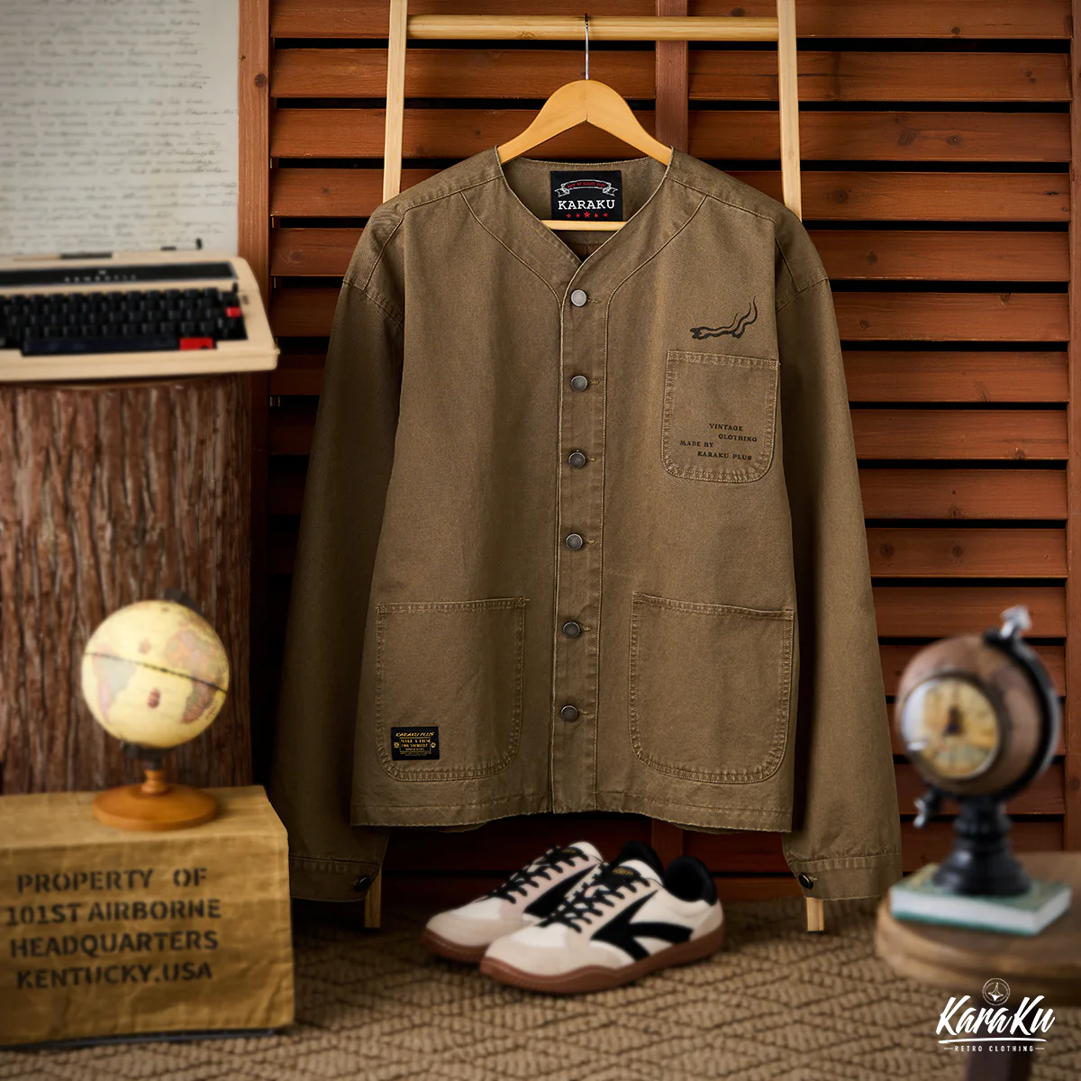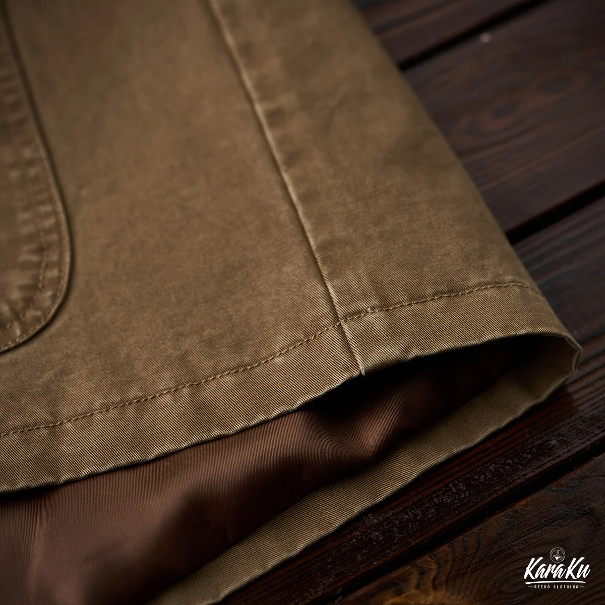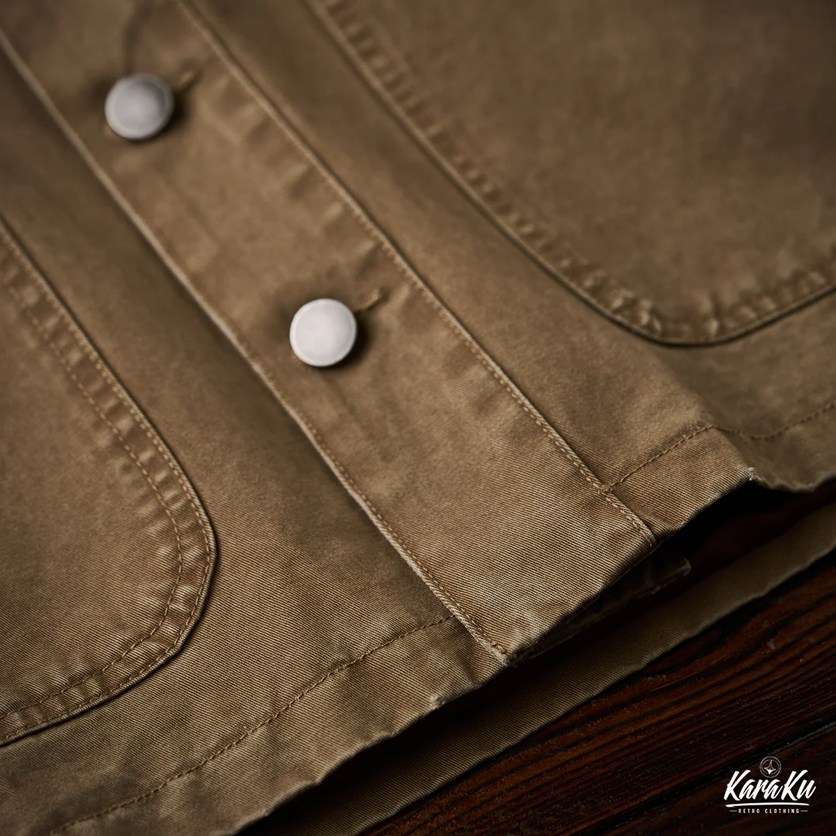 胸ポケットには「VINTAGE CLOTHING MADE BY KARAKU PLUS」というテキストがプリントされて、ブランドのコンセプトを表現している。