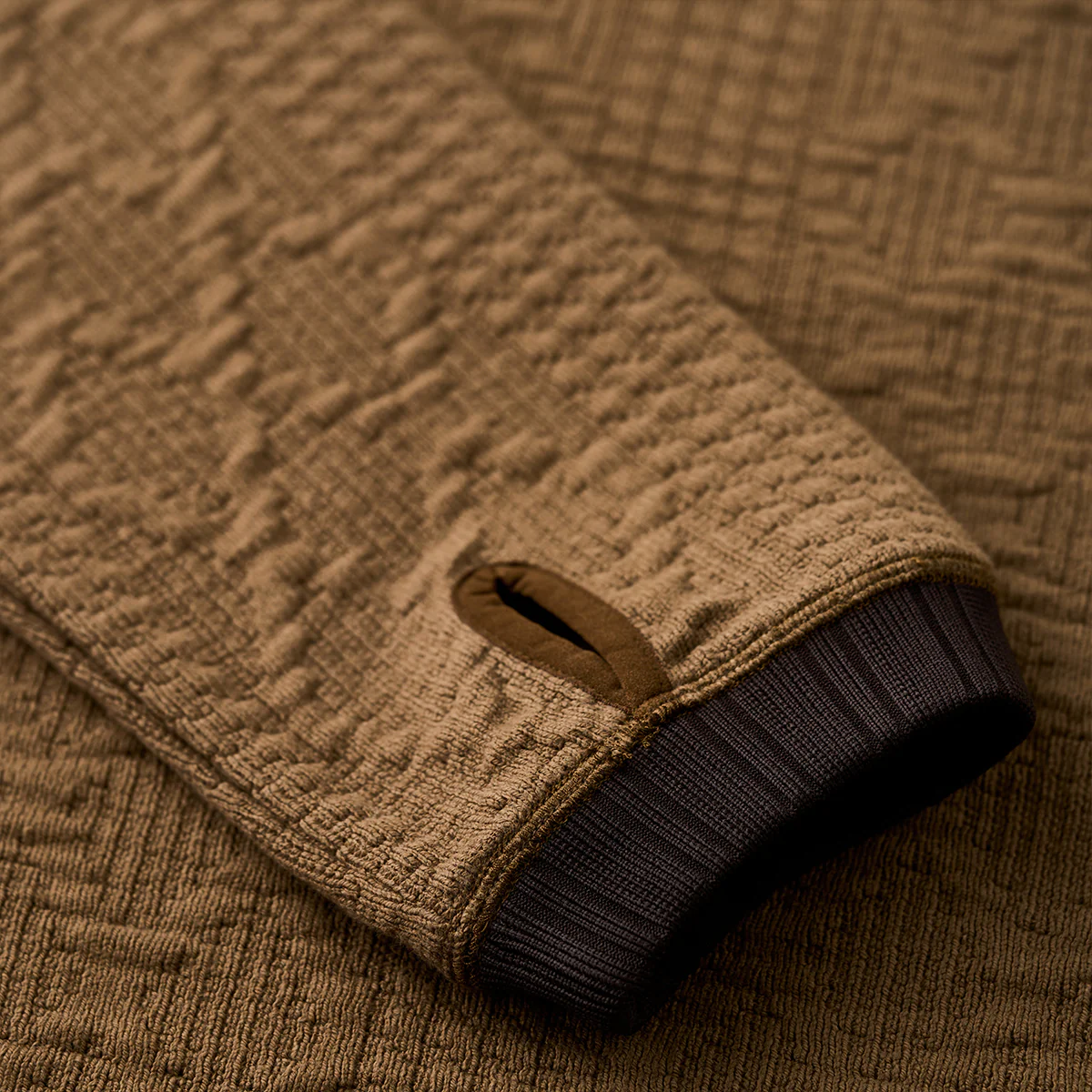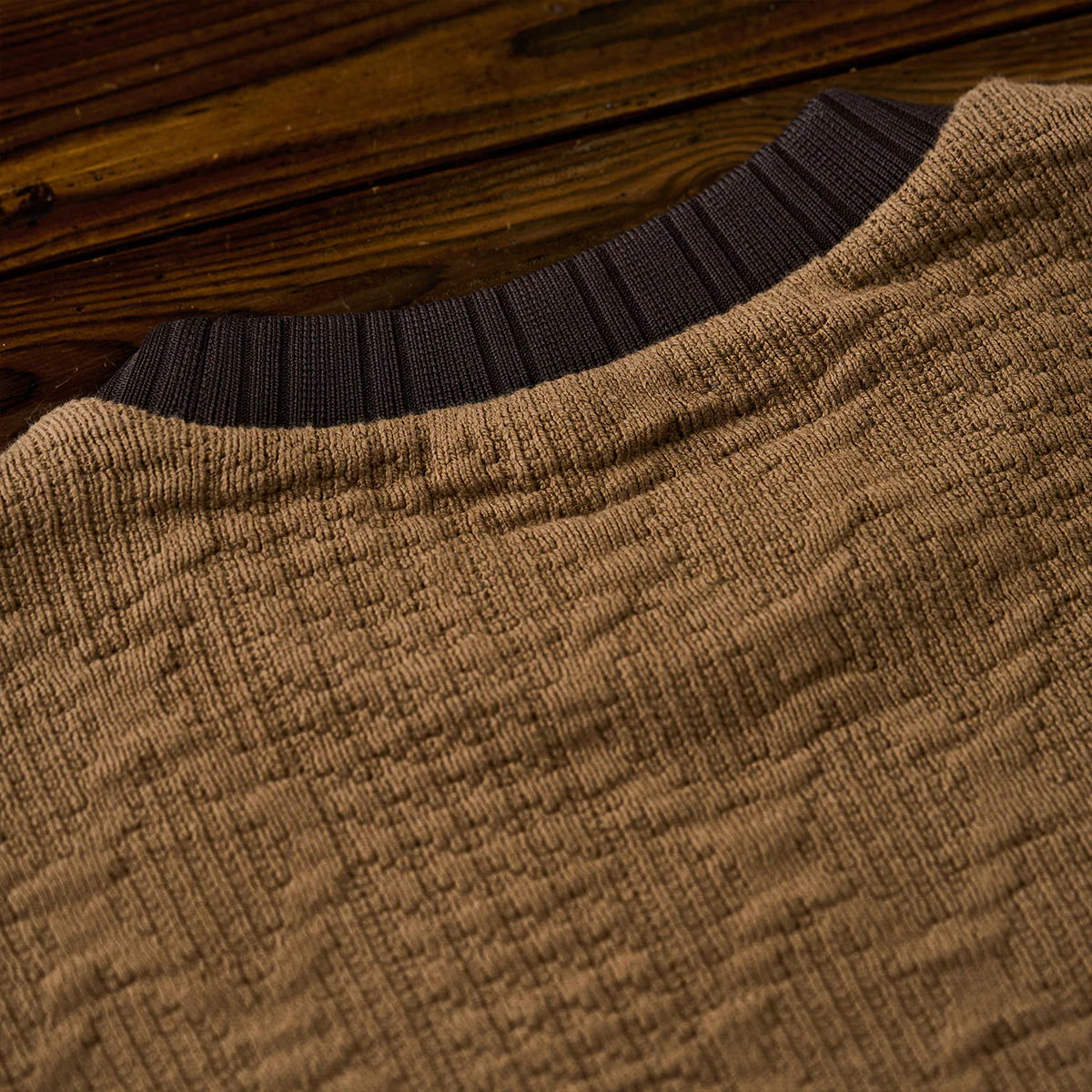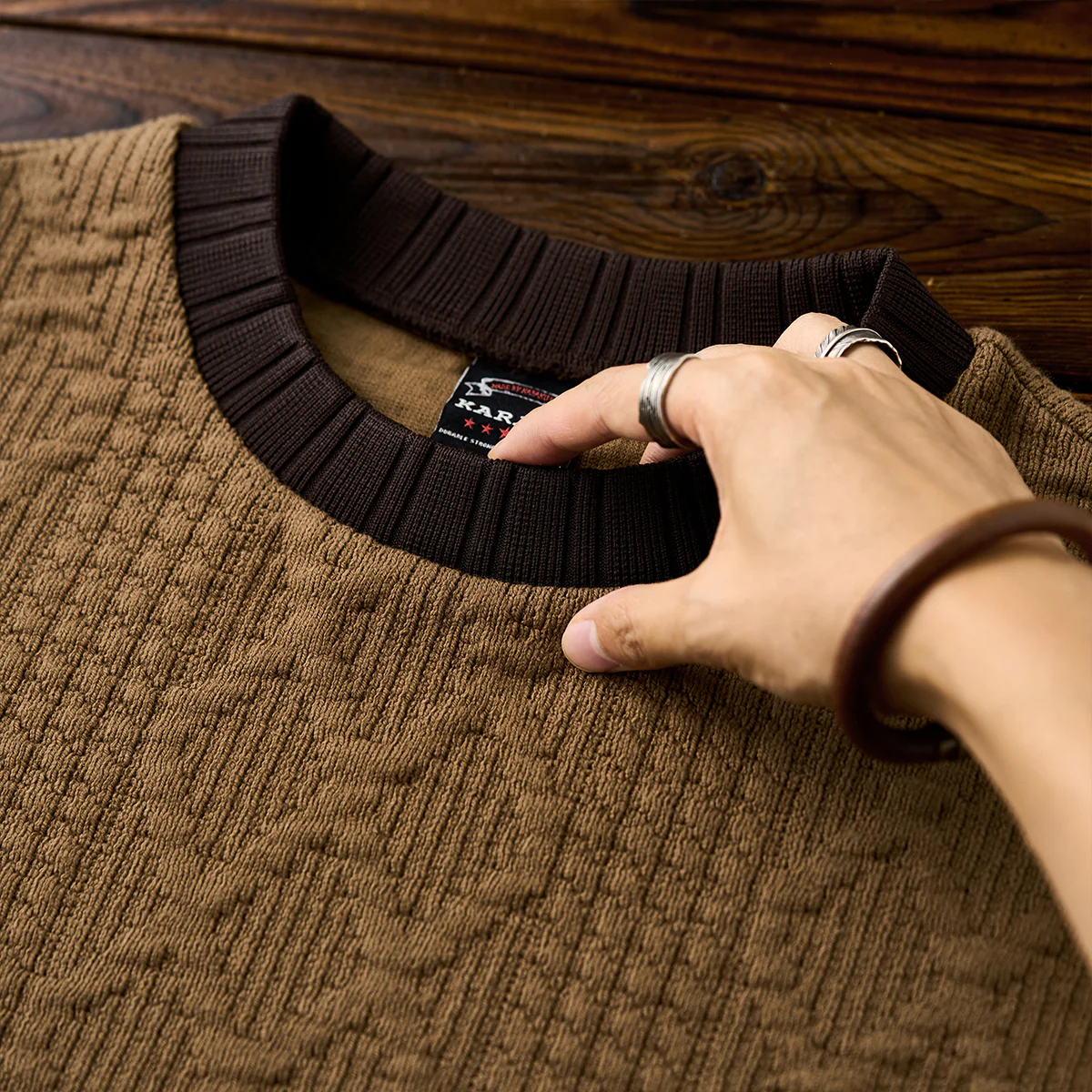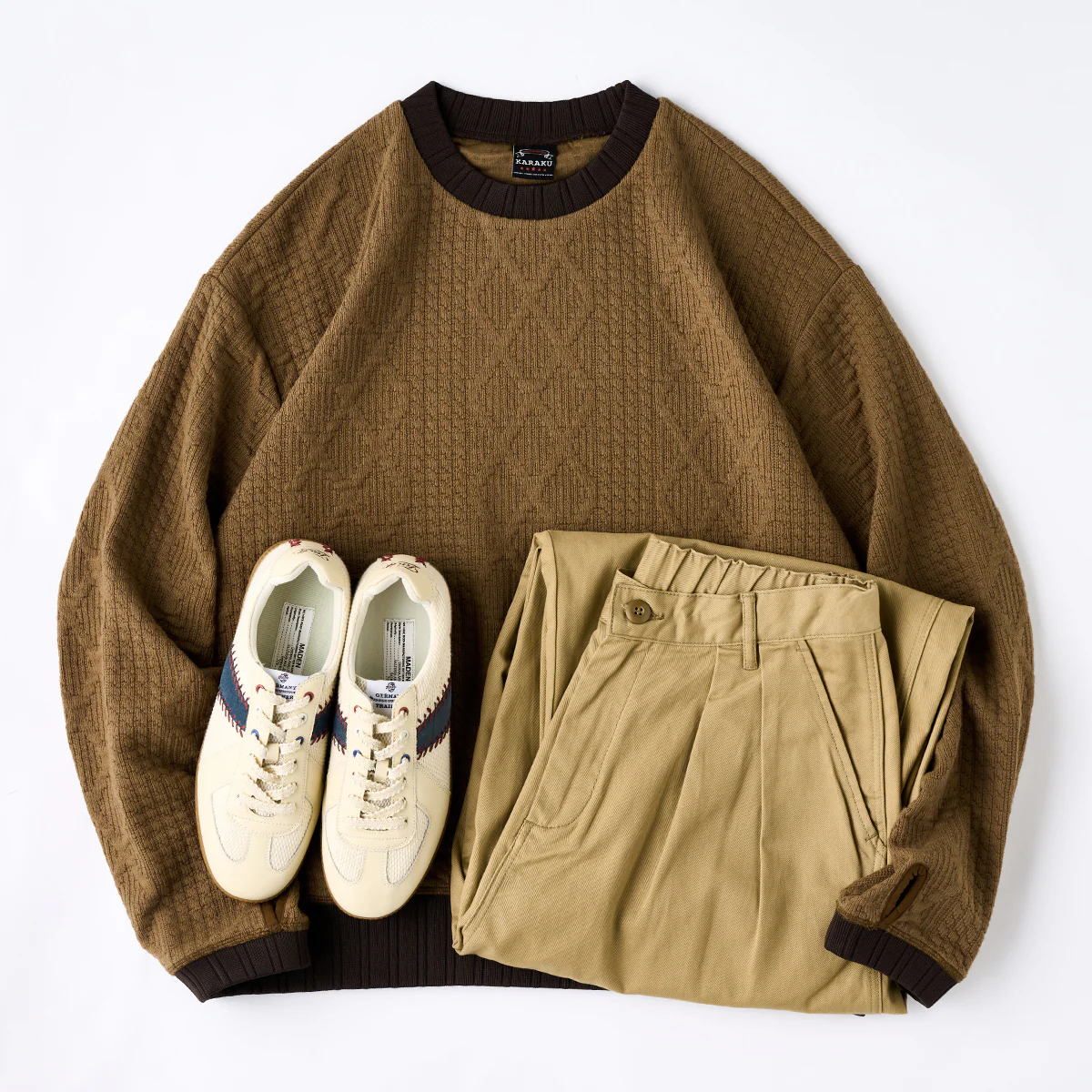 ケーブル編みニットを思わせる立体感のある編地を、スウェット素材で表現した一着。柔らかな着心地と扱いやすさを兼ね備え、デイリーに取り入れやすいデザインです。襟や裾に施した配色切替がアクセントとなり、シンプルながらもスタイリングに変化を加えてくれます。袖先にはサムホールを備え、アウトドアやアクティブなシーンにも快適に対応。ニットライクな表情とスウェットならではの実用性を融合させた、秋冬シーズンに活躍する万能スウェットです。